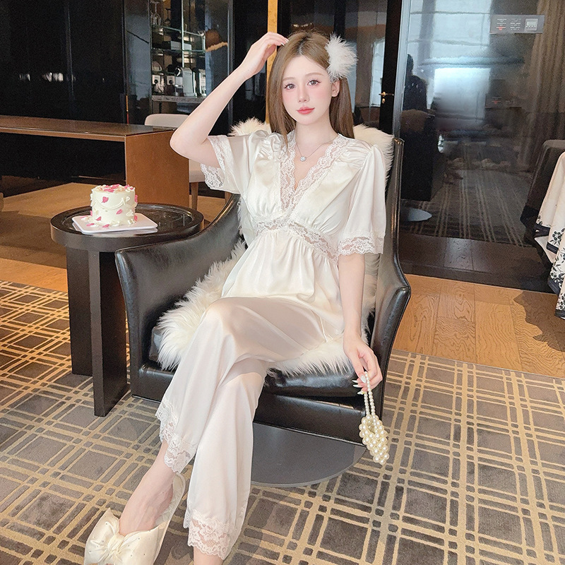 여성을위한 잠옷 여름 새로운 얼음과 눈 리본 가슴 패드 여성 반팔 바지 레이스 공주 스타일 달콤한 섹시한 홈웨어스토어 가기