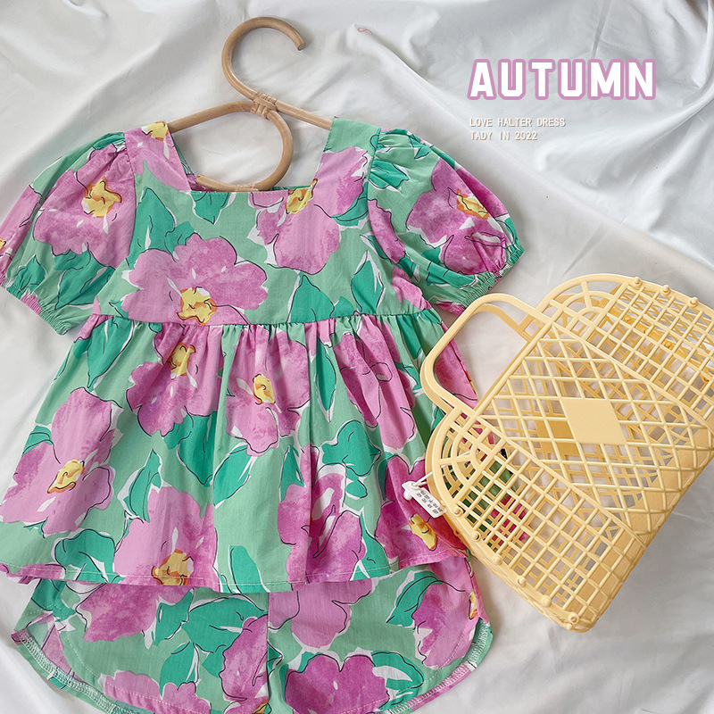 MDD 아동복 소녀 한국 달콤한 양복 2025 여름 신작 아동 퍼프 슬리브 탑 큰 꽃 반바지
