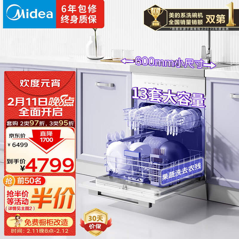 Midea [XH06P] 일체형 일체형 싱크대 식기세척기 13세트 용량 식기세척기 대형 싱글싱크 식기세척기