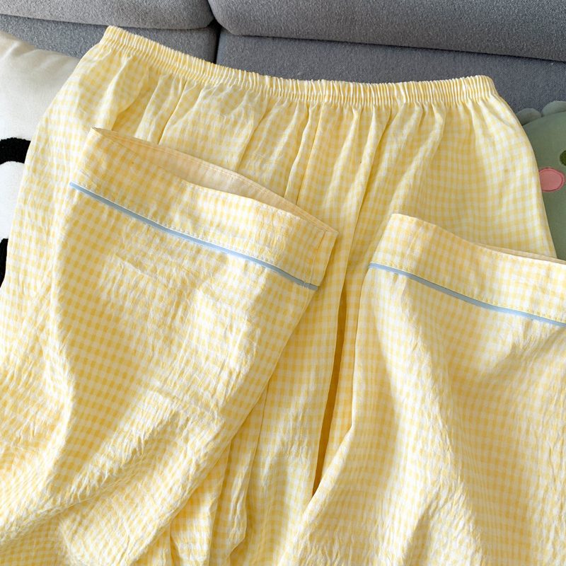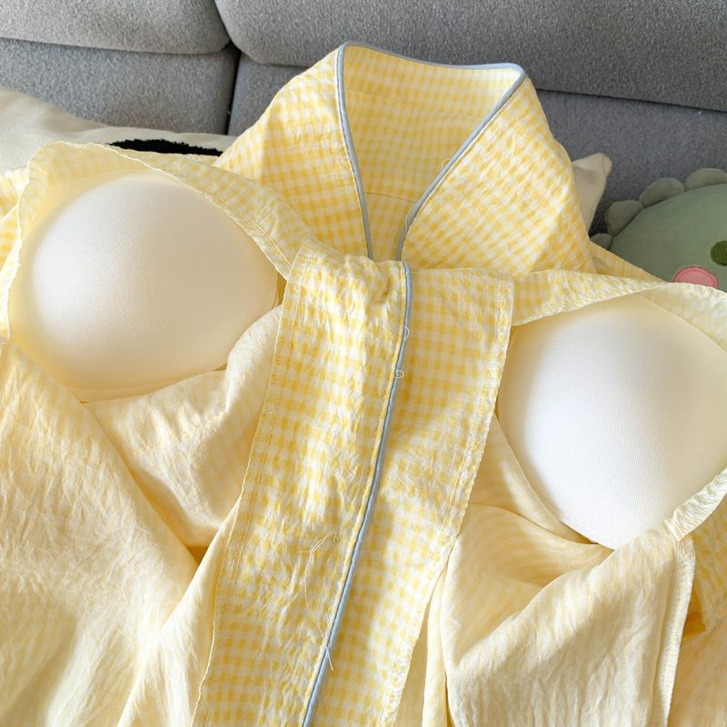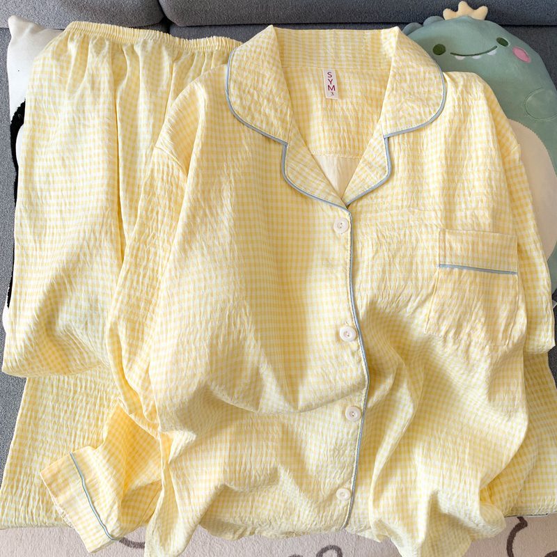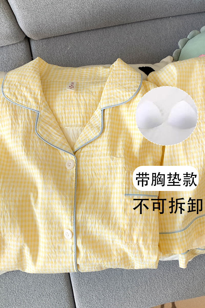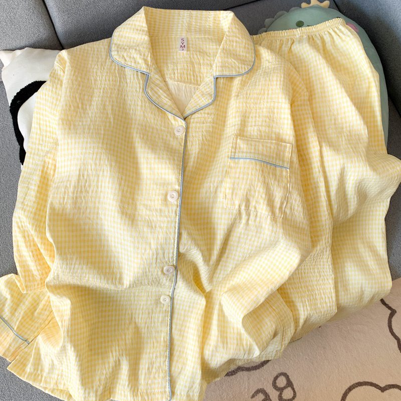 여성을위한 유두 패드가있는 Yunduo 순수 코튼 잠옷 봄, 가을 긴팔 바지 달콤한 노란색 격자 무늬 소녀 홈웨어 투피스 슈트스토어 가기