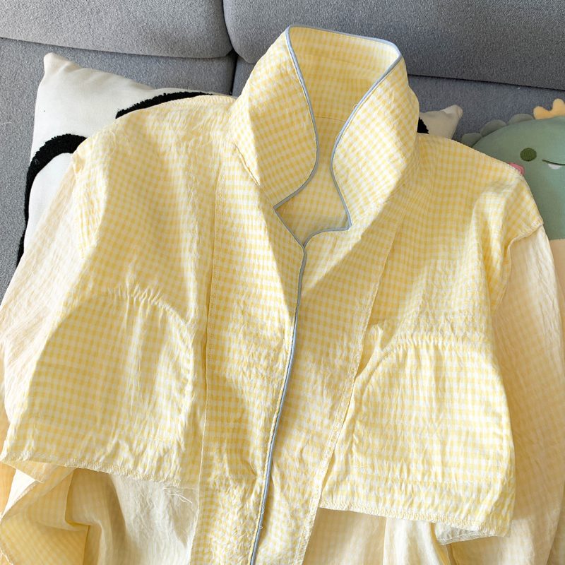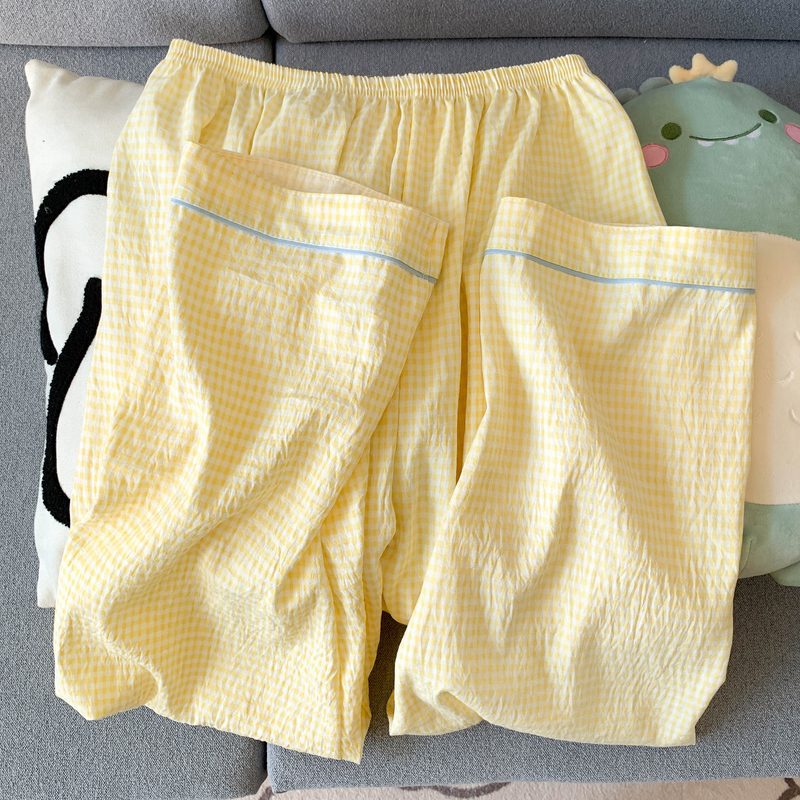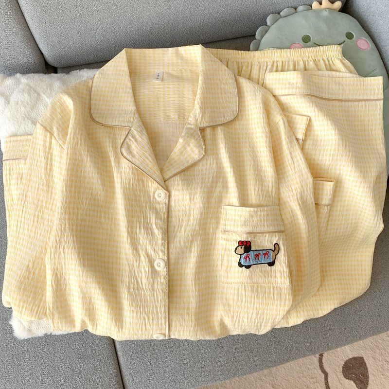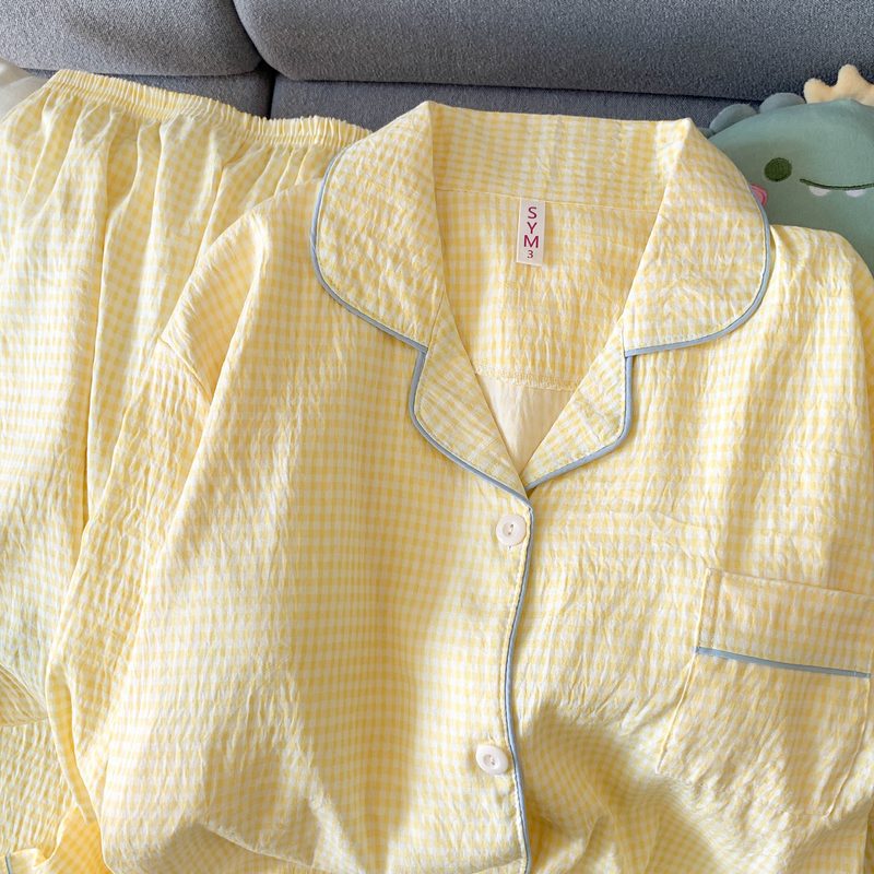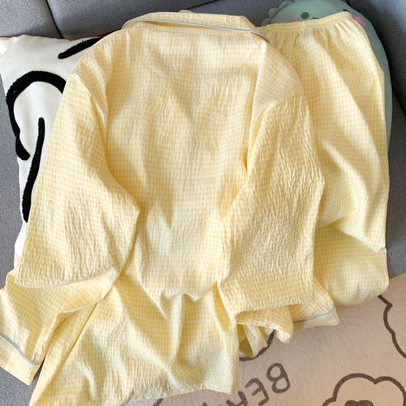 여성을위한 유두 패드가있는 Yunduo 순수 코튼 잠옷 봄, 가을 긴팔 바지 달콤한 노란색 격자 무늬 소녀 홈웨어 투피스 슈트스토어 가기