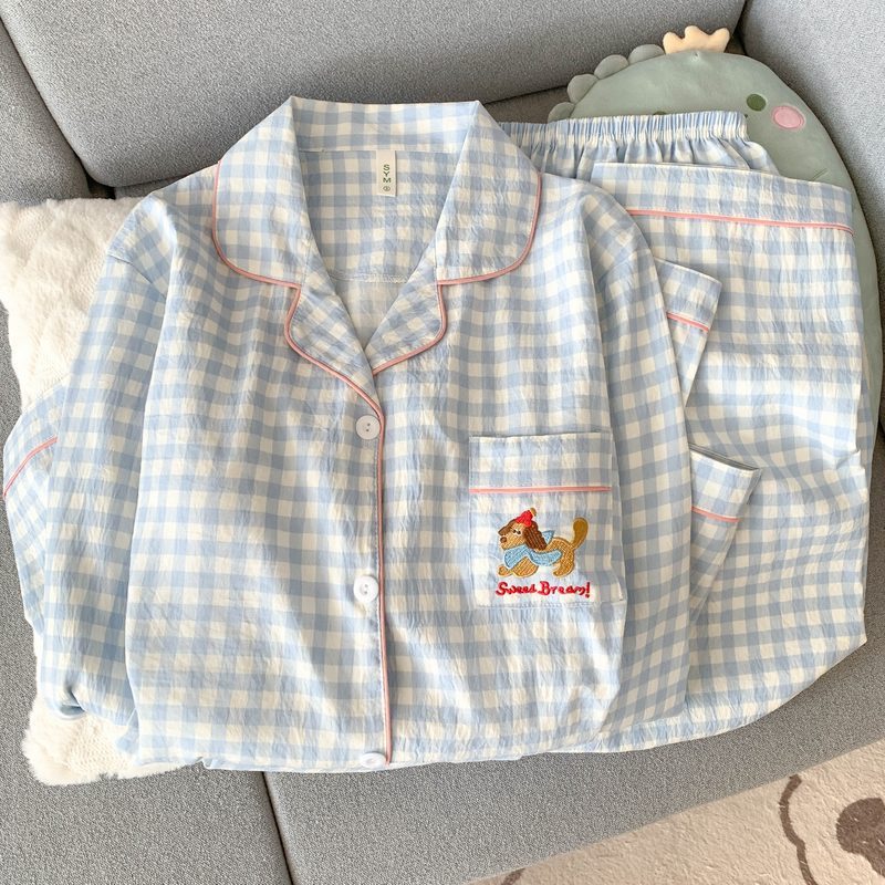 • (고정가슴패드) [윤두미안] 닥스훈트 블루체크 긴팔+바지