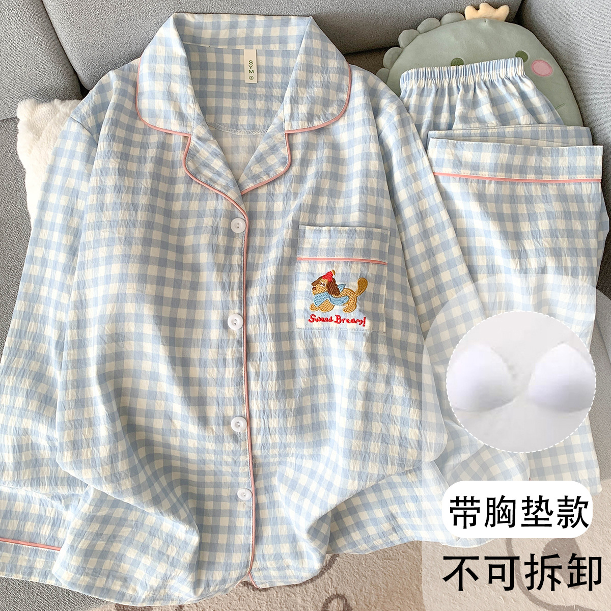 • (가슴패드 없음) [윤두면] 콩가루 체크 긴팔+바지