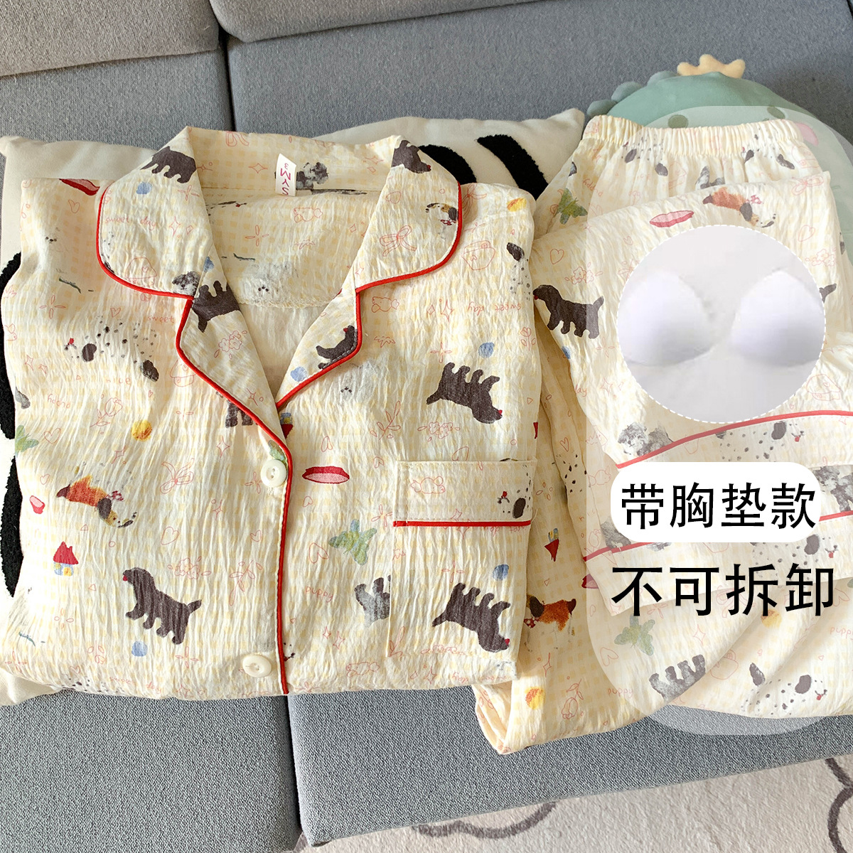 • (가슴패드 없음) [윤두면] 강아지 옐로 체크무늬 긴팔+바지