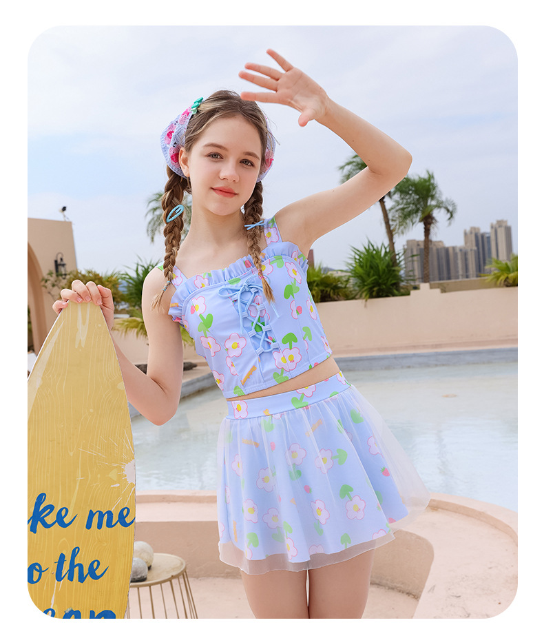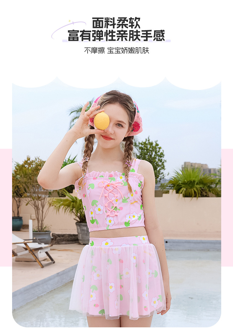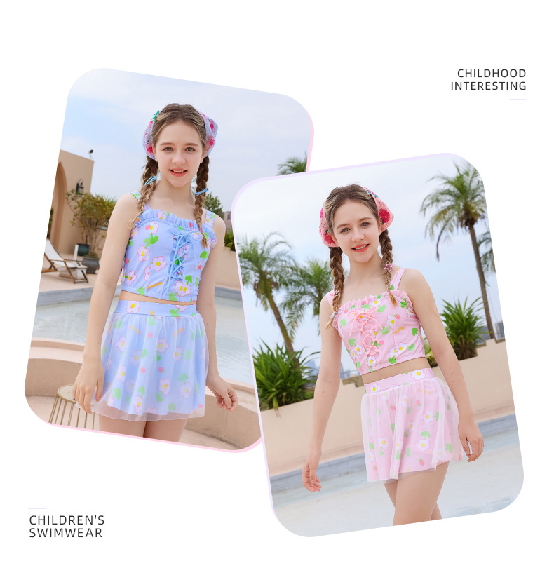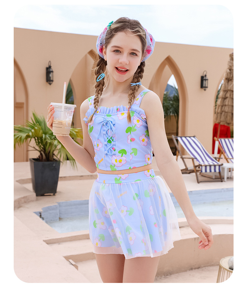여름 중대형 아동용 꽃무늬 스플릿 수영복 투피스 세트, 패셔너블하고 달콤한 소녀 온천 메쉬 서스펜더 보수적 수영복스토어 가기