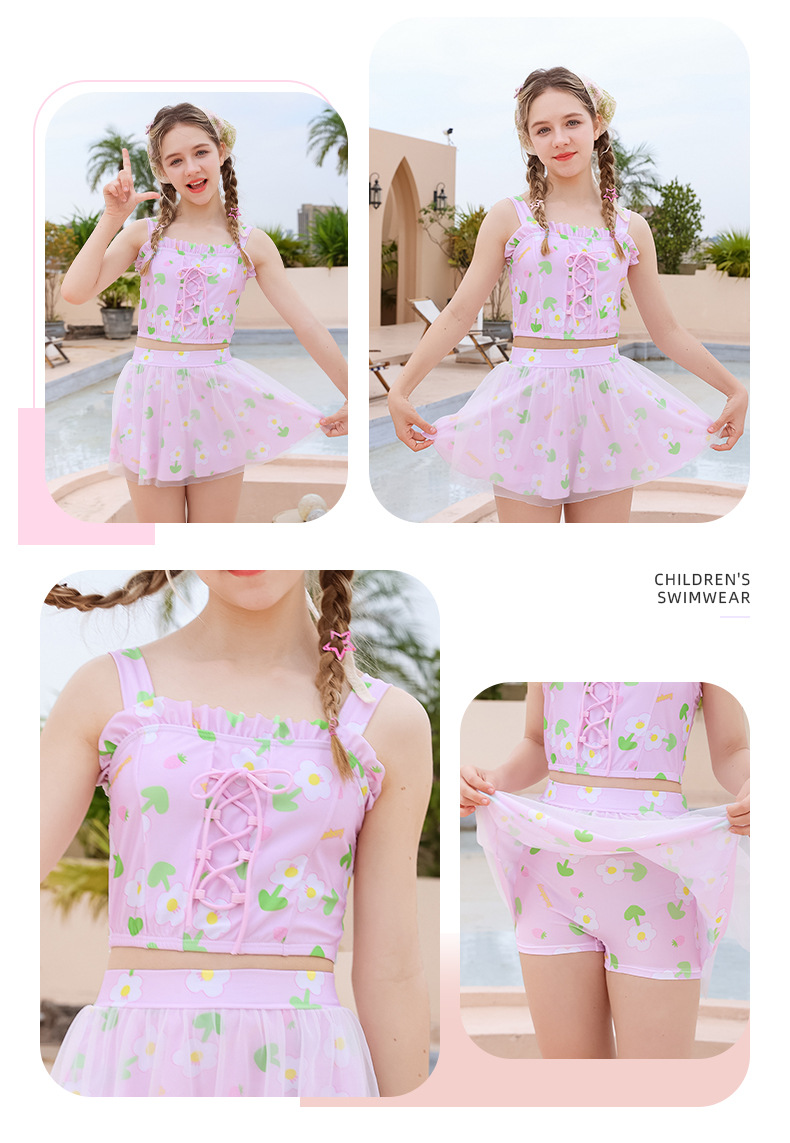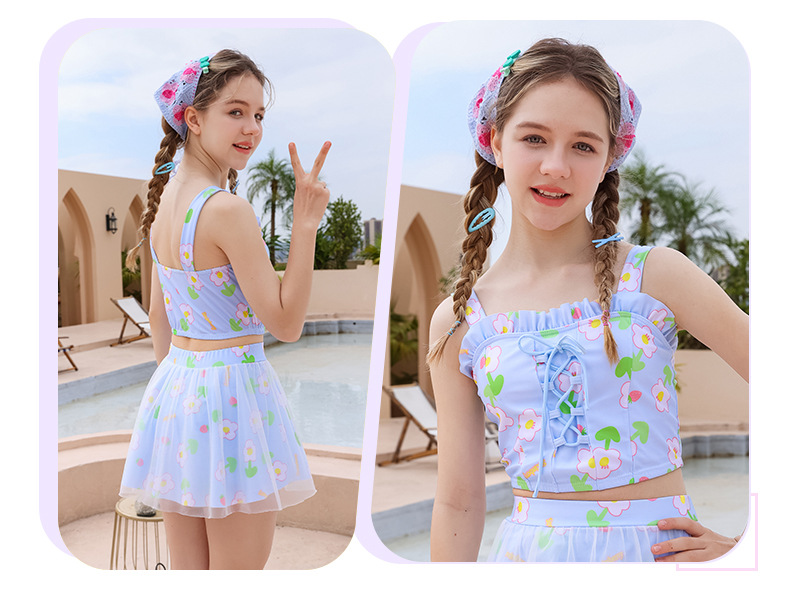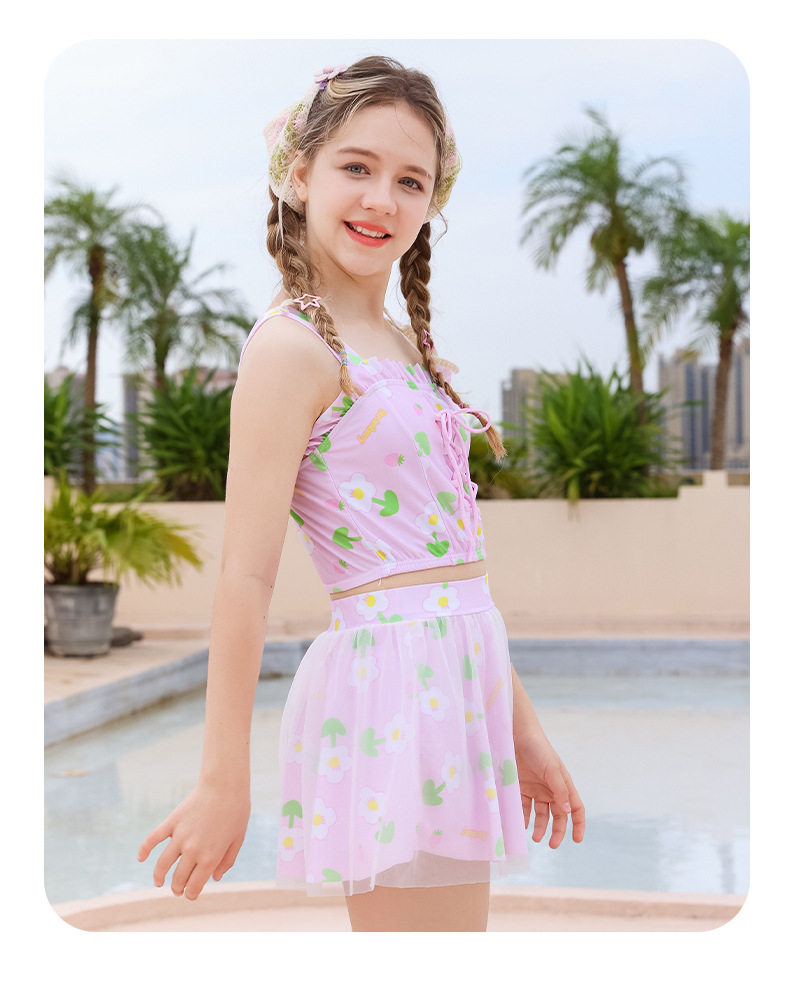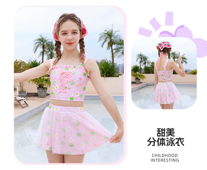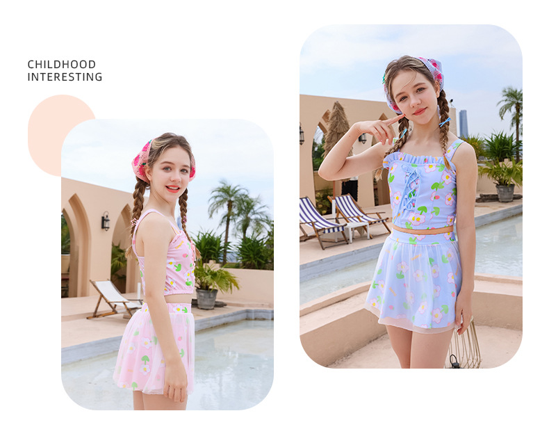 여름 중대형 아동용 꽃무늬 스플릿 수영복 투피스 세트, 패셔너블하고 달콤한 소녀 온천 메쉬 서스펜더 보수적 수영복스토어 가기