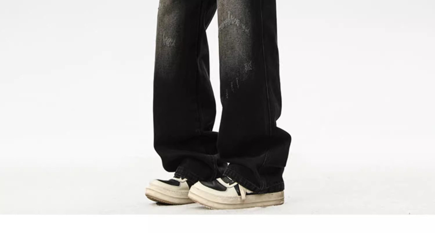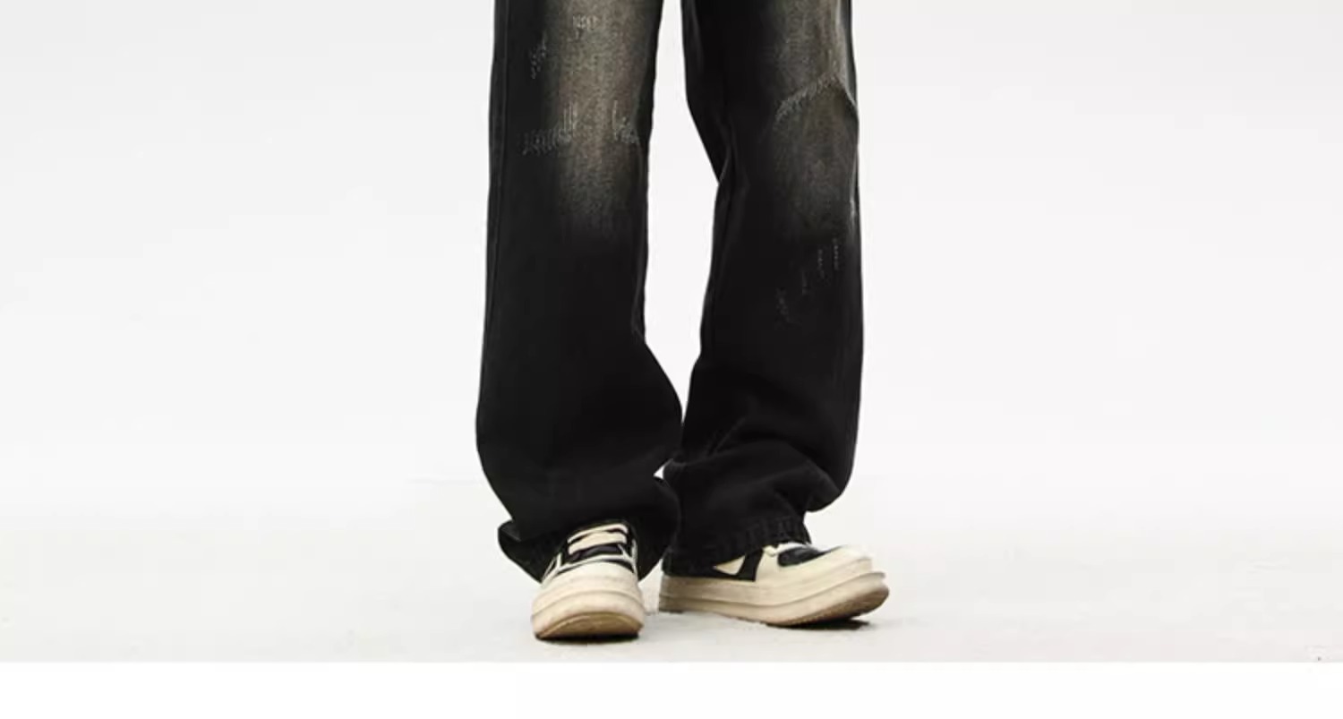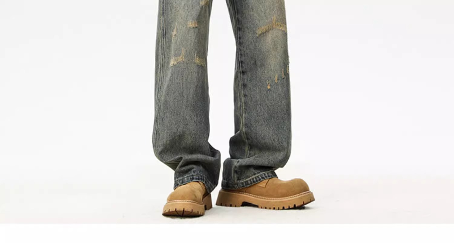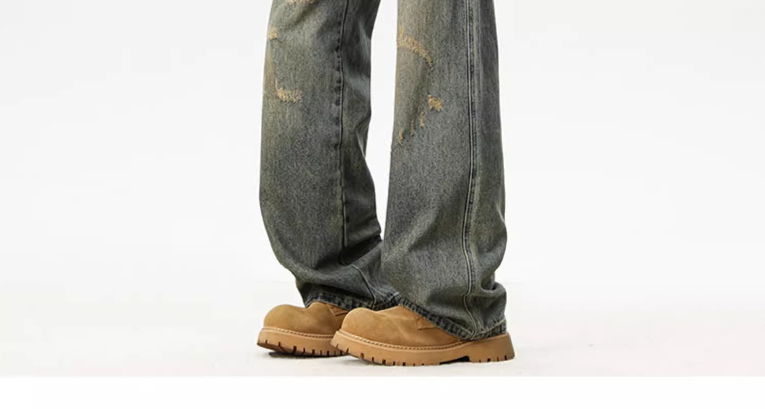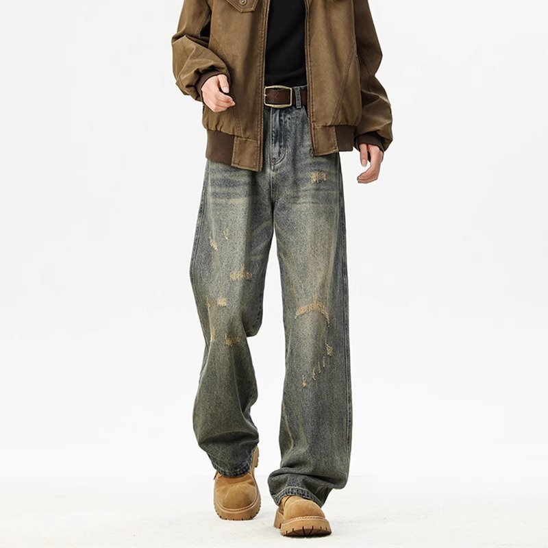아메리칸 레트로 워싱 찢어진 청바지 남성 트렌디 하이 스트리트 캣스터드 루즈 스트레이트 캐주얼 와이드 레그 롱 팬츠