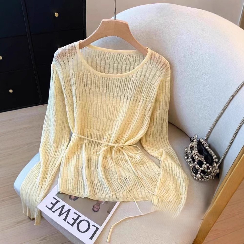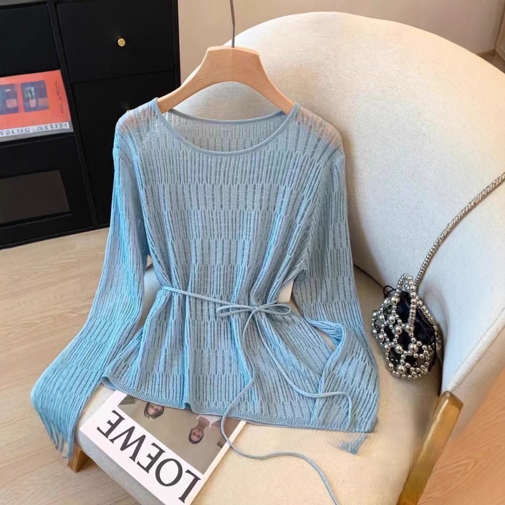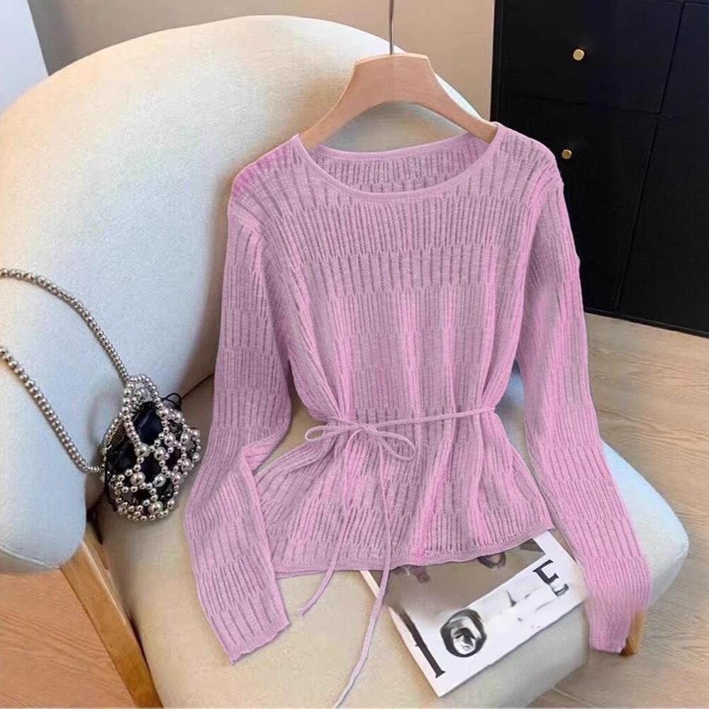 여성용 레이지 스타일 중간 길이의 느슨한 중공 크로 셰 뜨개질 레이스 업 디자인 스웨터 봄 여름 새로운 다용도 블라우스스토어 가기