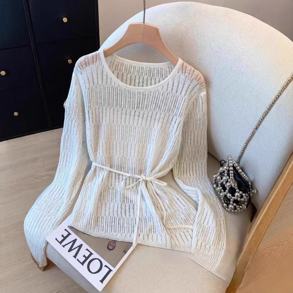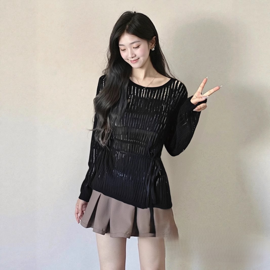 여성용 레이지 스타일 중간 길이의 느슨한 중공 크로 셰 뜨개질 레이스 업 디자인 스웨터 봄 여름 새로운 다용도 블라우스