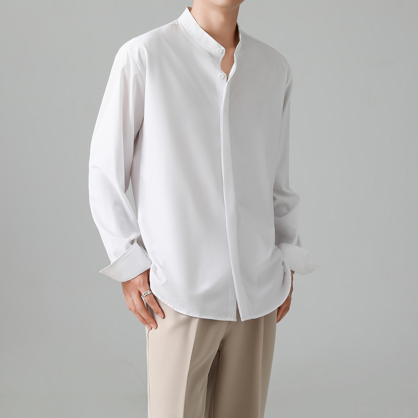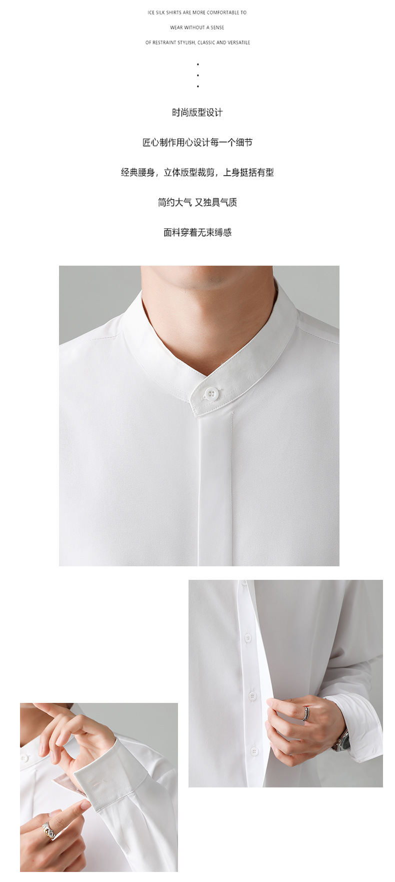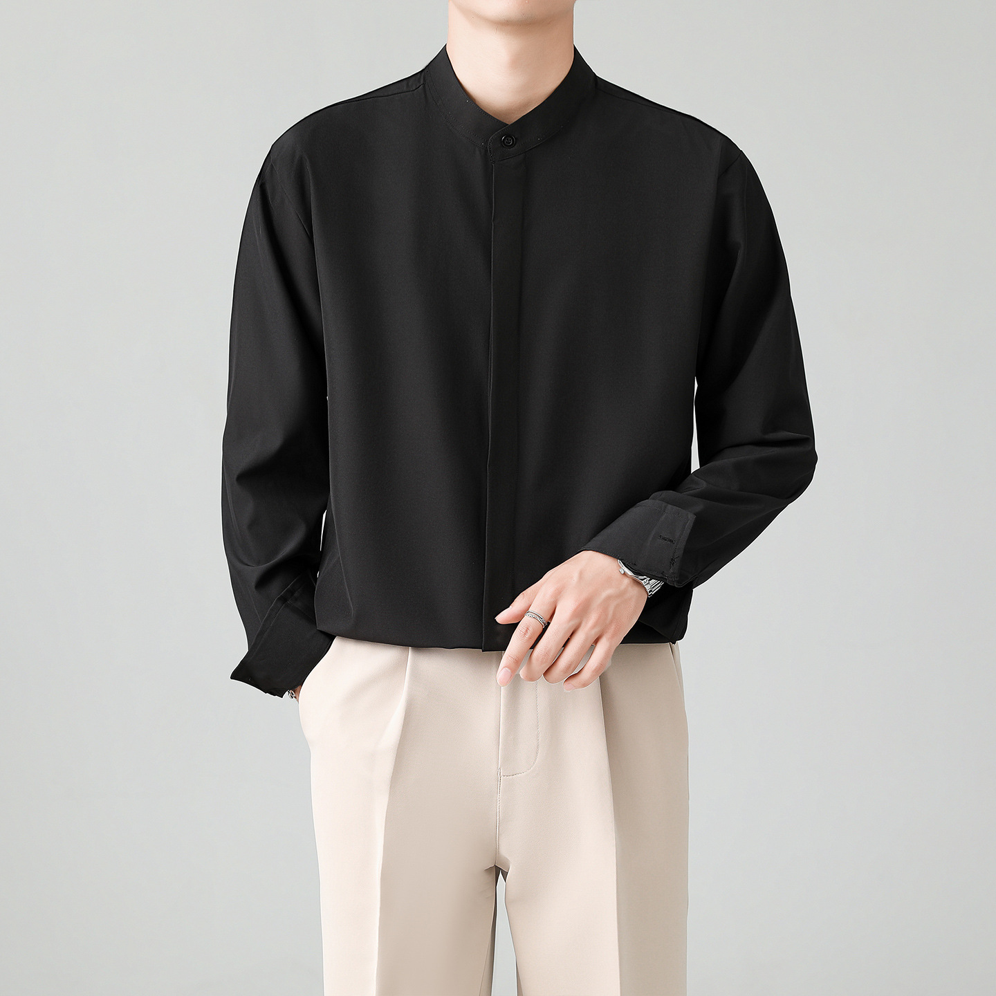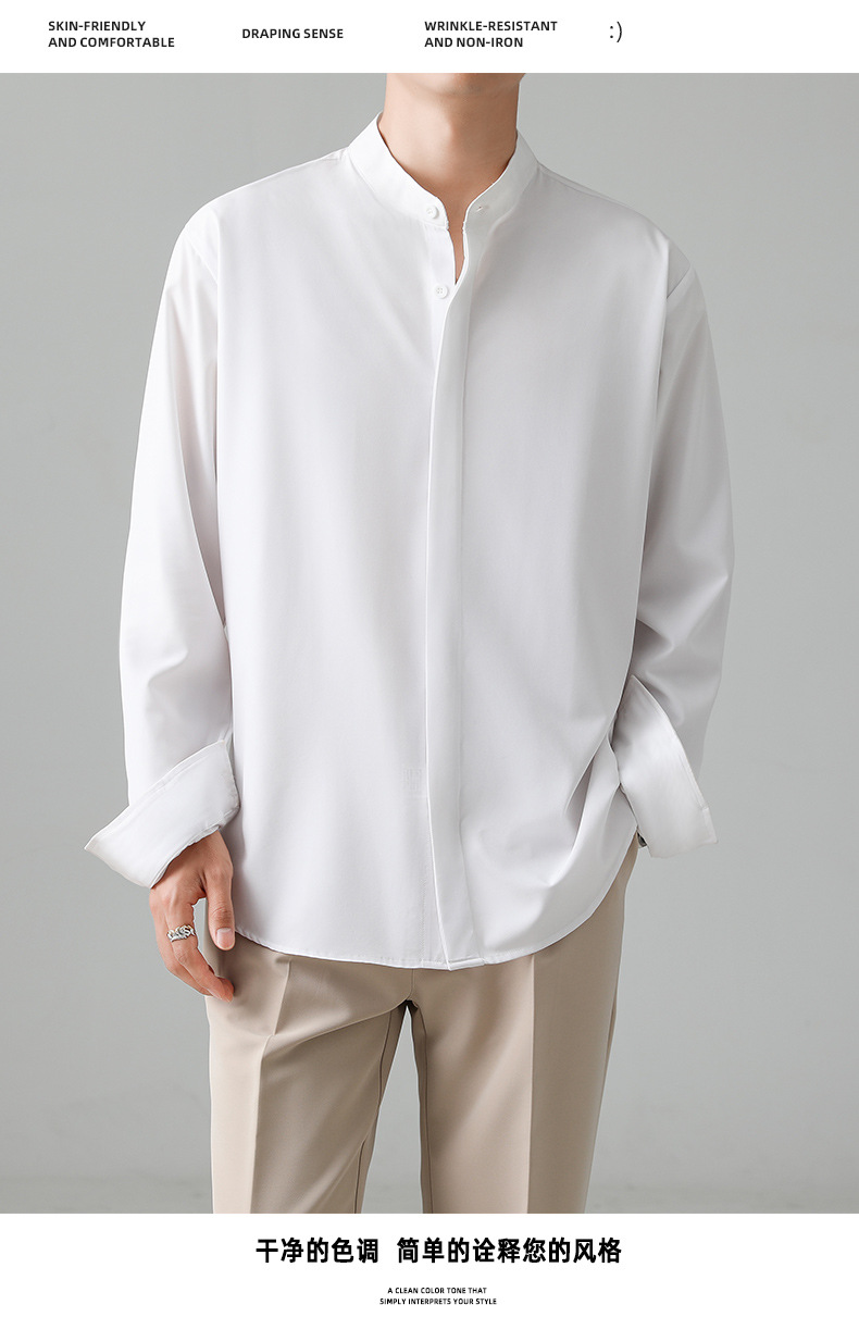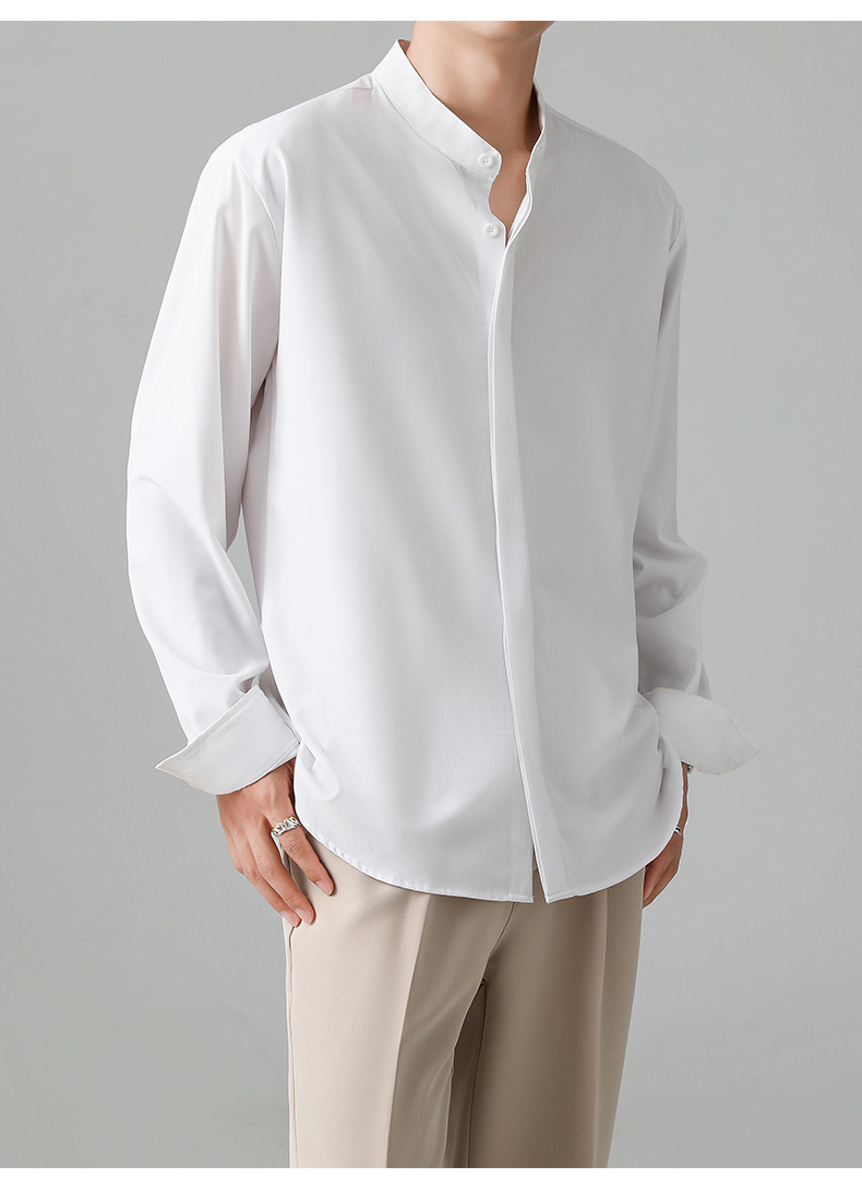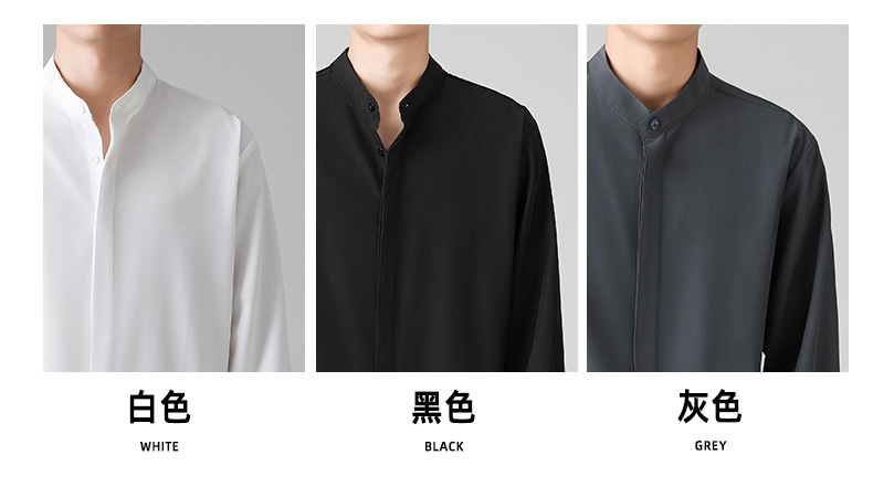 LKTM 남자의 새로운 중국 스타일 수직 칼라 긴팔 셔츠 남자의 가벼운 성숙한 스타일 하이 엔드 감각 유피 잘 생긴 아이스 실크 포장 셔츠
