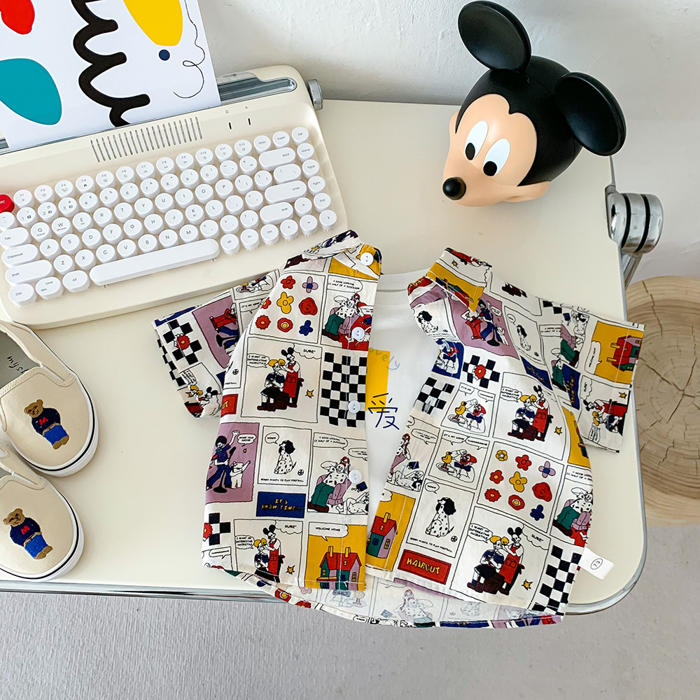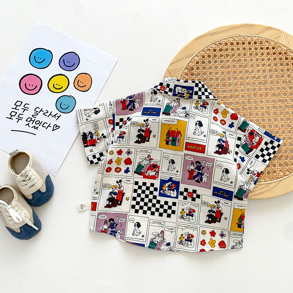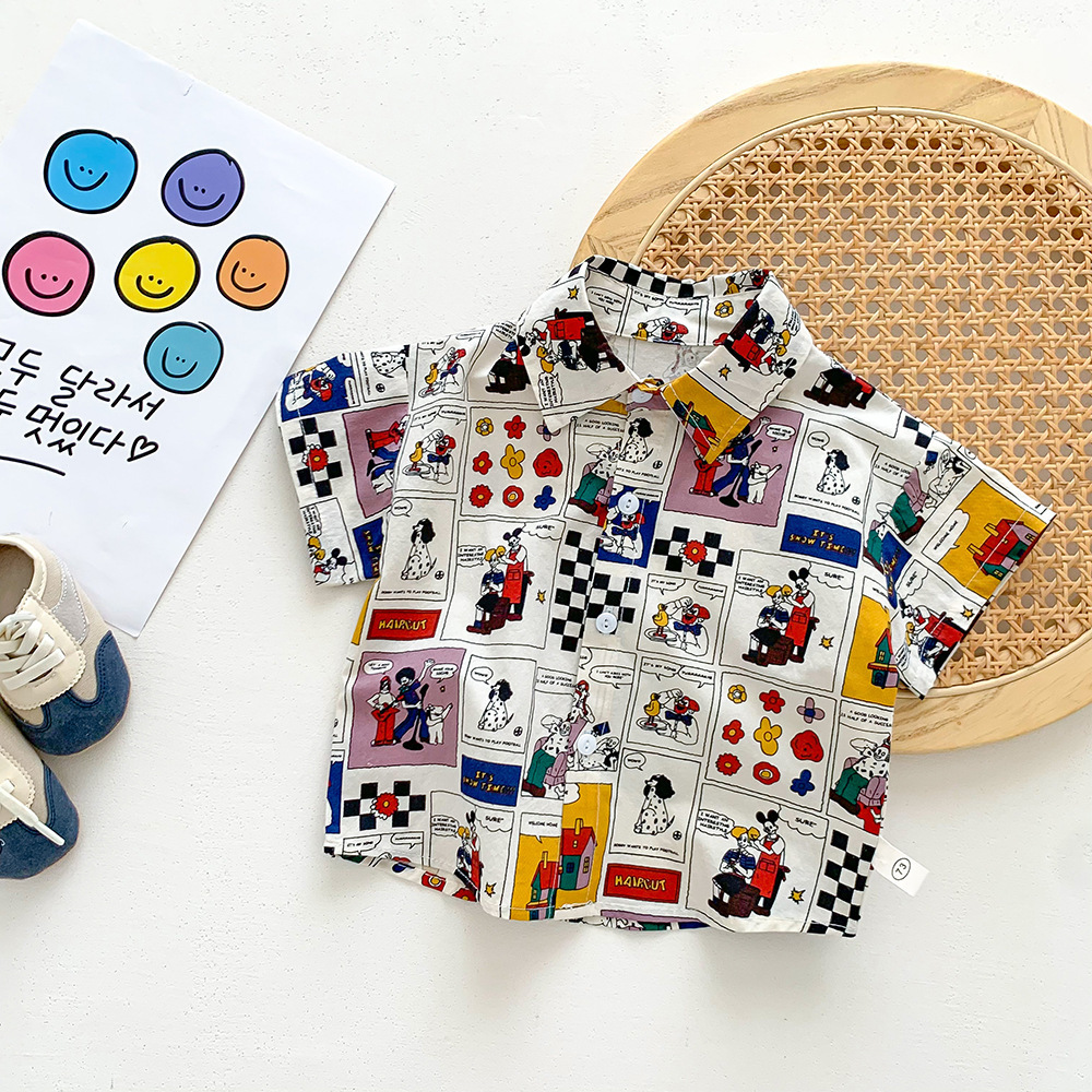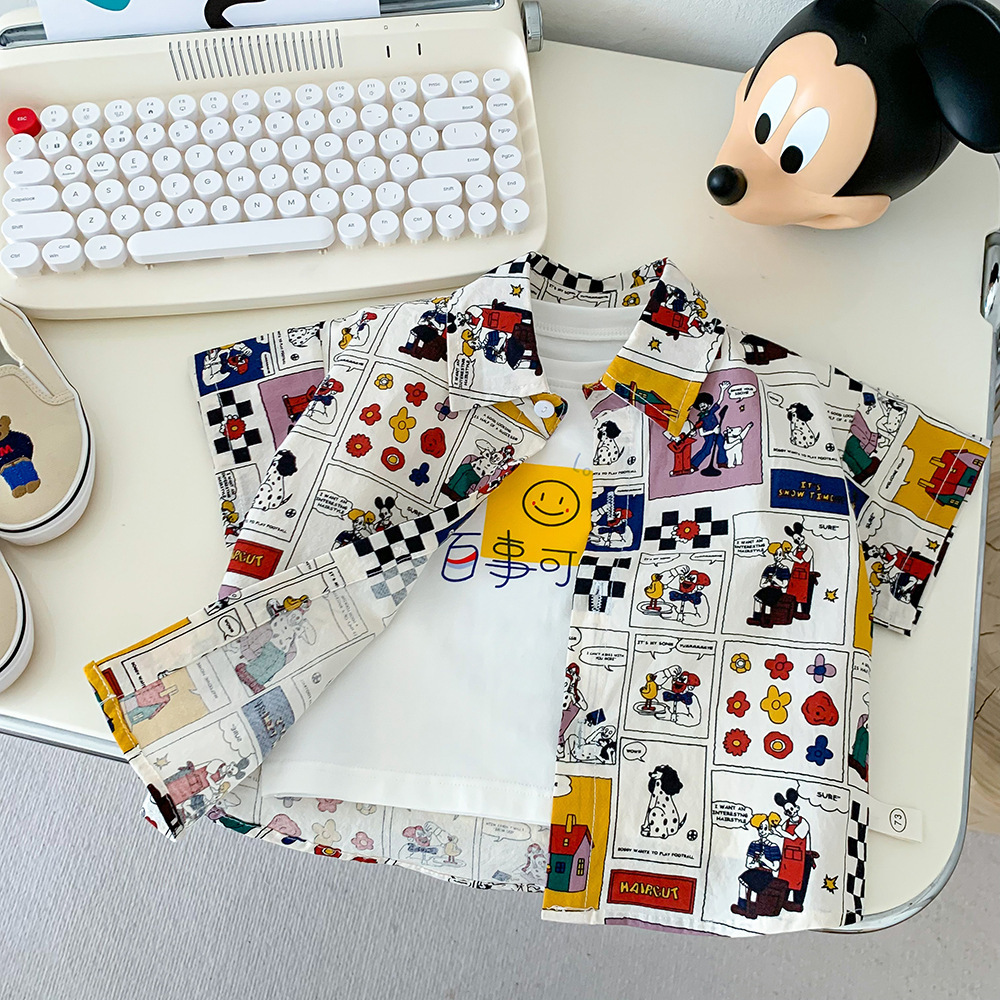 아동용 반팔 셔츠 여름 신작 소년 셔츠 한국식 스탠드 칼라 만화 베이비 스트리트 핸섬 탑 트렌디 의류스토어 가기