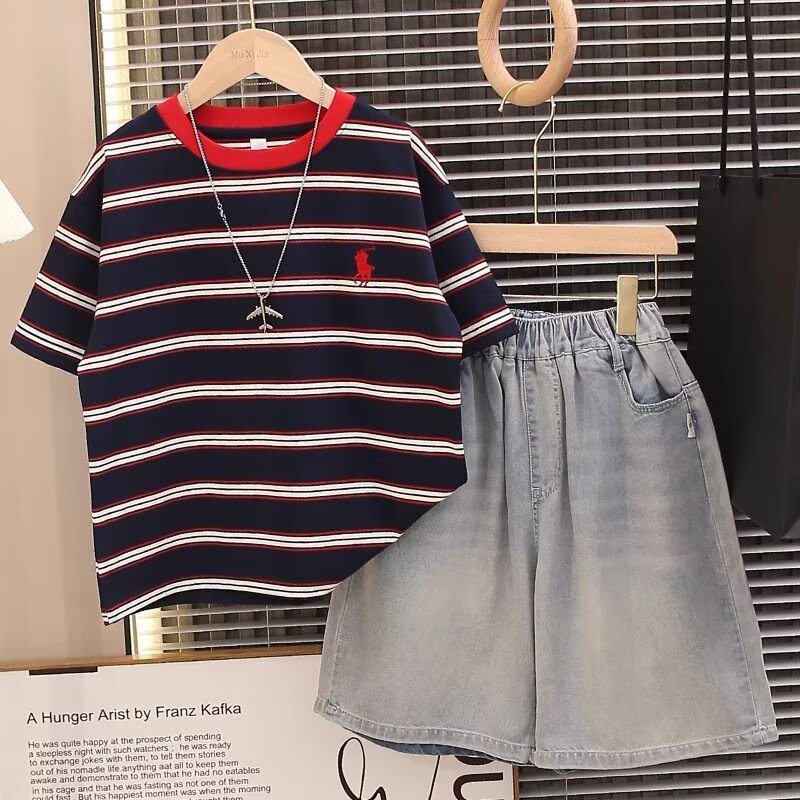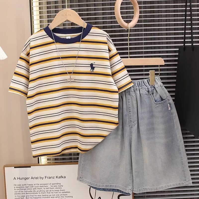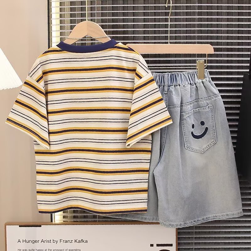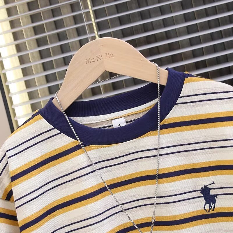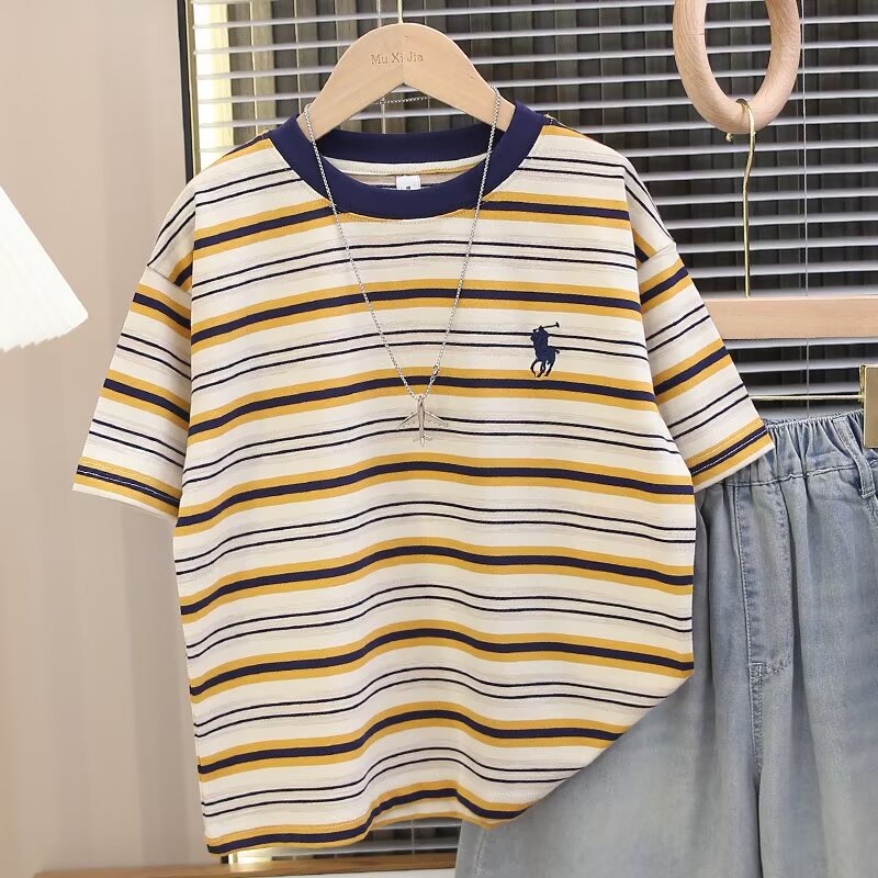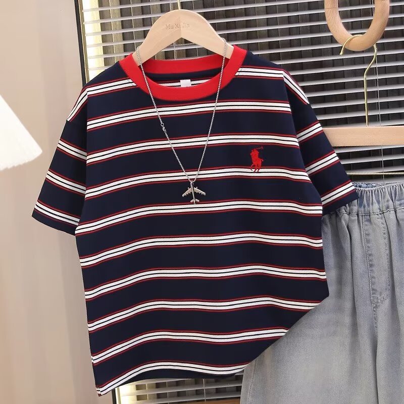 아동복 소년 여름 반팔 티셔츠 2025 한국어 버전 새로운 여름 중대형 어린이 줄무늬 여름 소년 탑 t