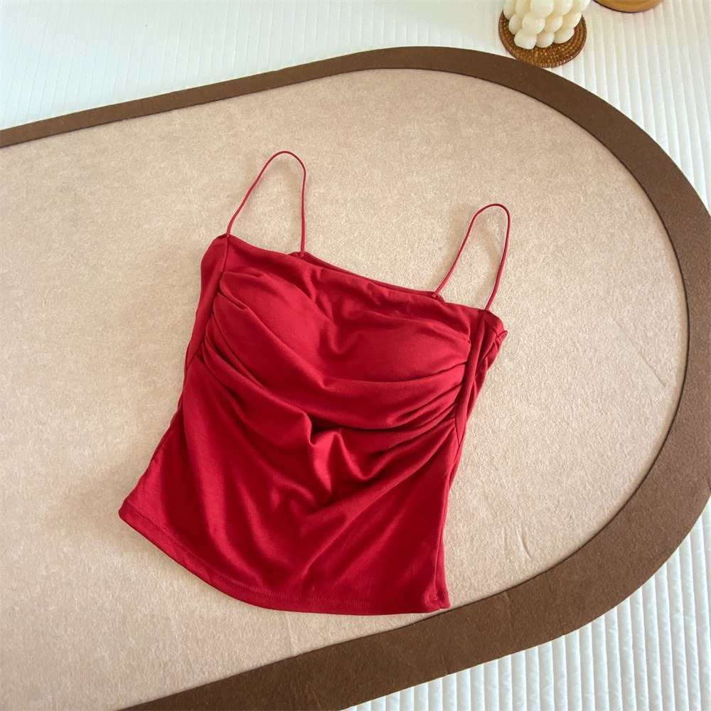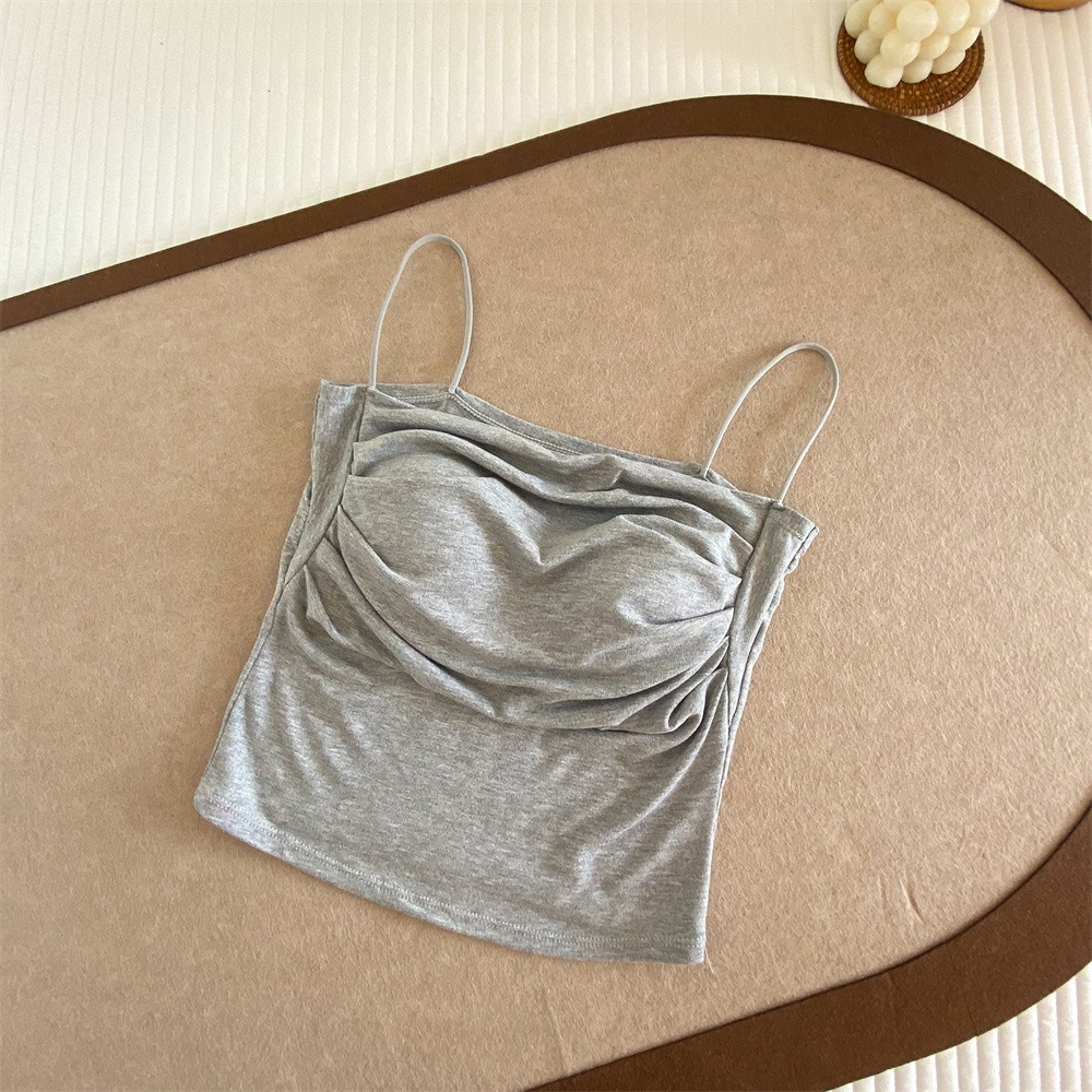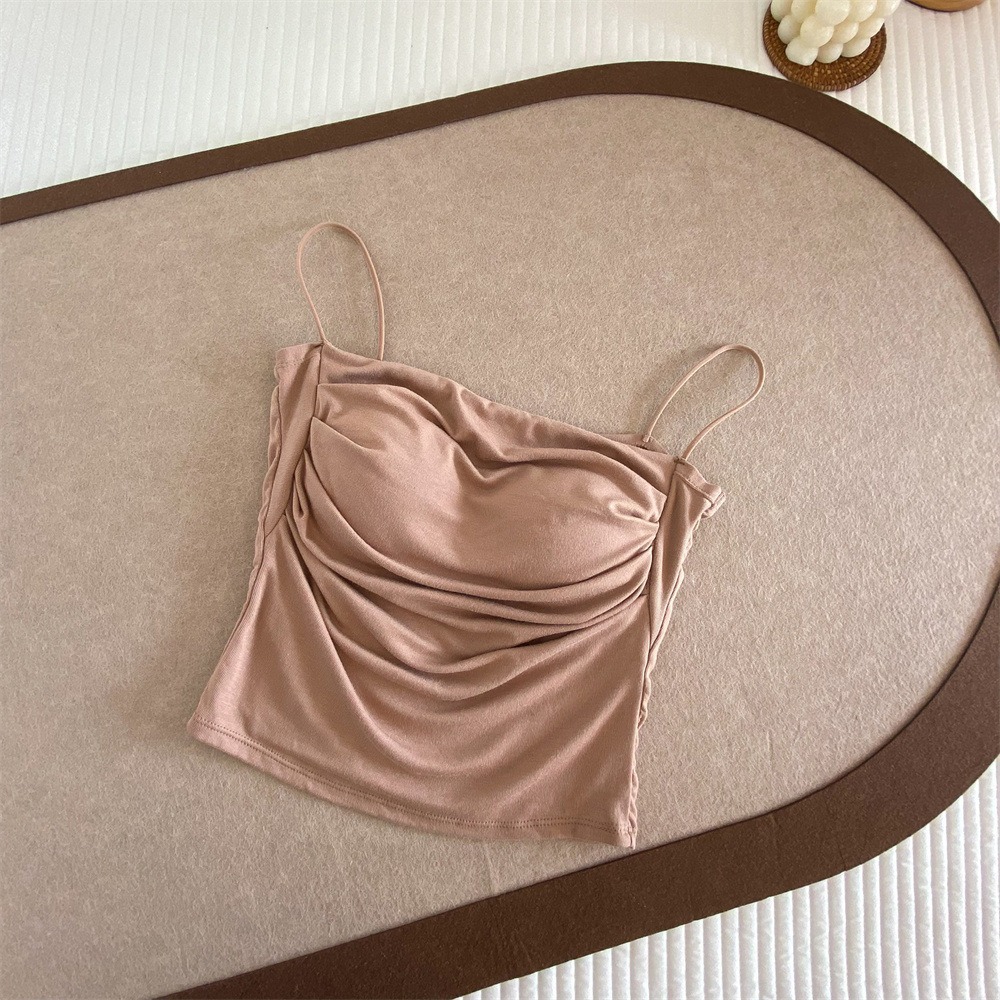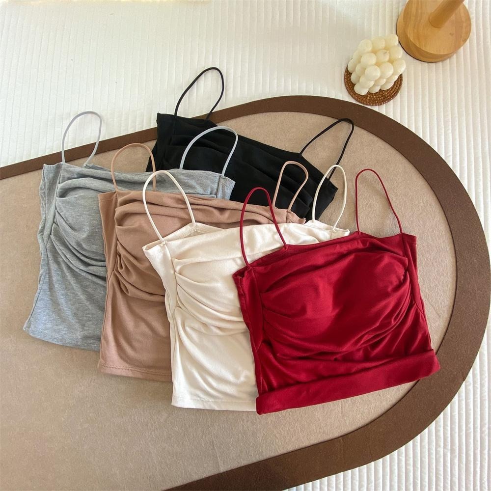 가슴 패드가 있는 여성용 여름 솔리드 컬러 플리츠 캐미솔, 슬림핏, 이너웨어, 아우터웨어, 아름다운 등, 짧은 하의 탑