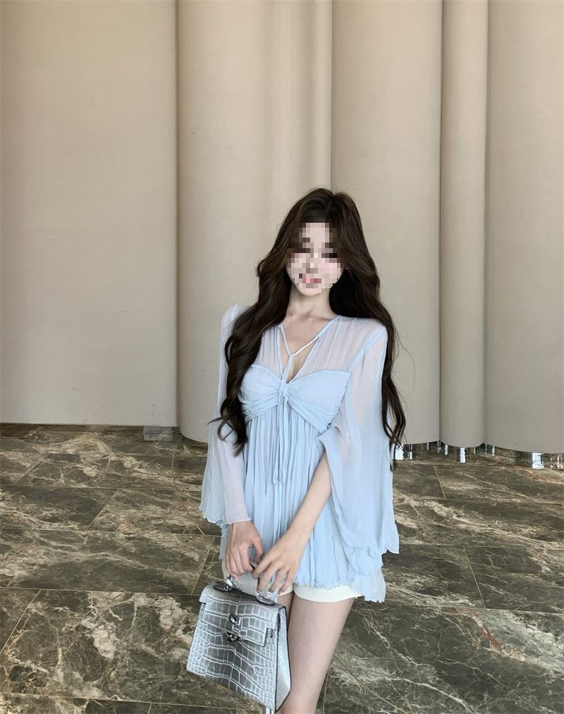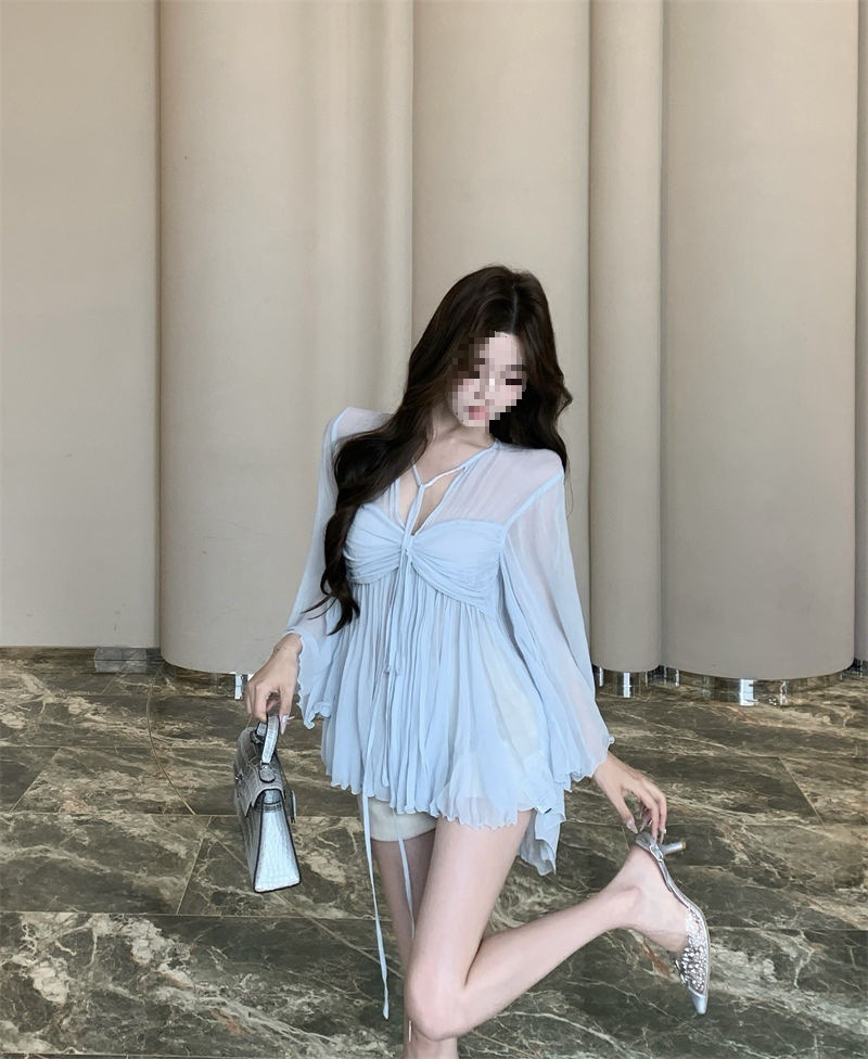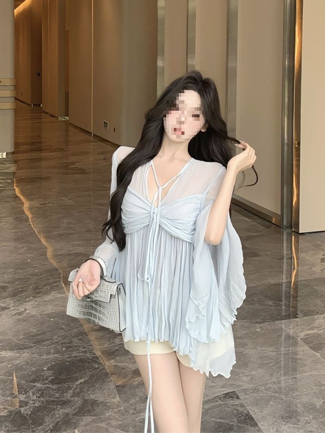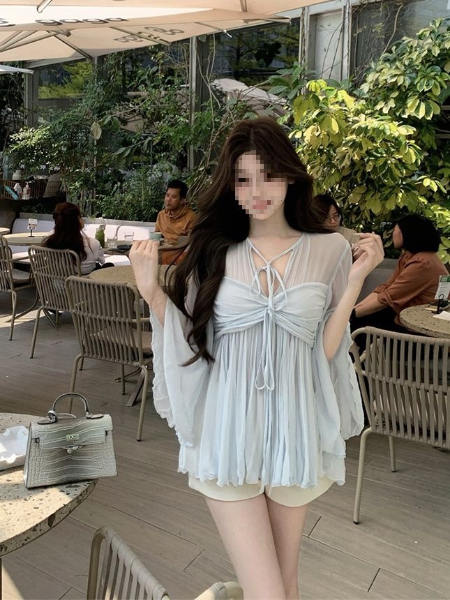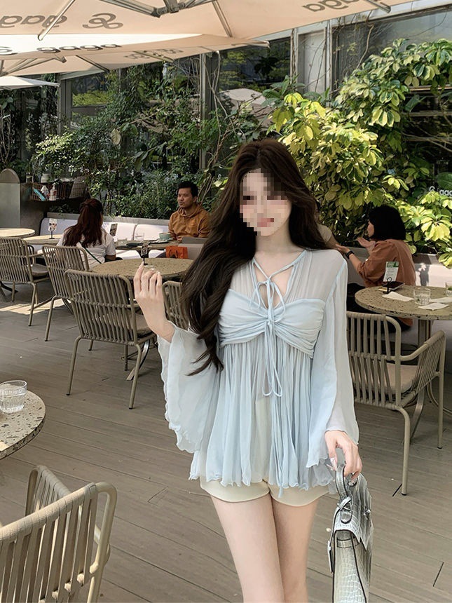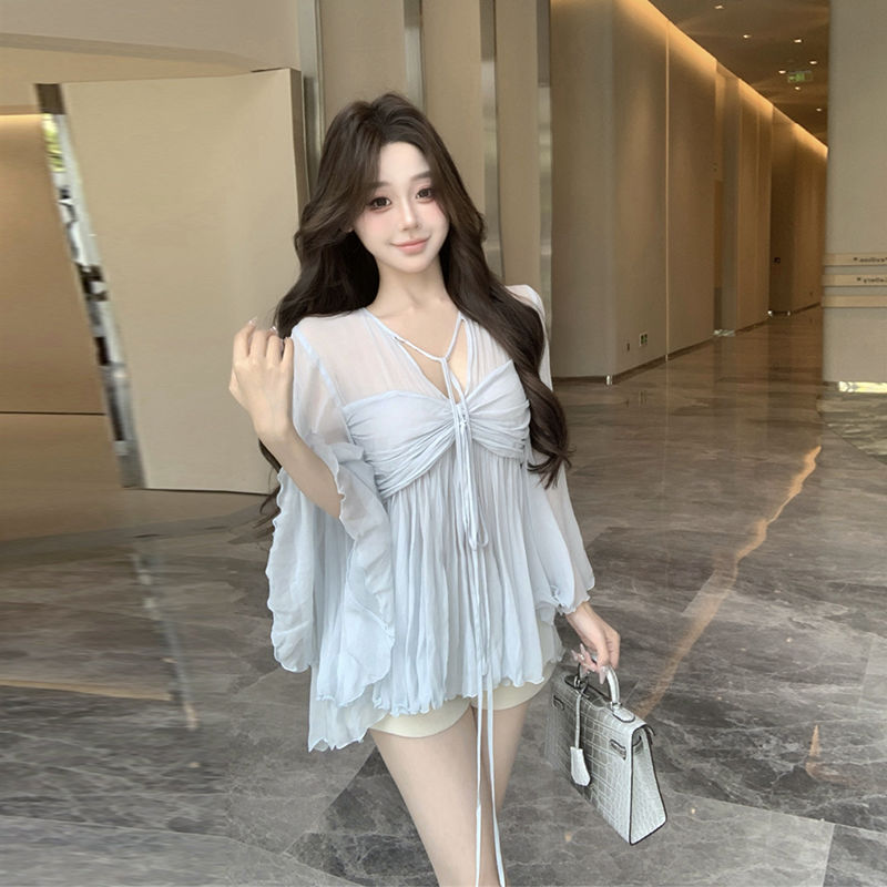 여름 휴가를 위한 부드러운 스타일의 가벼운 럭셔리 쉬폰 셔츠 여성용 요정 디자인 느슨한 자외선 차단제 여성용 얇은 탑