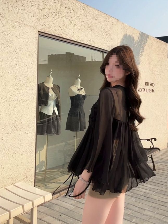 여름 휴가를 위한 부드러운 스타일의 가벼운 럭셔리 쉬폰 셔츠 여성용 요정 디자인 느슨한 자외선 차단제 여성용 얇은 탑스토어 가기
