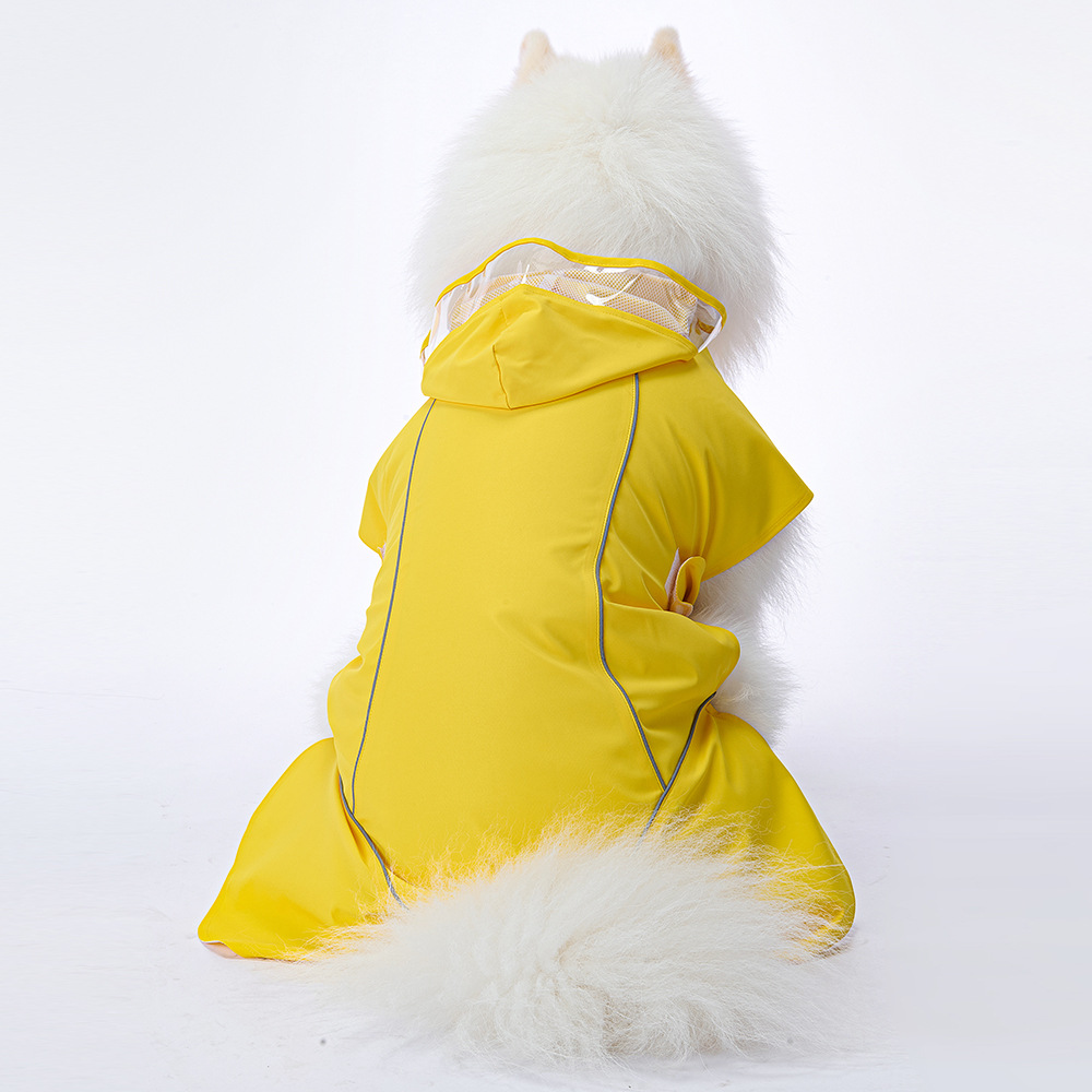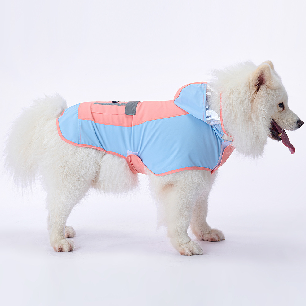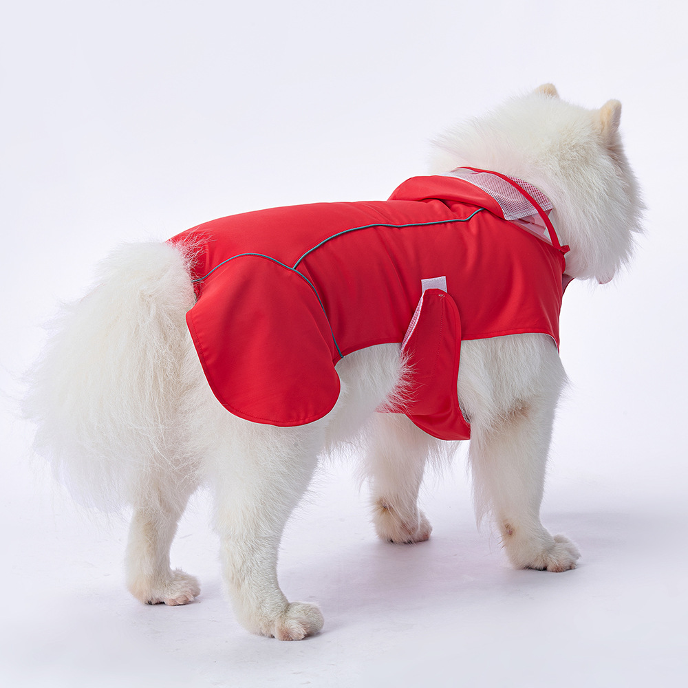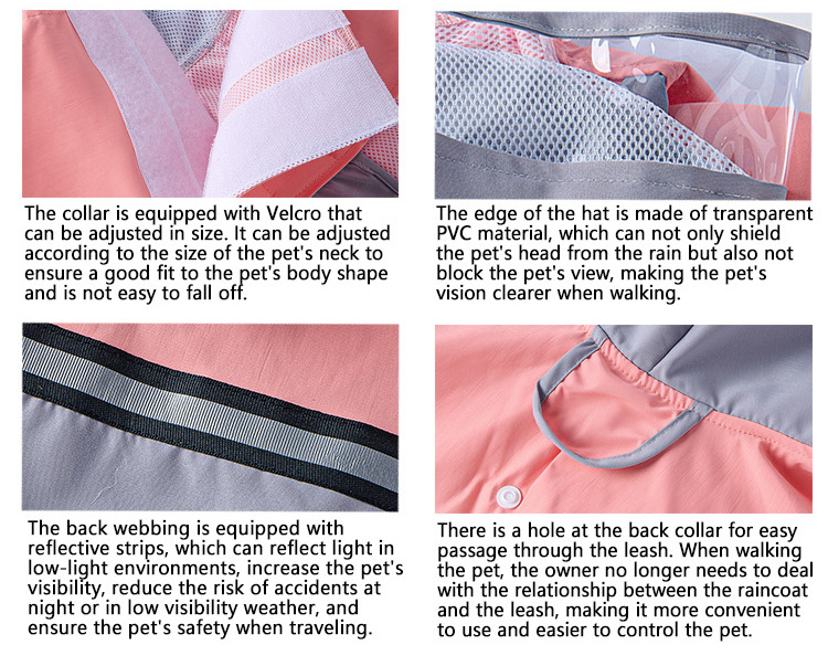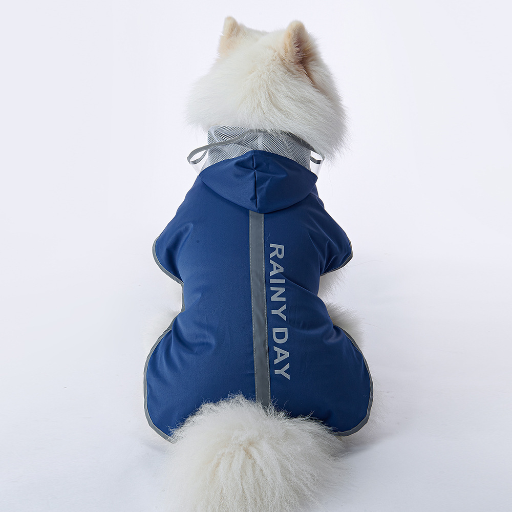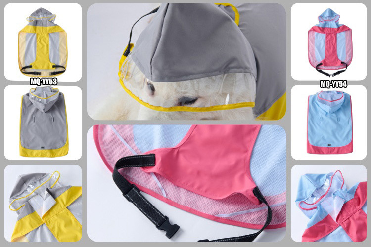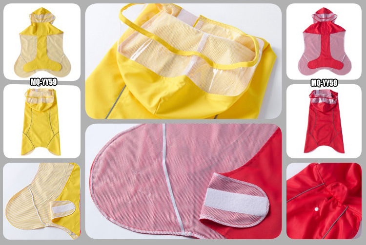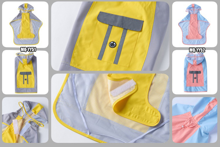 봄과 여름 얇은 통기성 메쉬 벨크로 반사 스트립 애완 동물 비옷을 입은 개 비옷 후드 케이프를 착용하기 쉽습니다.