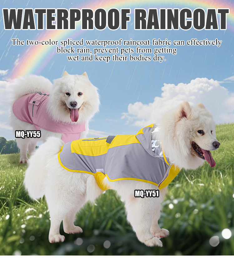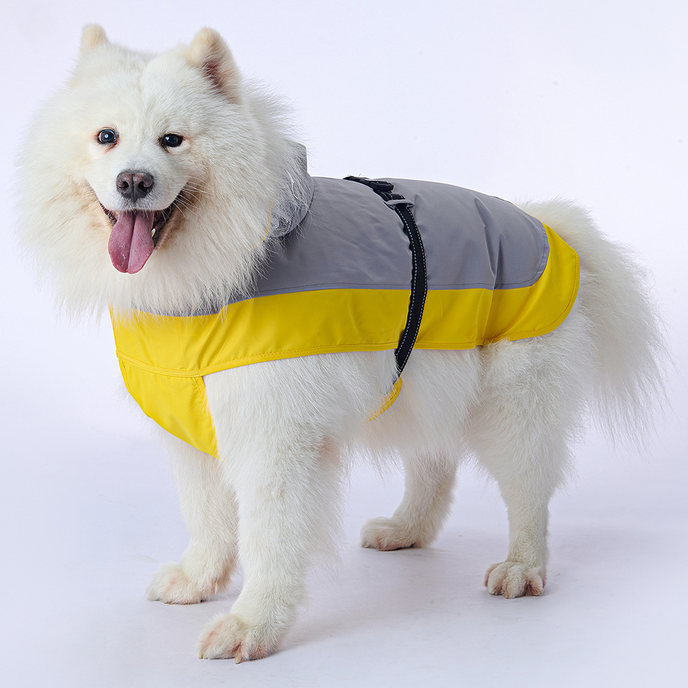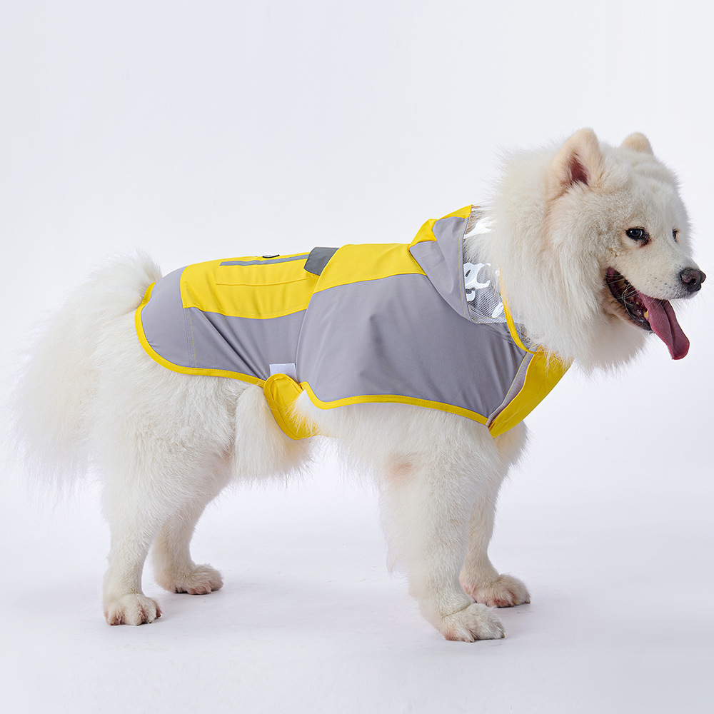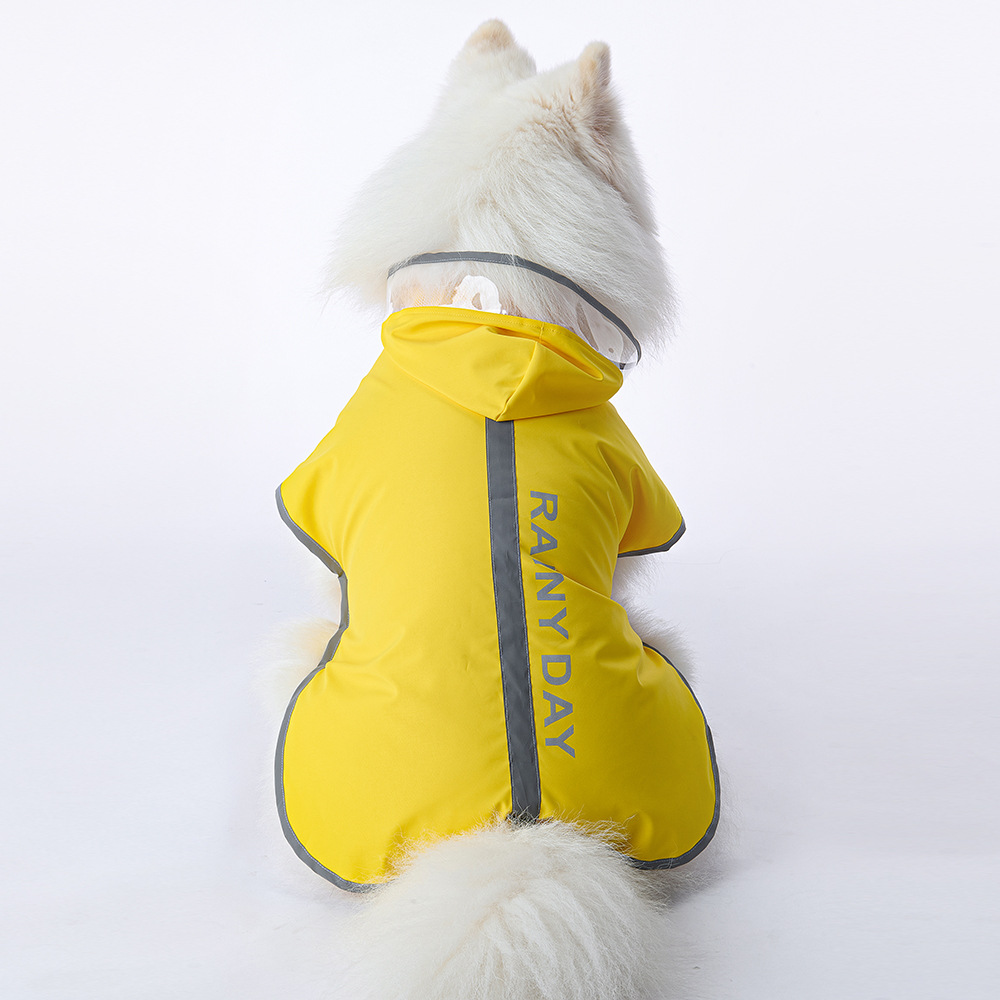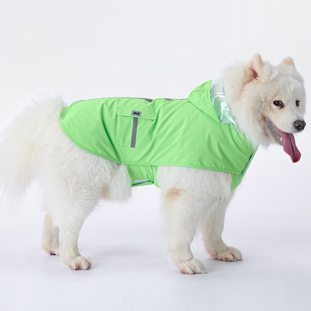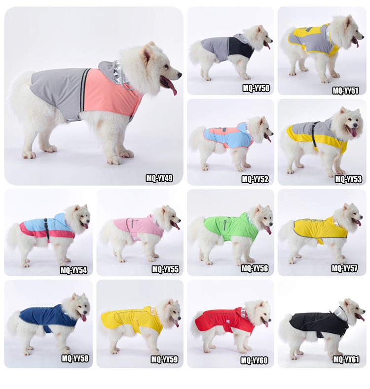 봄과 여름 얇은 통기성 메쉬 벨크로 반사 스트립 애완 동물 비옷을 입은 개 비옷 후드 케이프를 착용하기 쉽습니다.