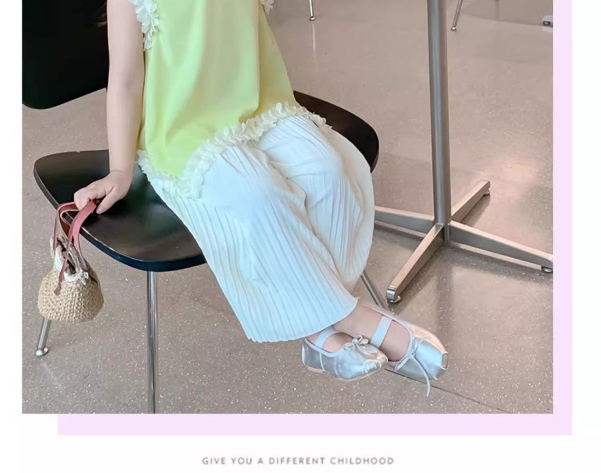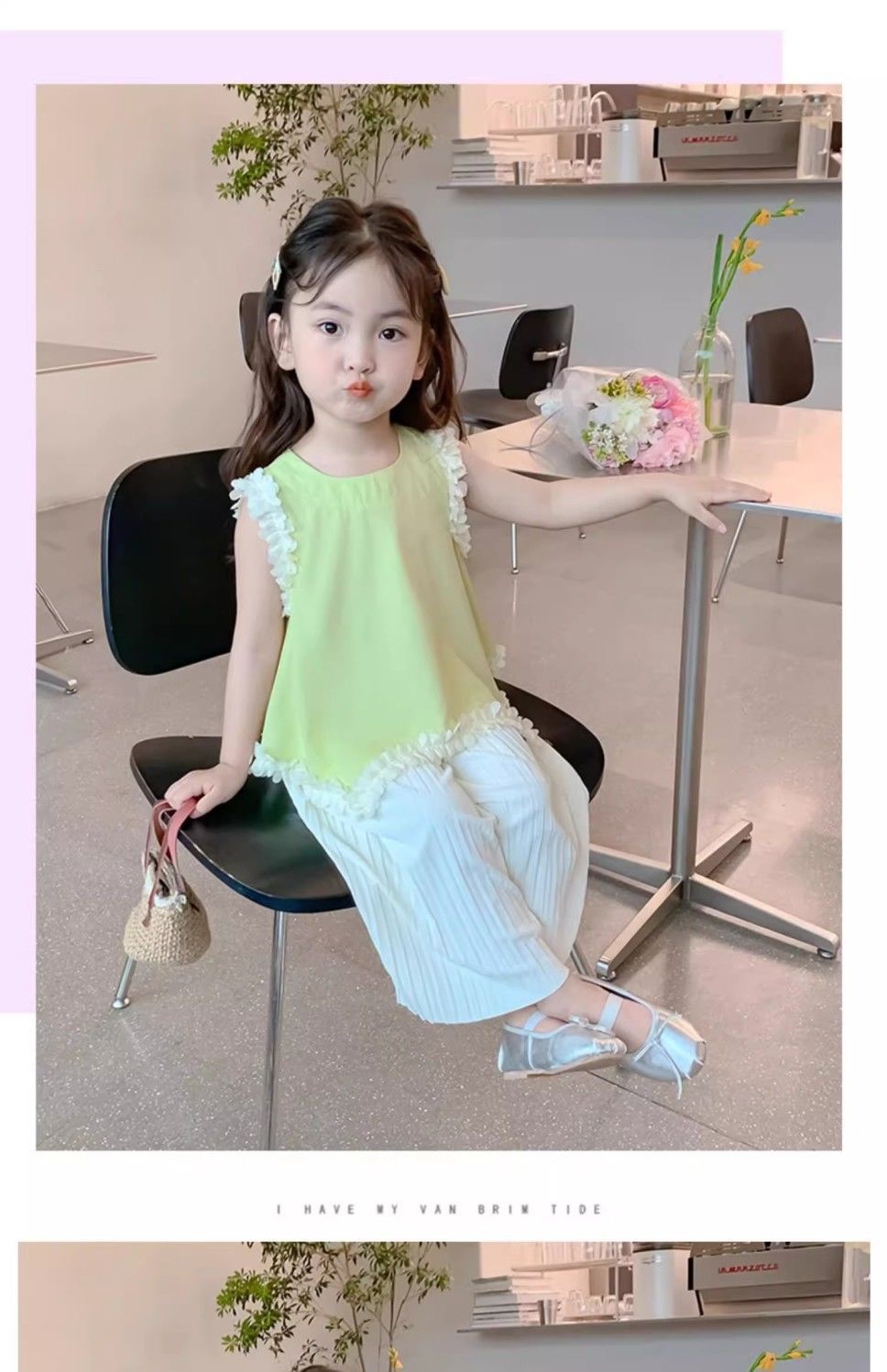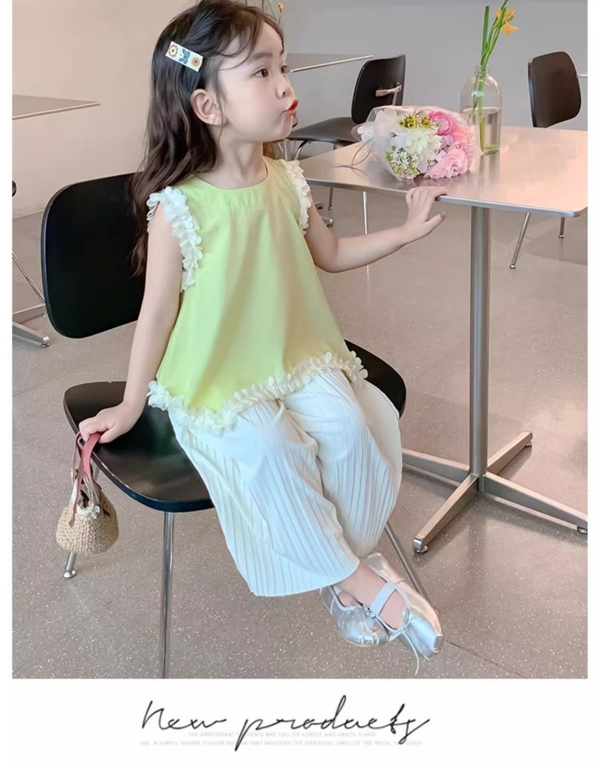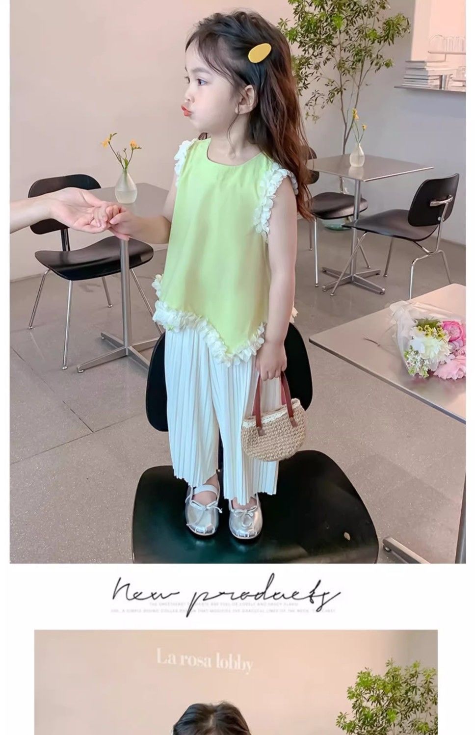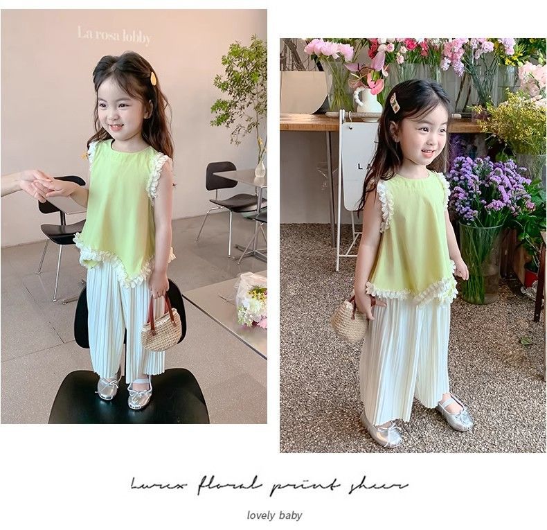 여자 여름 정장 2025 새로운 어린이 스타일 불규칙한 레이스 탑 아기 소녀 와이드 레그 팬츠 투피스 세트