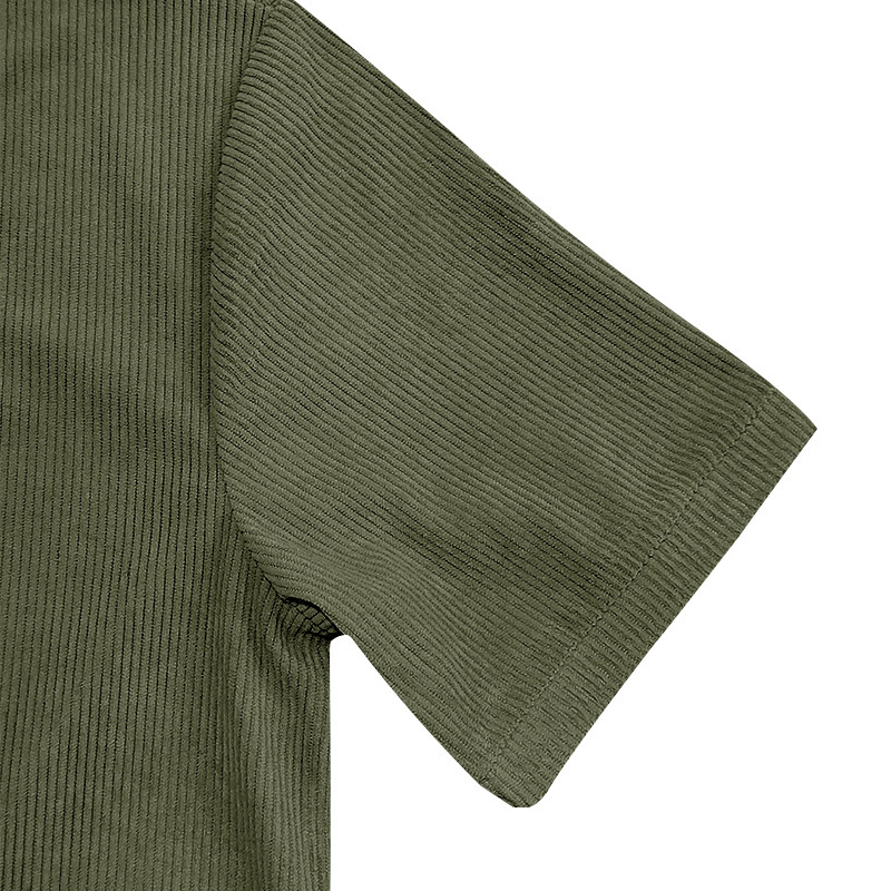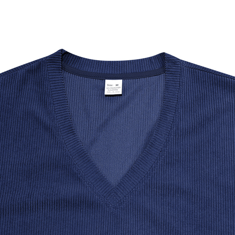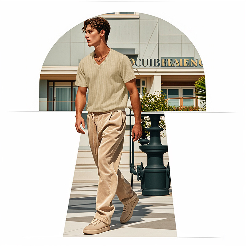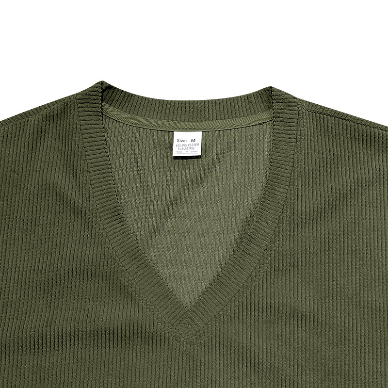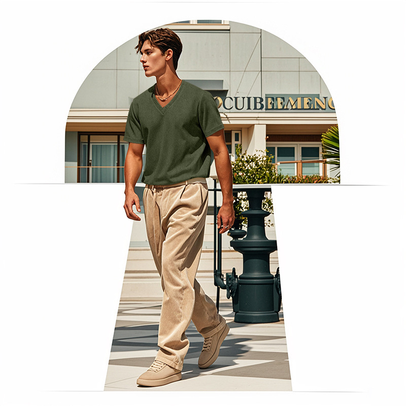 아마존 국경 2025 여름 미국 느슨한 캐주얼 통기성 남성 V 넥 티셔츠 피부 친화적 인 트렌디 코듀로이 짧은 소매
