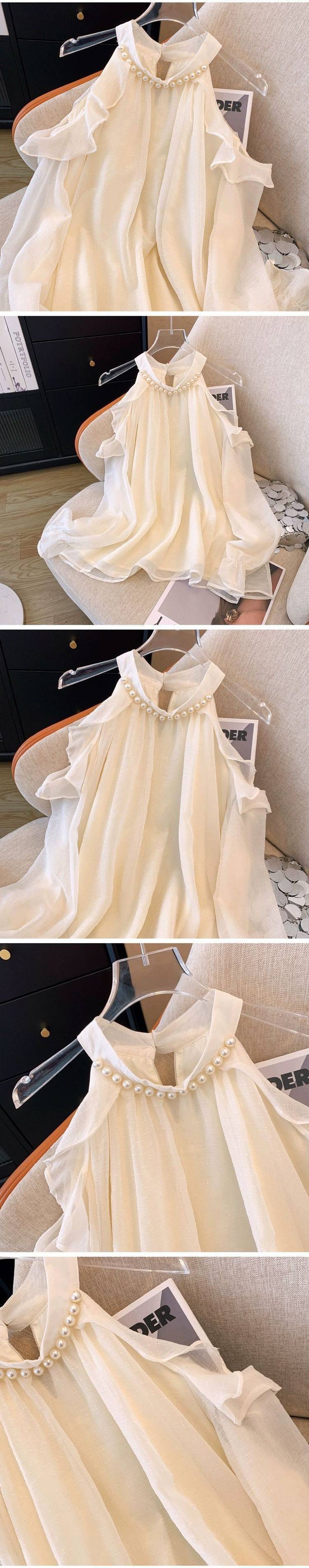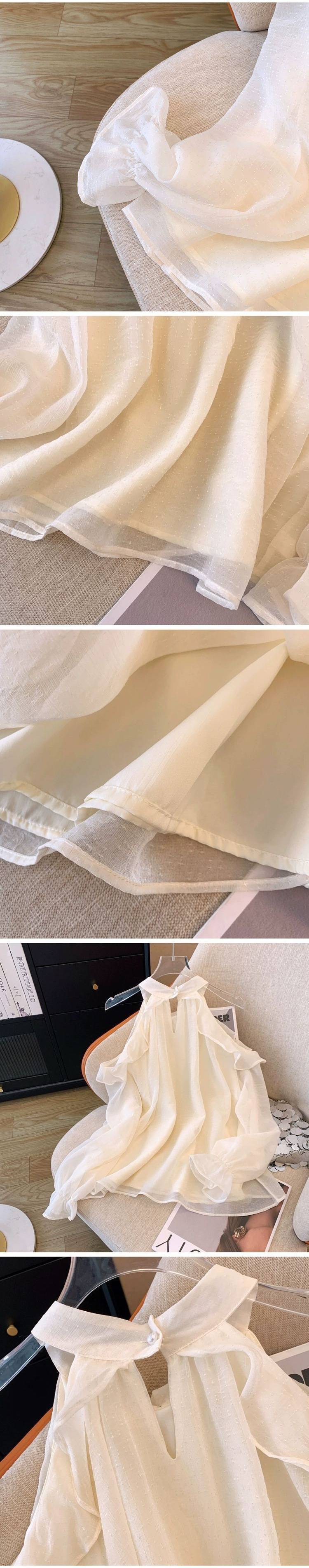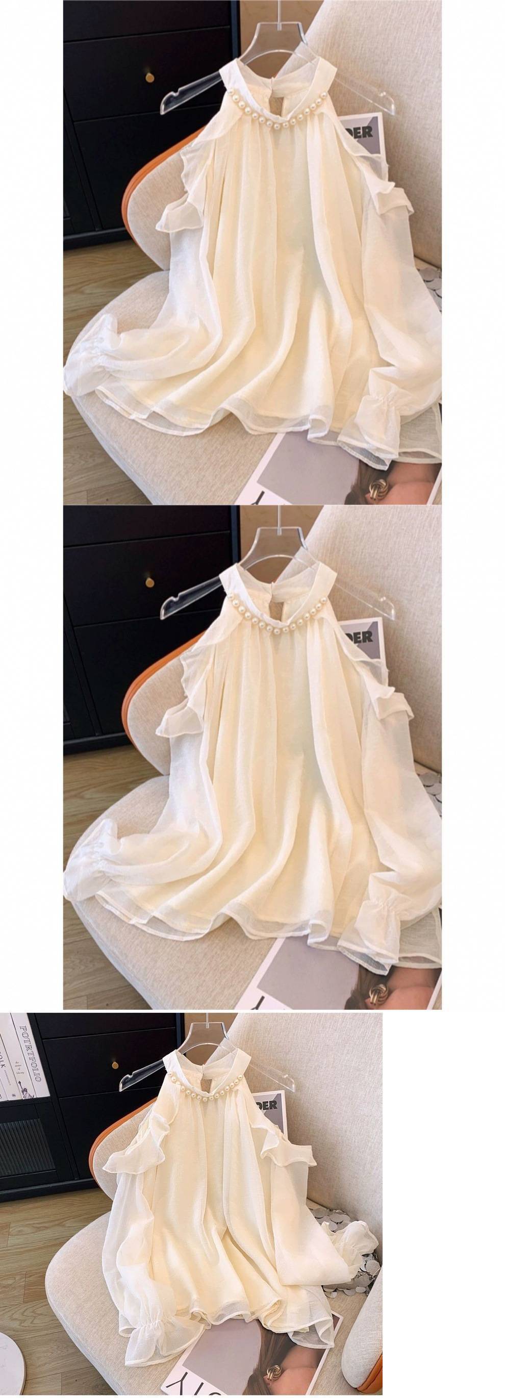 여름용 프렌치 펄 홀터넥 오프숄더 쉬폰 셔츠, 긴팔 블라우스, 루즈하고 스타일리시한 연령 감소 스위트 탑스토어 가기