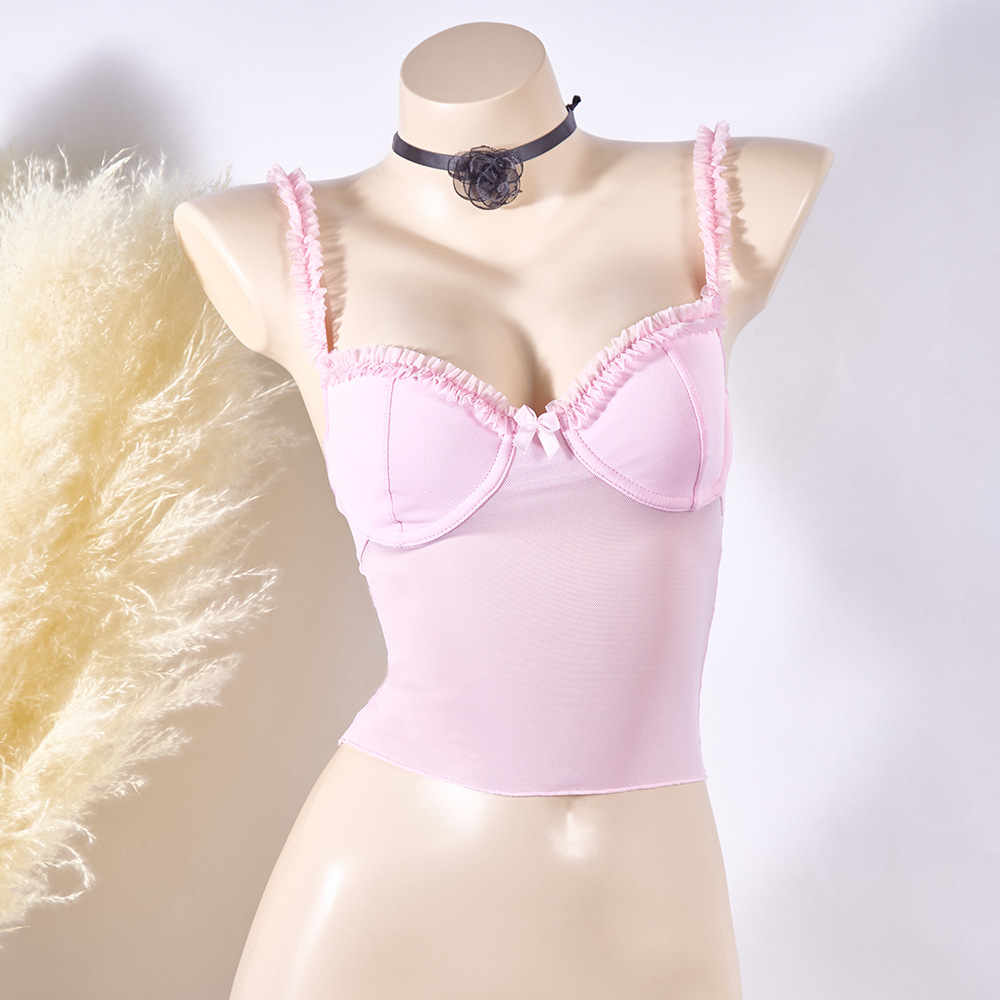 유럽과 미국의 대외 무역 국경 간 여성의 표범 무늬 서스펜더 메쉬 레이스 강철 링 바디 쉐이핑 섹시한 튜브 탑 백리스 시스루 조끼