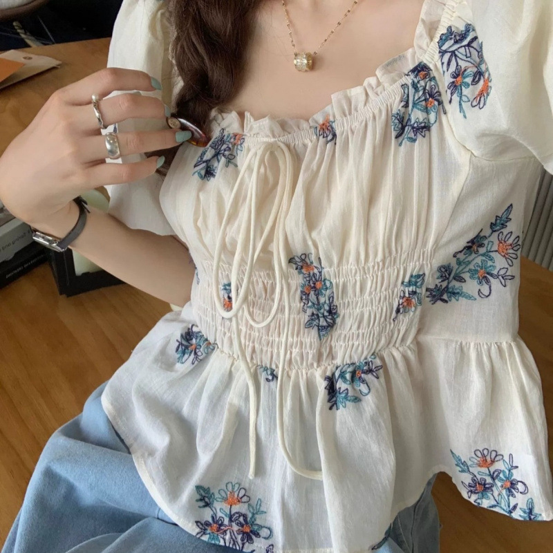 여성을위한 플러스 사이즈 꽃 티셔츠 퍼프 슬리브 셔츠 여성의 여름 새로운 디자인 틈새 달콤한 프랑스 짧은 소매 탑