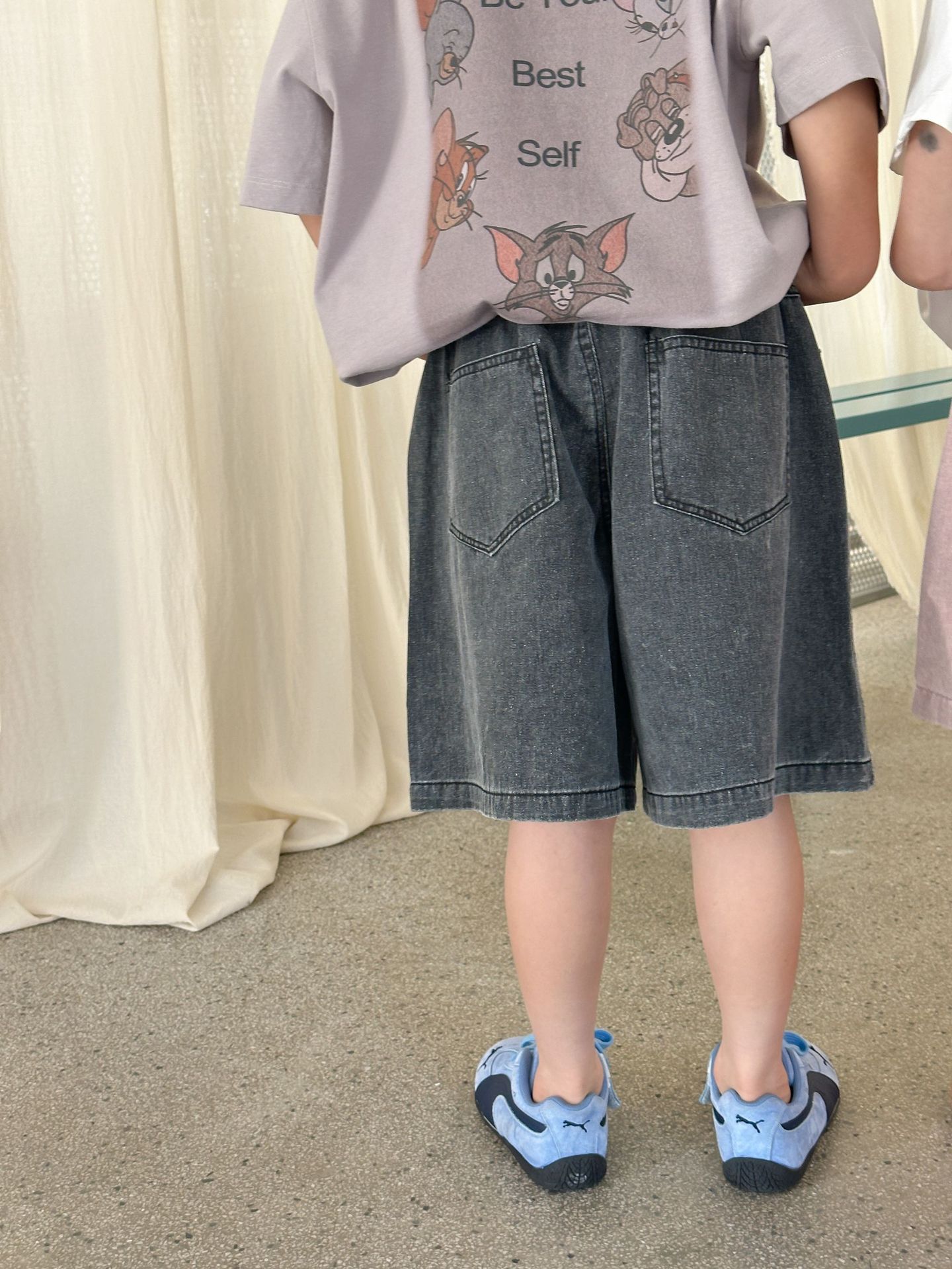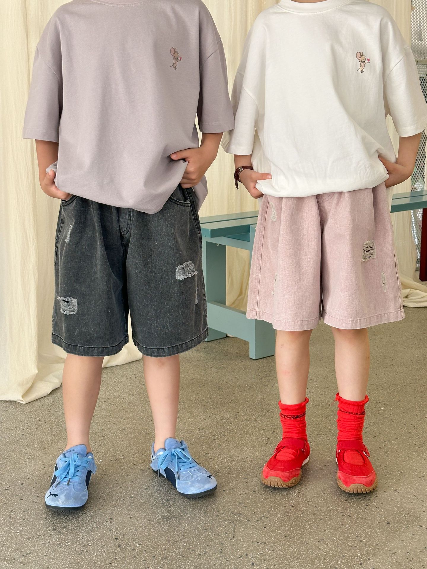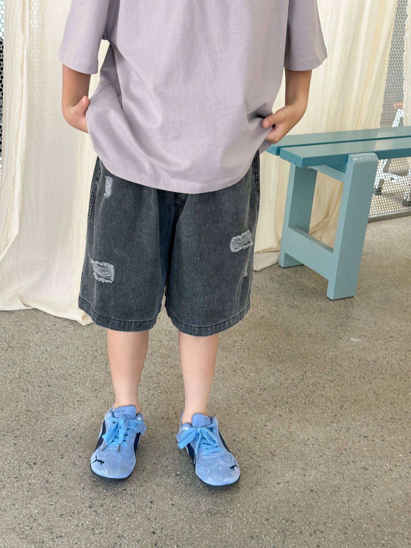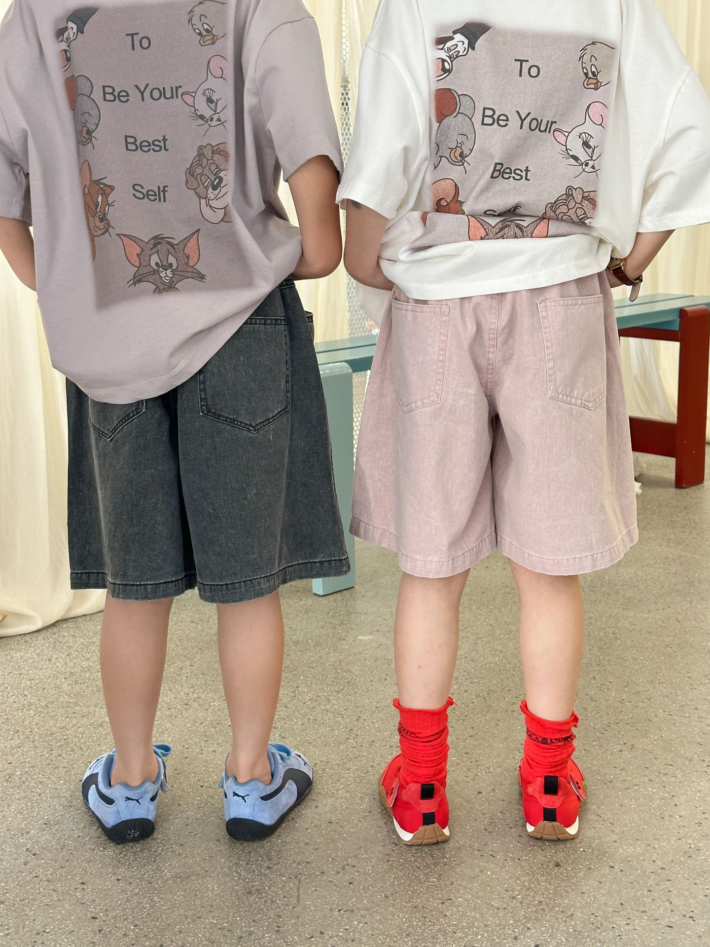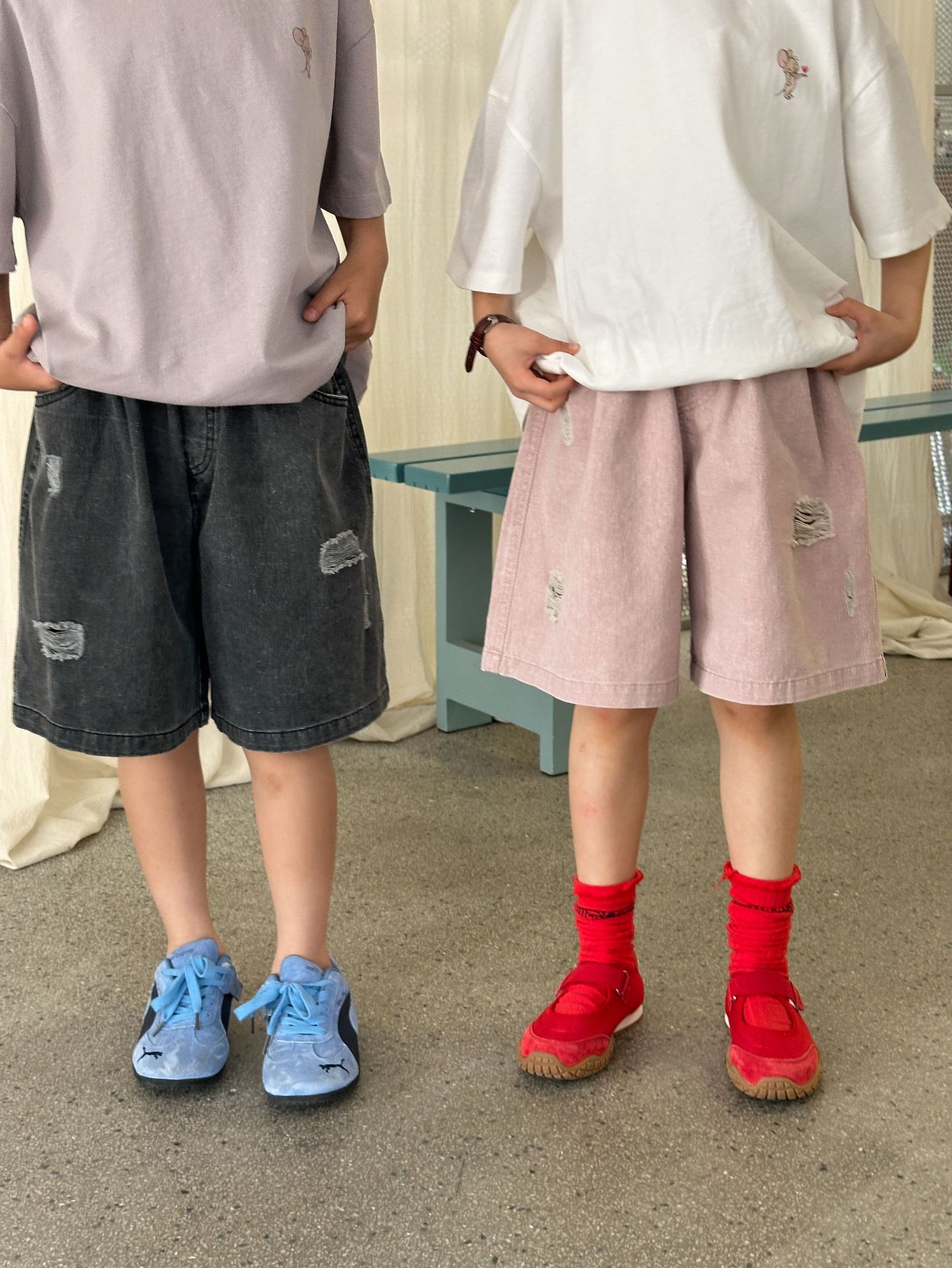 2025 년 여름 새 아동복 한국 스타일 어린이 워시 페이드 향수 구멍 반바지 소년 소녀를위한 유행 캐주얼 미드 팬츠스토어 가기
