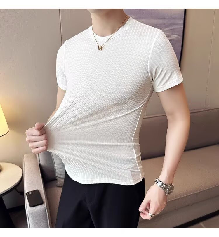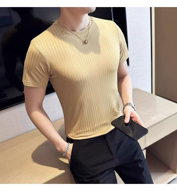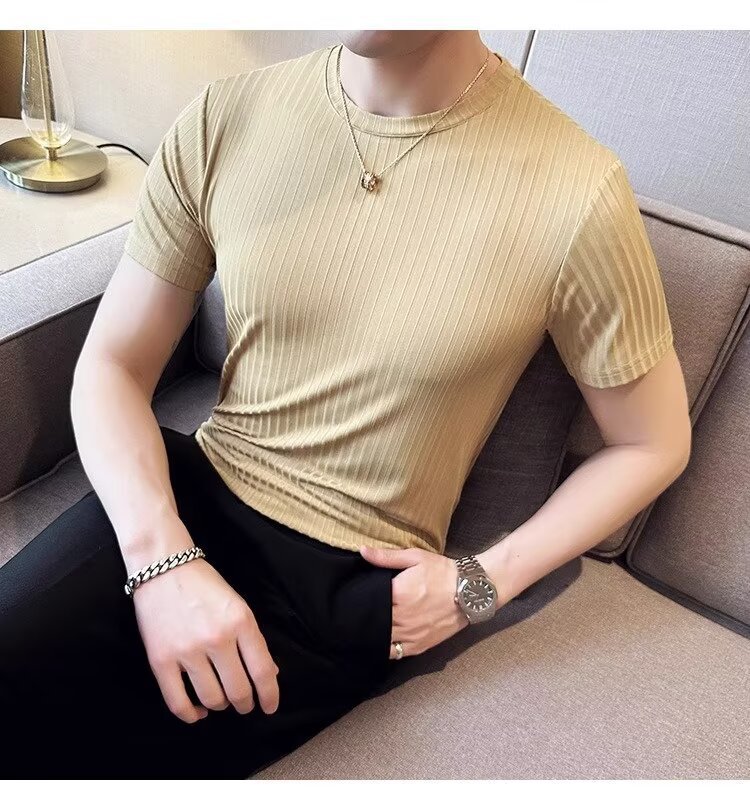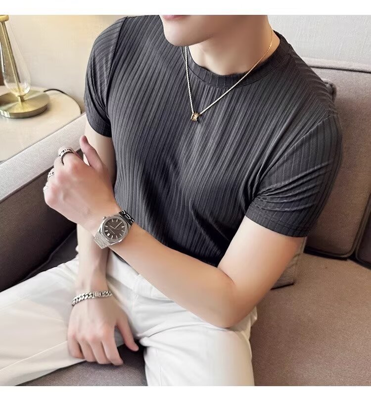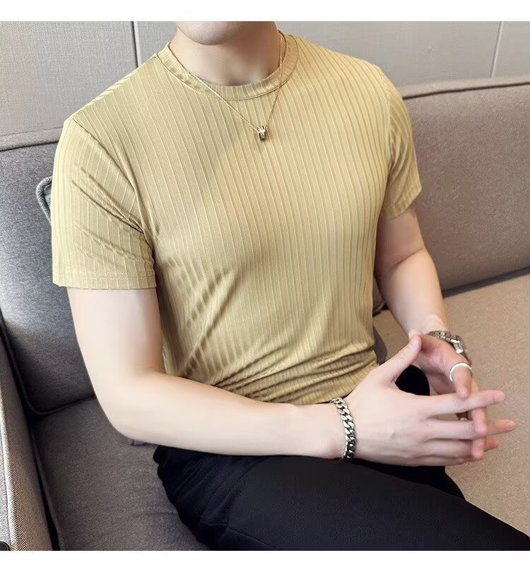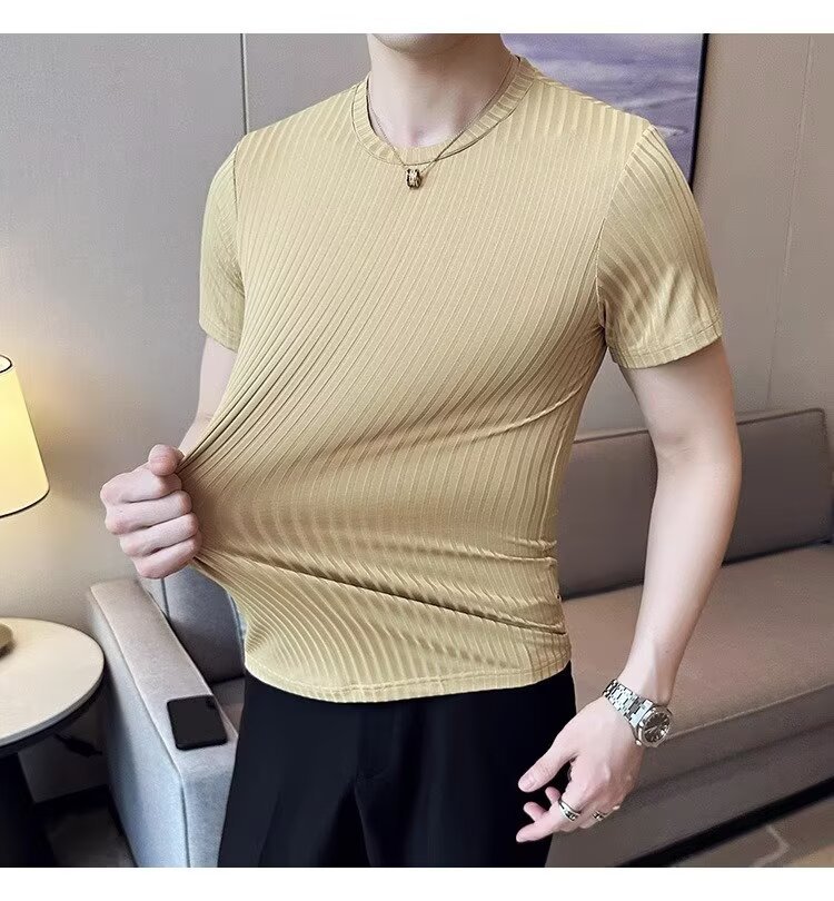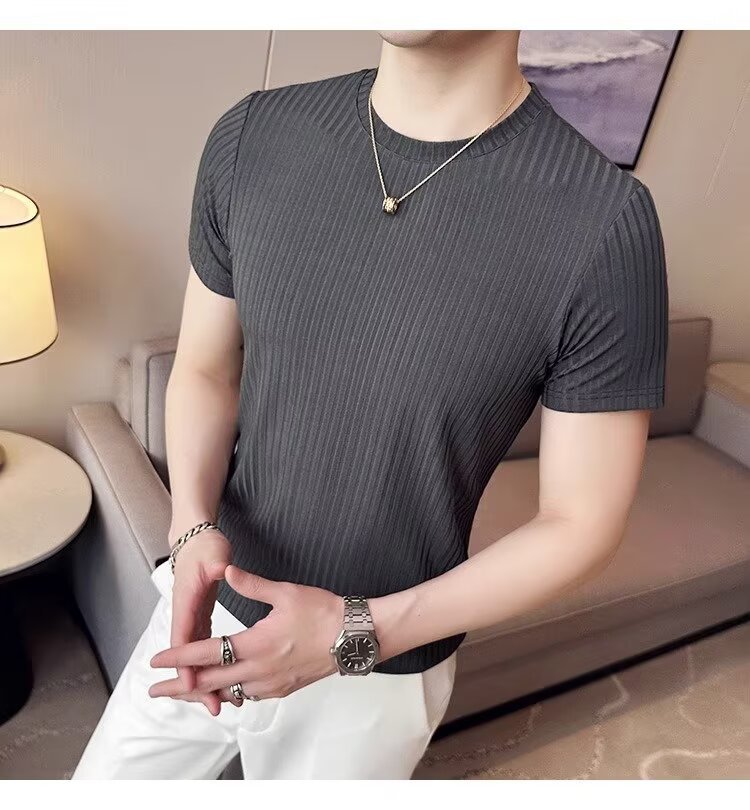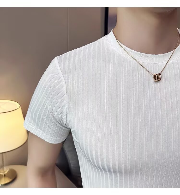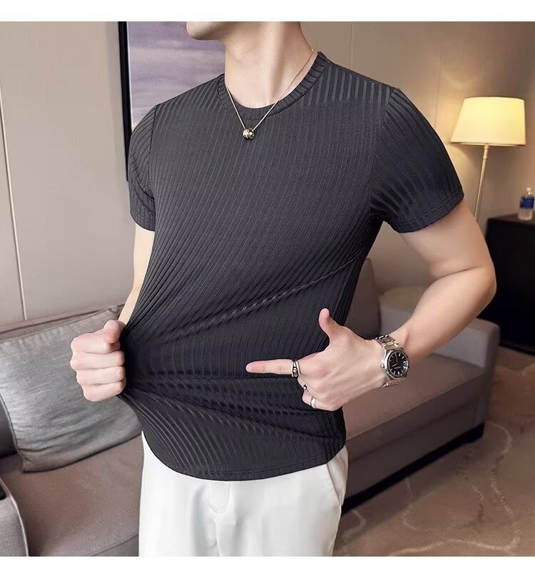 여름 남성 티셔츠 반팔 라운드 넥 캐주얼 슬림 스트라이프 스포츠 스트레치 근육 트렌드 트레이닝 피트니스 탑