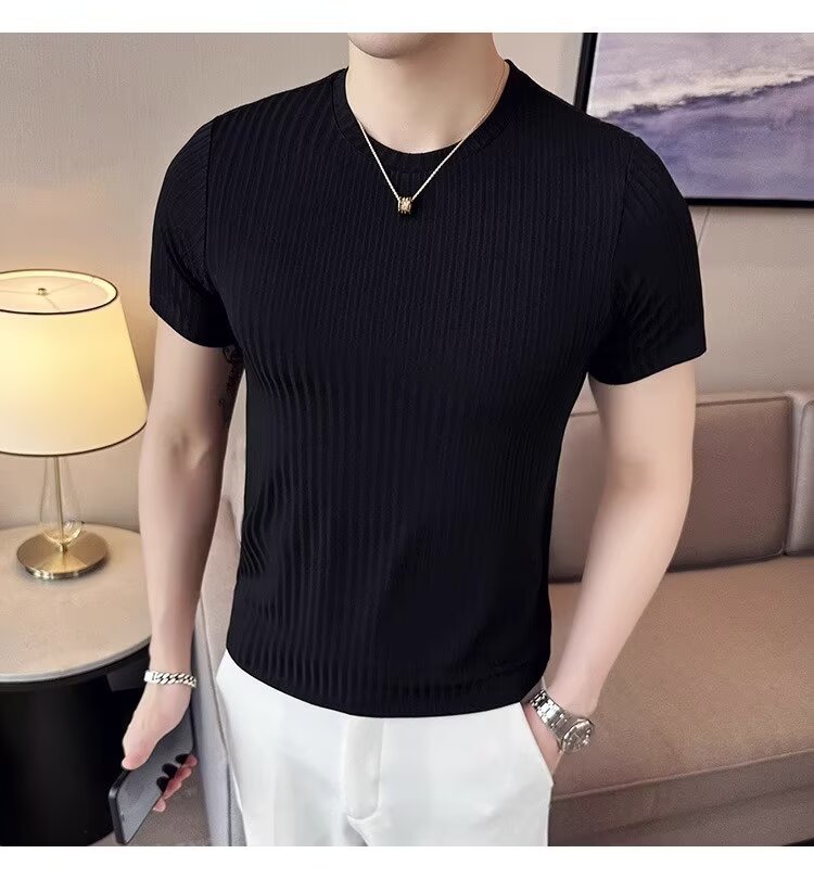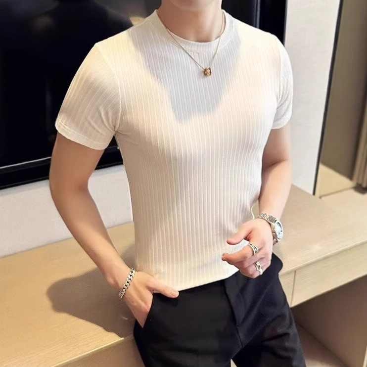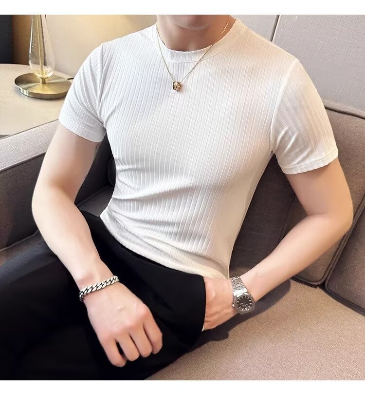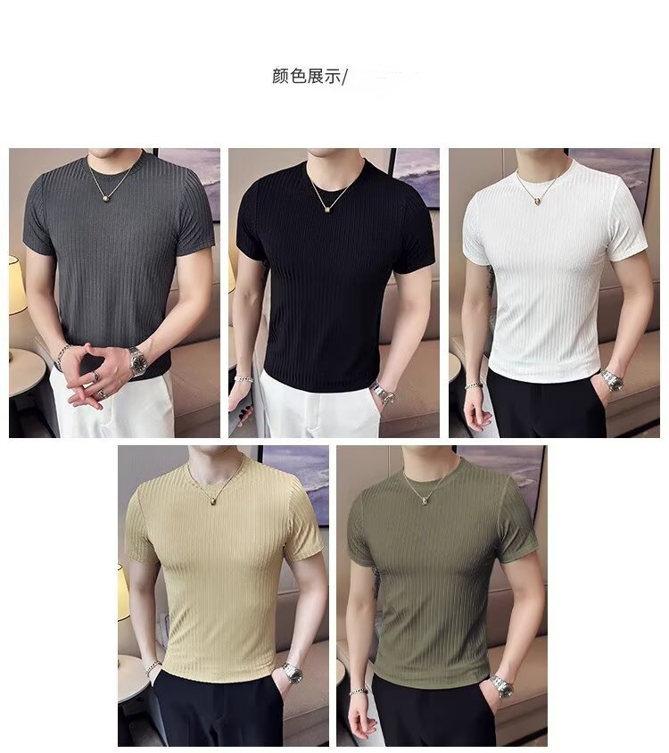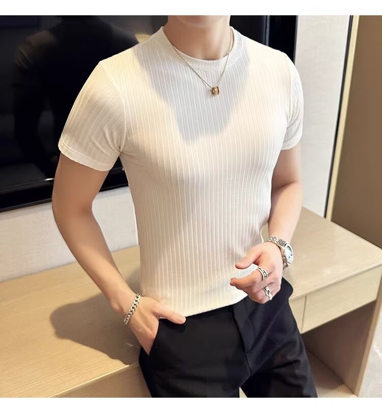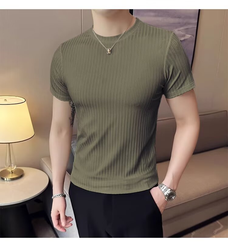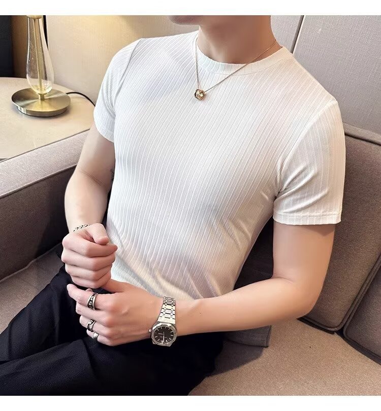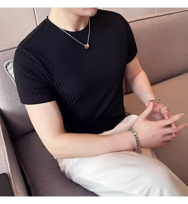 여름 남성 티셔츠 반팔 라운드 넥 캐주얼 슬림 스트라이프 스포츠 스트레치 근육 트렌드 트레이닝 피트니스 탑
