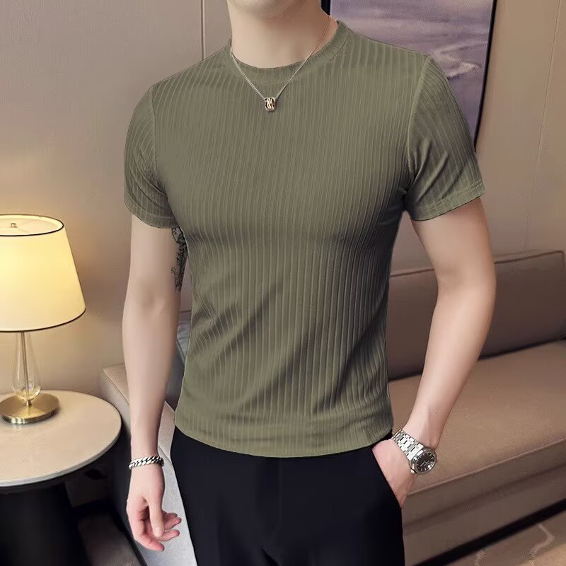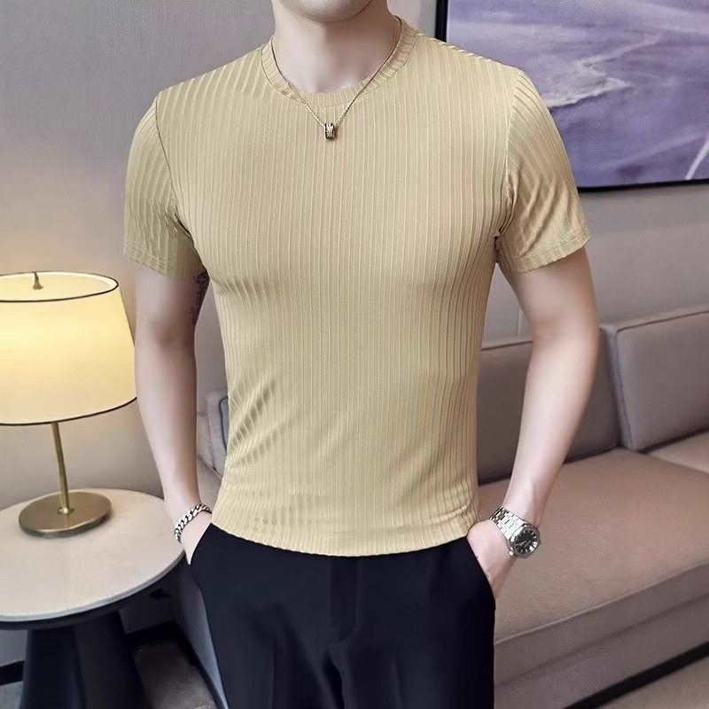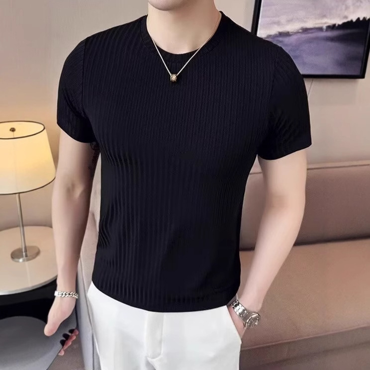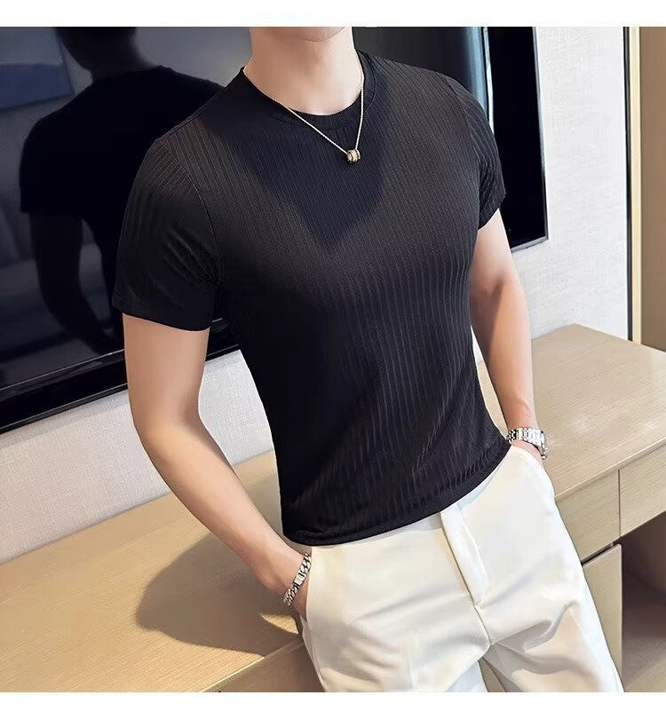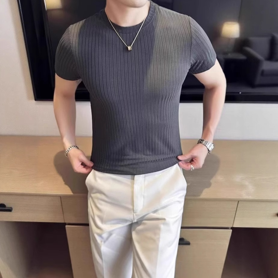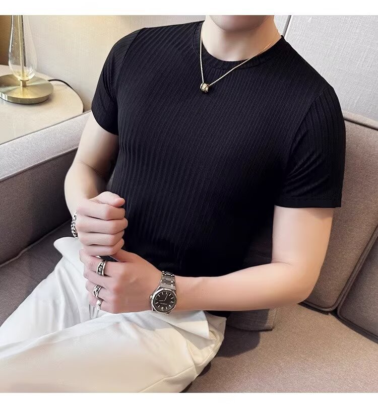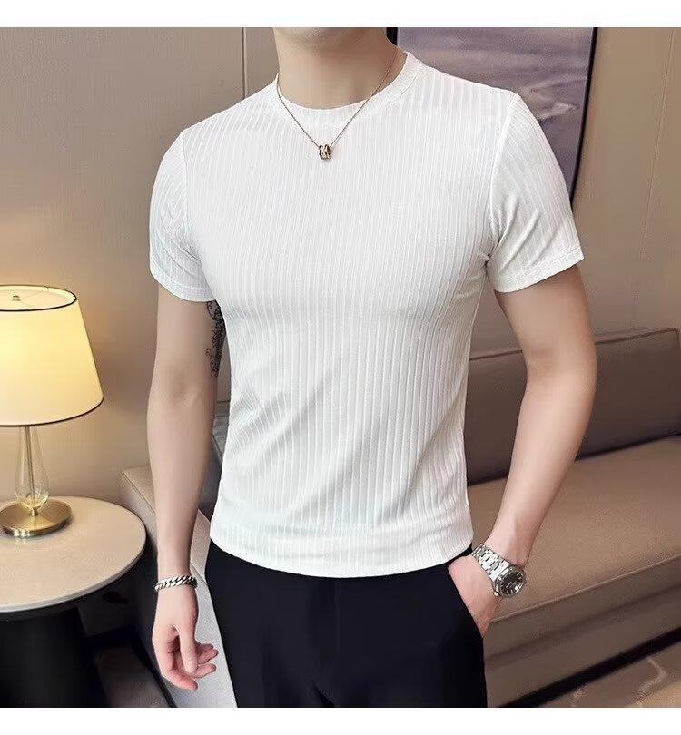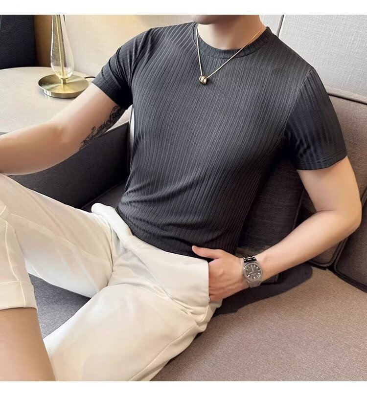 여름 남성 티셔츠 반팔 라운드 넥 캐주얼 슬림 스트라이프 스포츠 스트레치 근육 트렌드 트레이닝 피트니스 탑