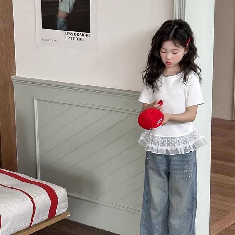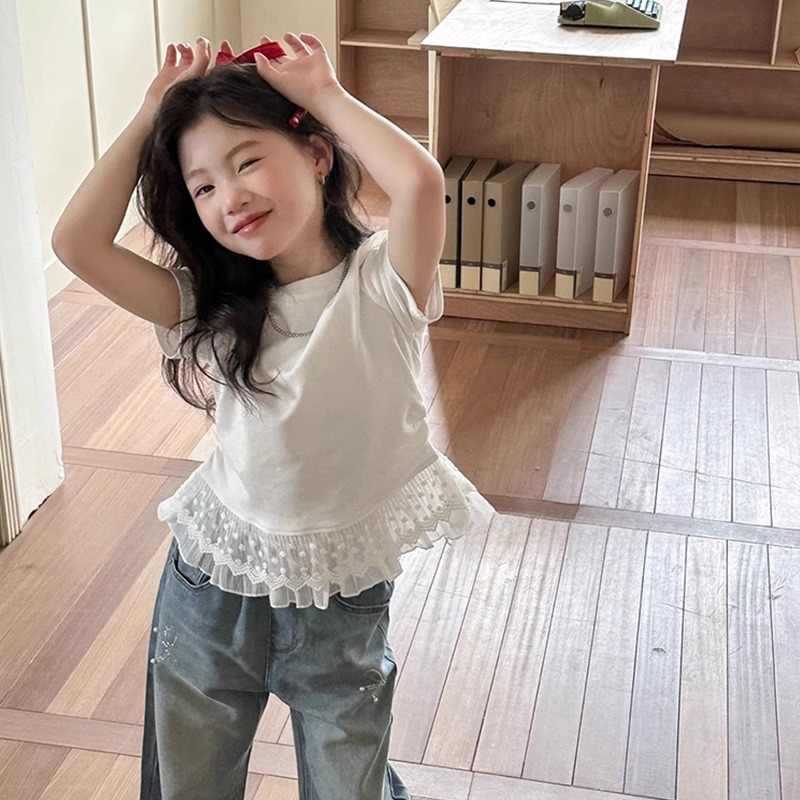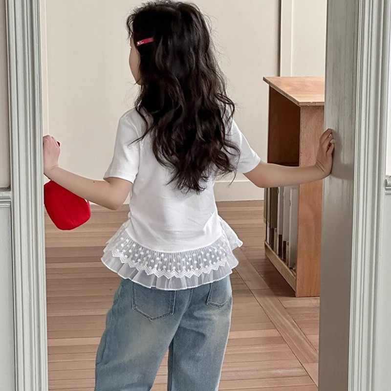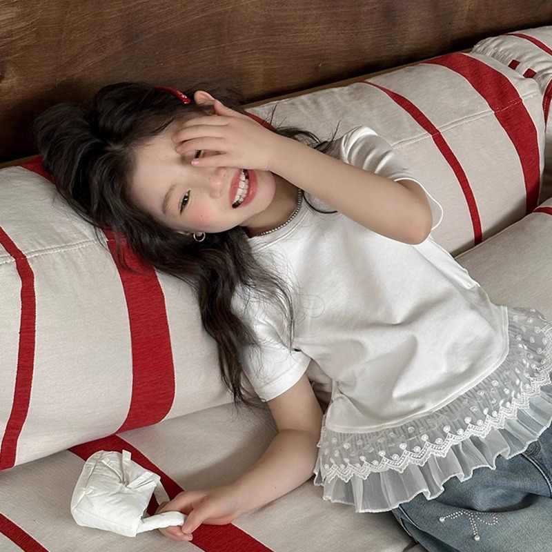 여름 소녀 레이스 반팔 티셔츠 여름 라운드 넥 탑 한국 트렌디 귀여운 레이어드 셔츠스토어 가기