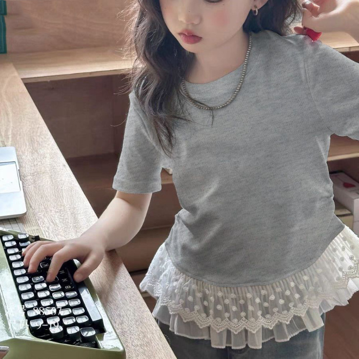 여름 소녀 레이스 반팔 티셔츠 여름 라운드 넥 탑 한국 트렌디 귀여운 레이어드 셔츠