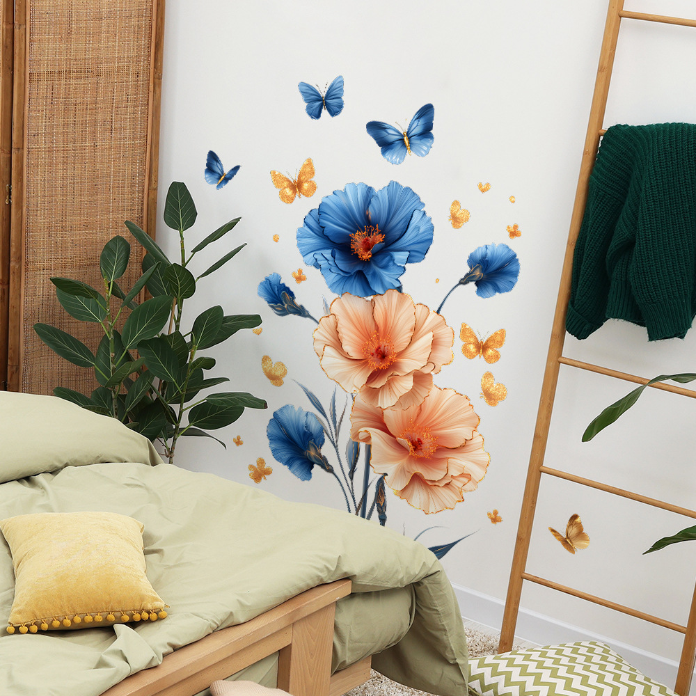 Fun-h28 그린 양귀비 꽃 나비 침실 거실 문 스티커 홈 미화 장식 벽 스티커 자체 접착