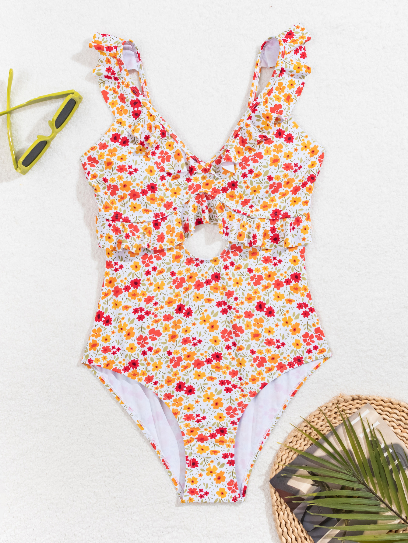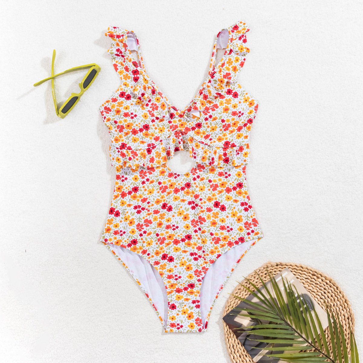 해외 창고 여성 신선한 작은 꽃 인쇄 고삐 주름 장식 비키니 수영복
