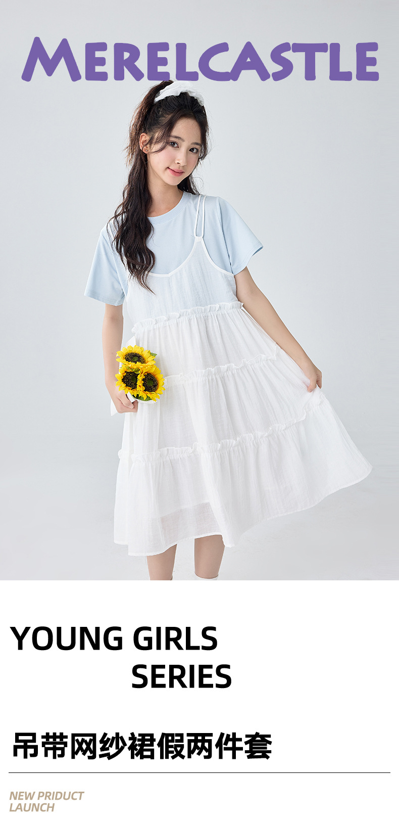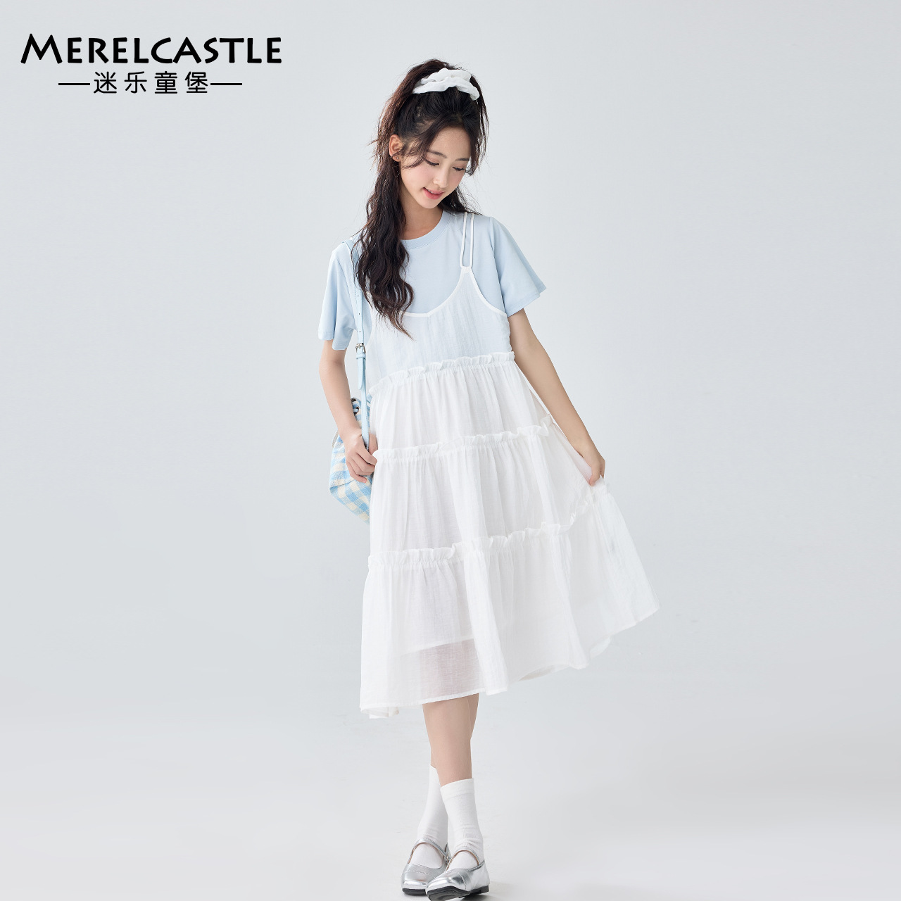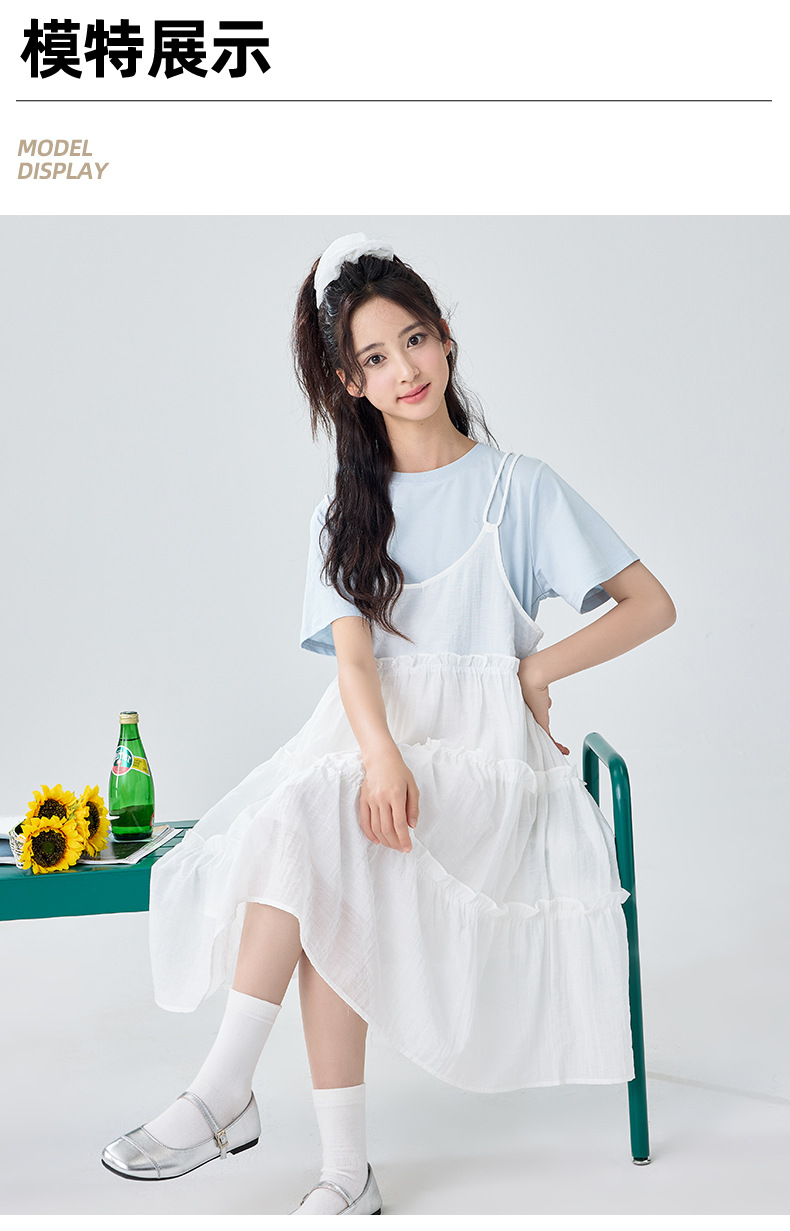 여아 드레스 여름 2025 새로운 스타일 중학생 여아 달콤한 한국 스타일 스커트 여아 가짜 투피스 서스펜더 스커트