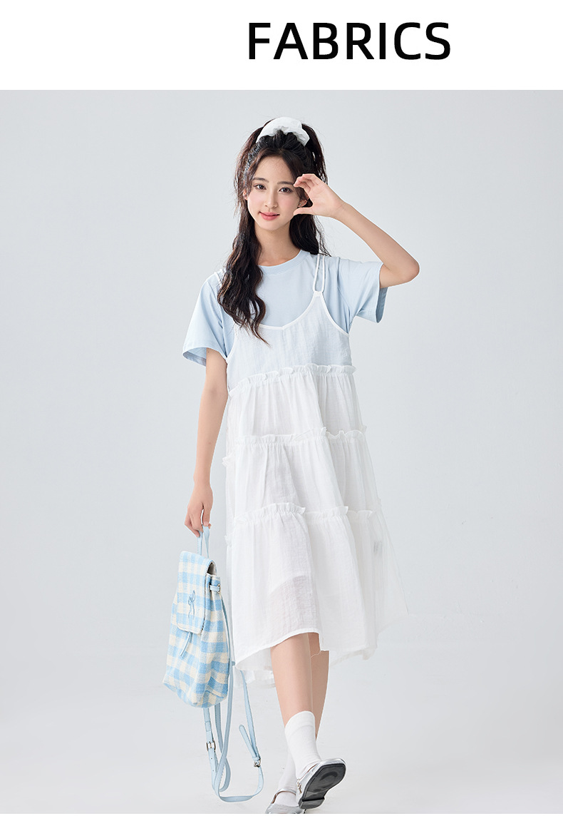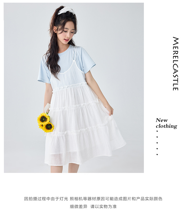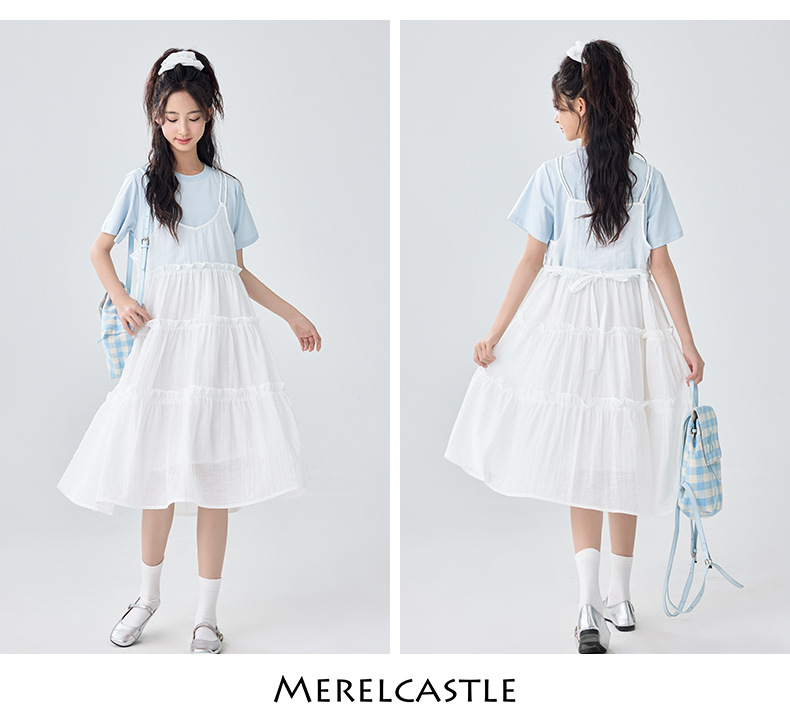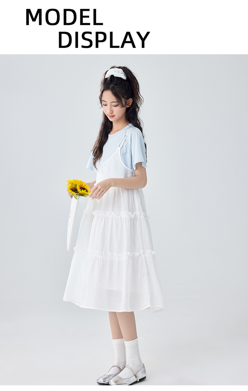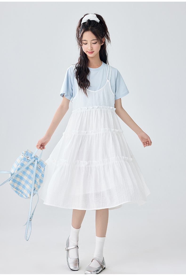 여아 드레스 여름 2025 새로운 스타일 중학생 여아 달콤한 한국 스타일 스커트 여아 가짜 투피스 서스펜더 스커트