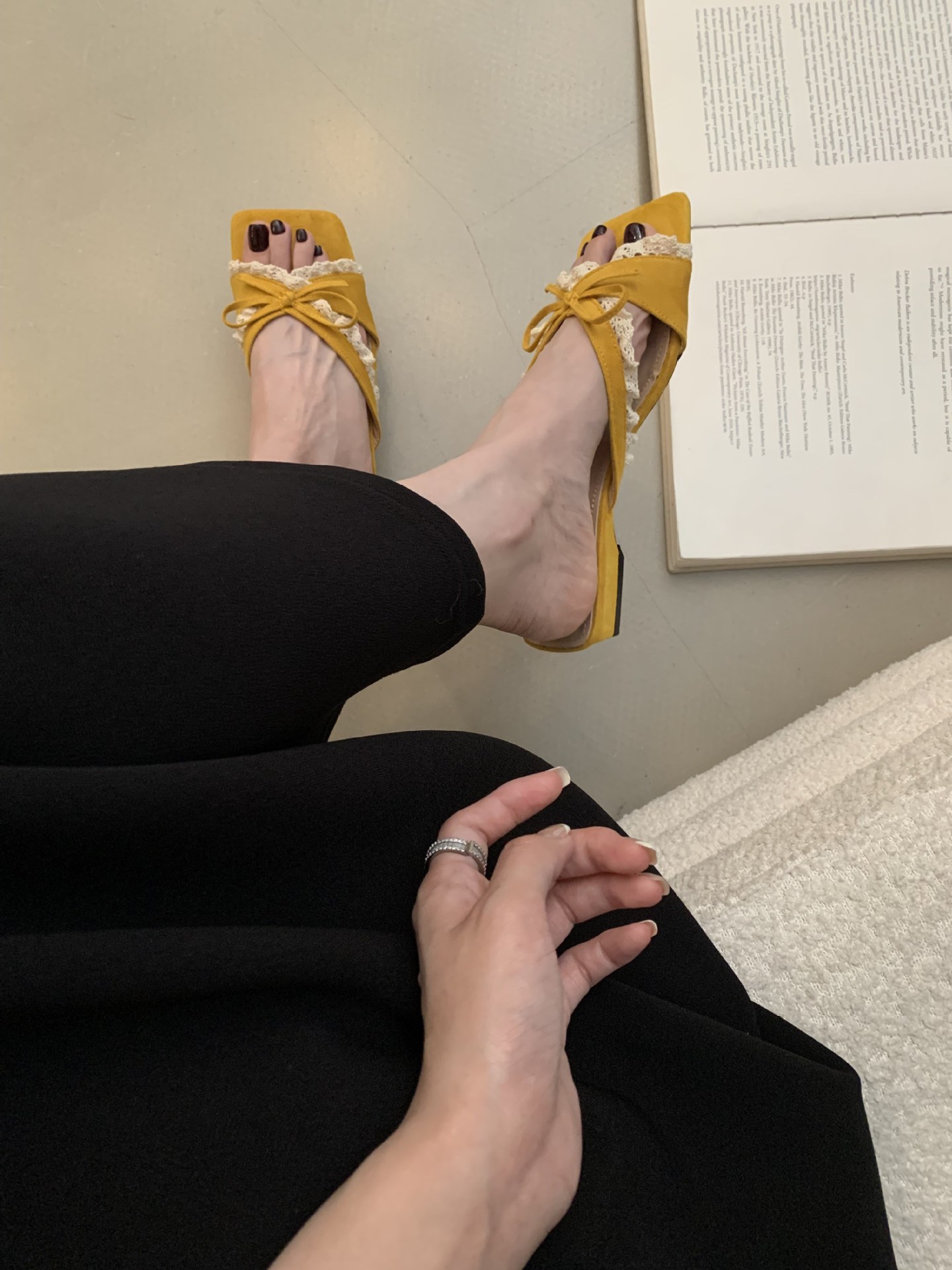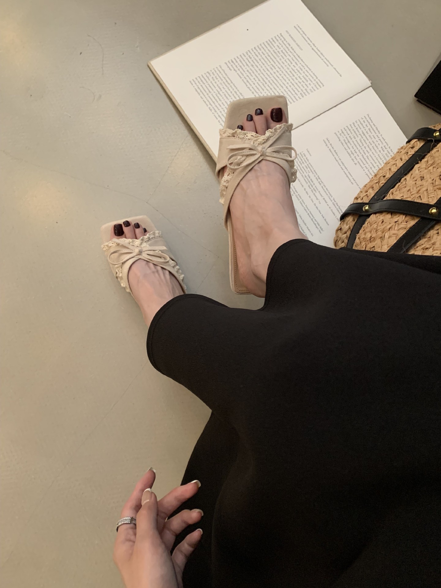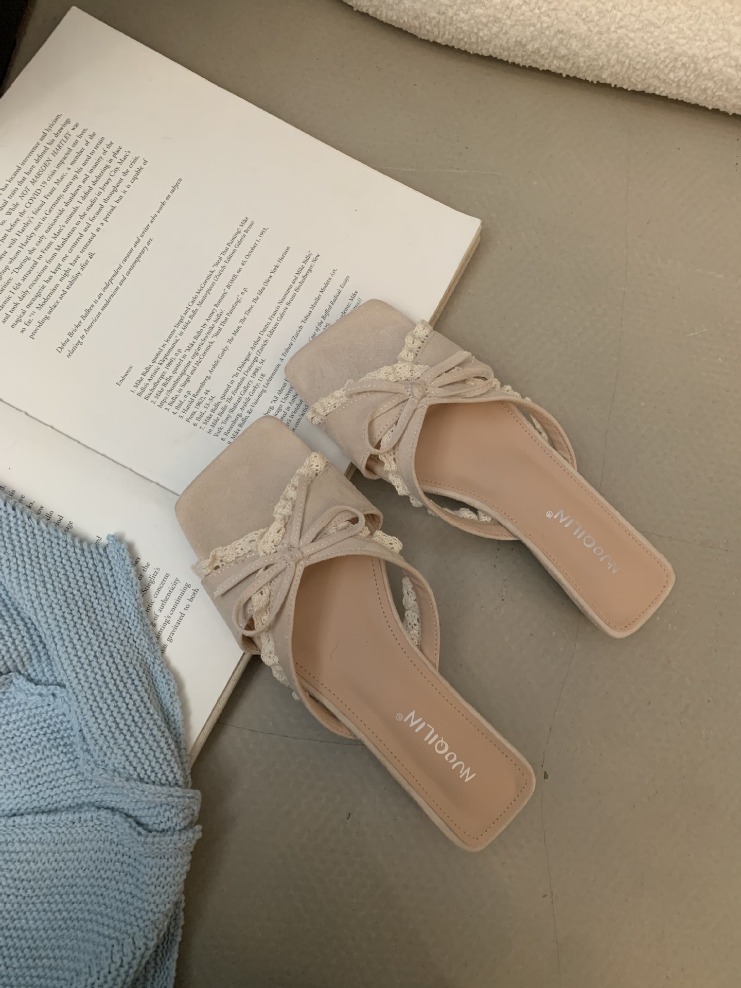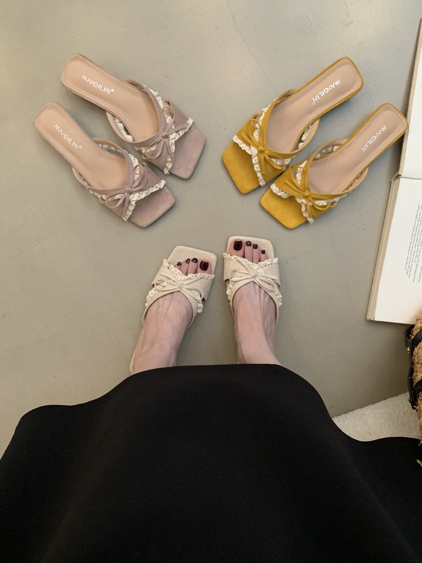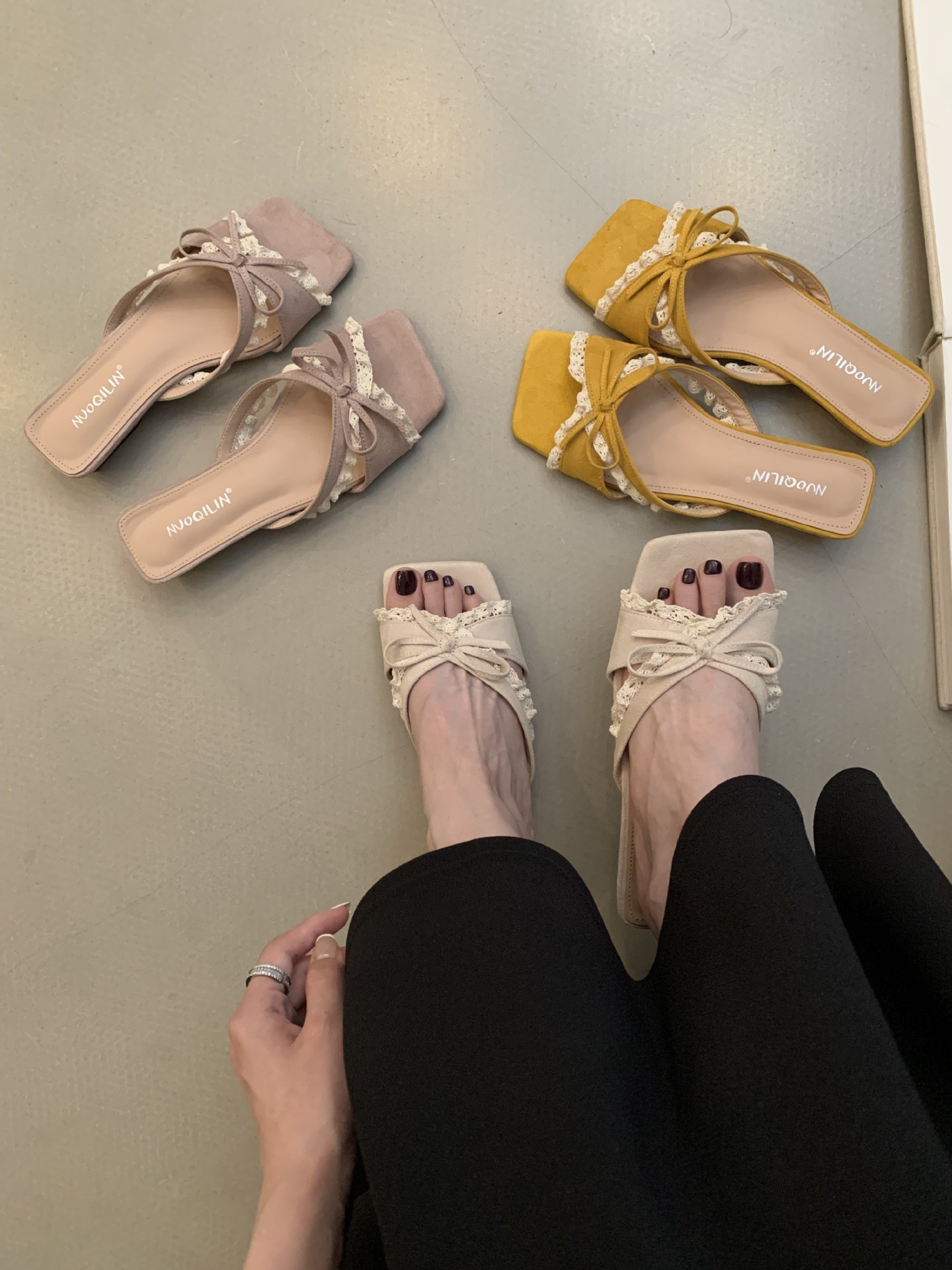 여성용 부드러운 요정 스타일 보우 레이스 오픈 토 슬리퍼, 스퀘어 토 로우 힐 샌들스토어 가기