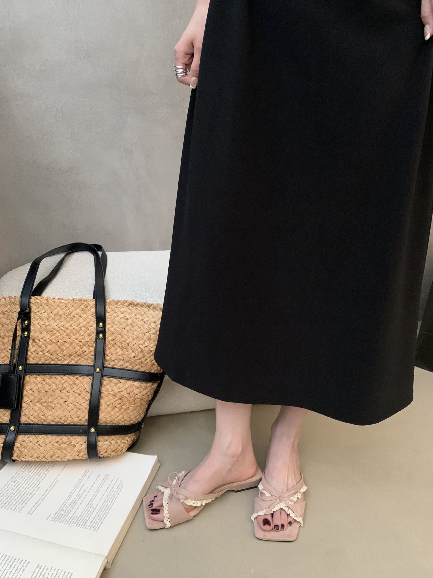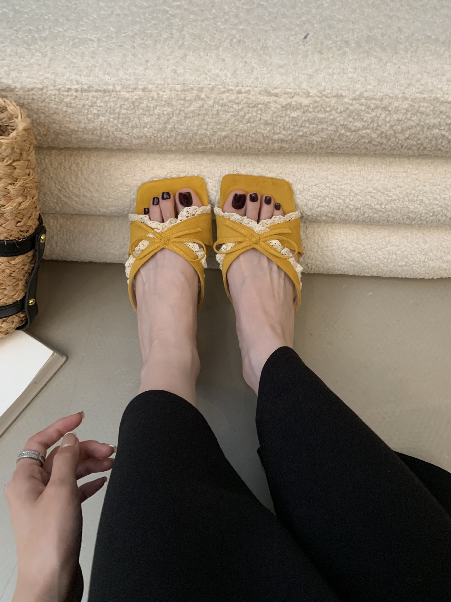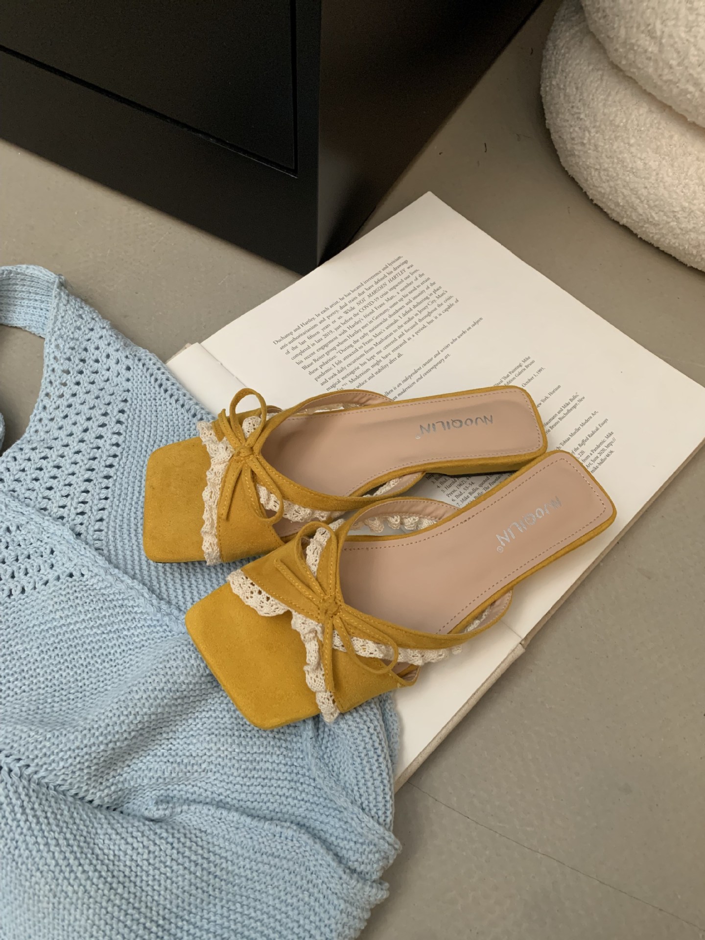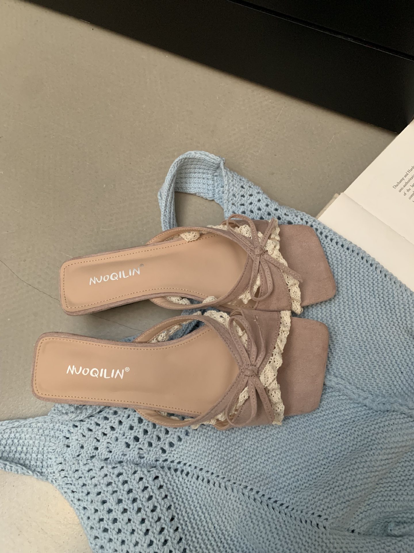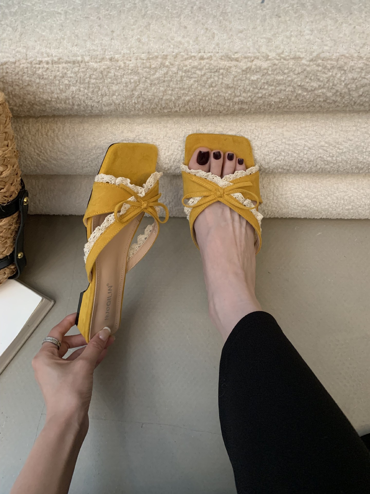 여성용 부드러운 요정 스타일 보우 레이스 오픈 토 슬리퍼, 스퀘어 토 로우 힐 샌들스토어 가기