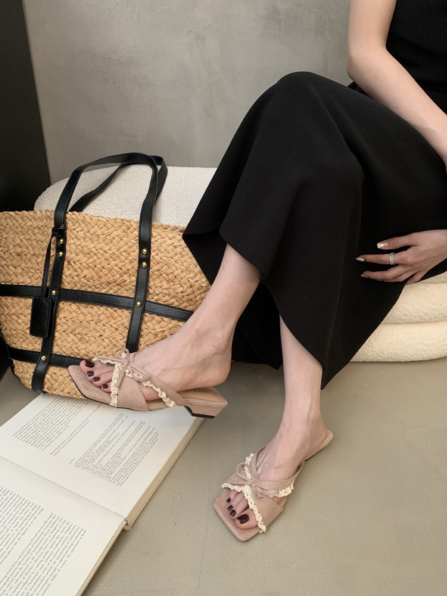 여성용 부드러운 요정 스타일 보우 레이스 오픈 토 슬리퍼, 스퀘어 토 로우 힐 샌들