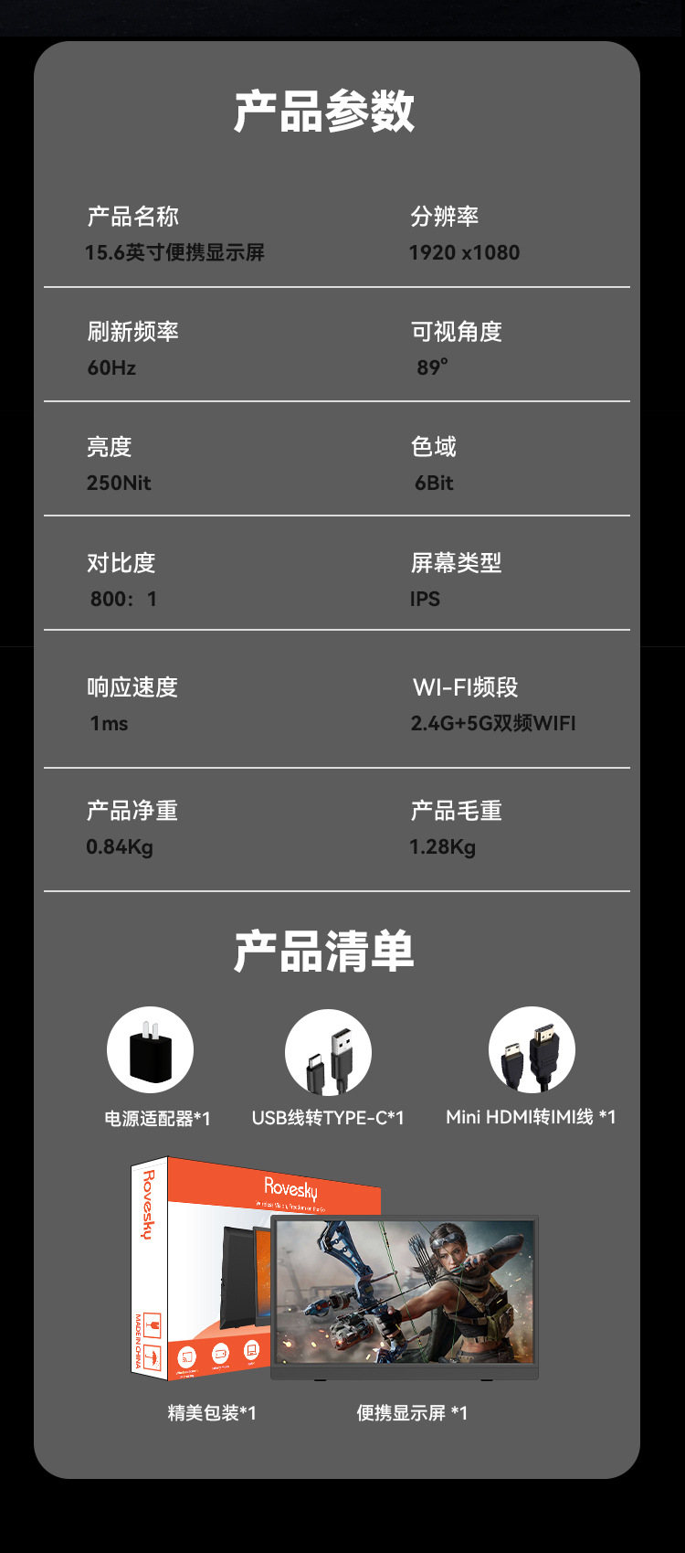 Rovesky 무선 휴대용 디스플레이 15.6 인치 휴대용 화면 휴대 전화 게임 ps5/스위치 확장 화면