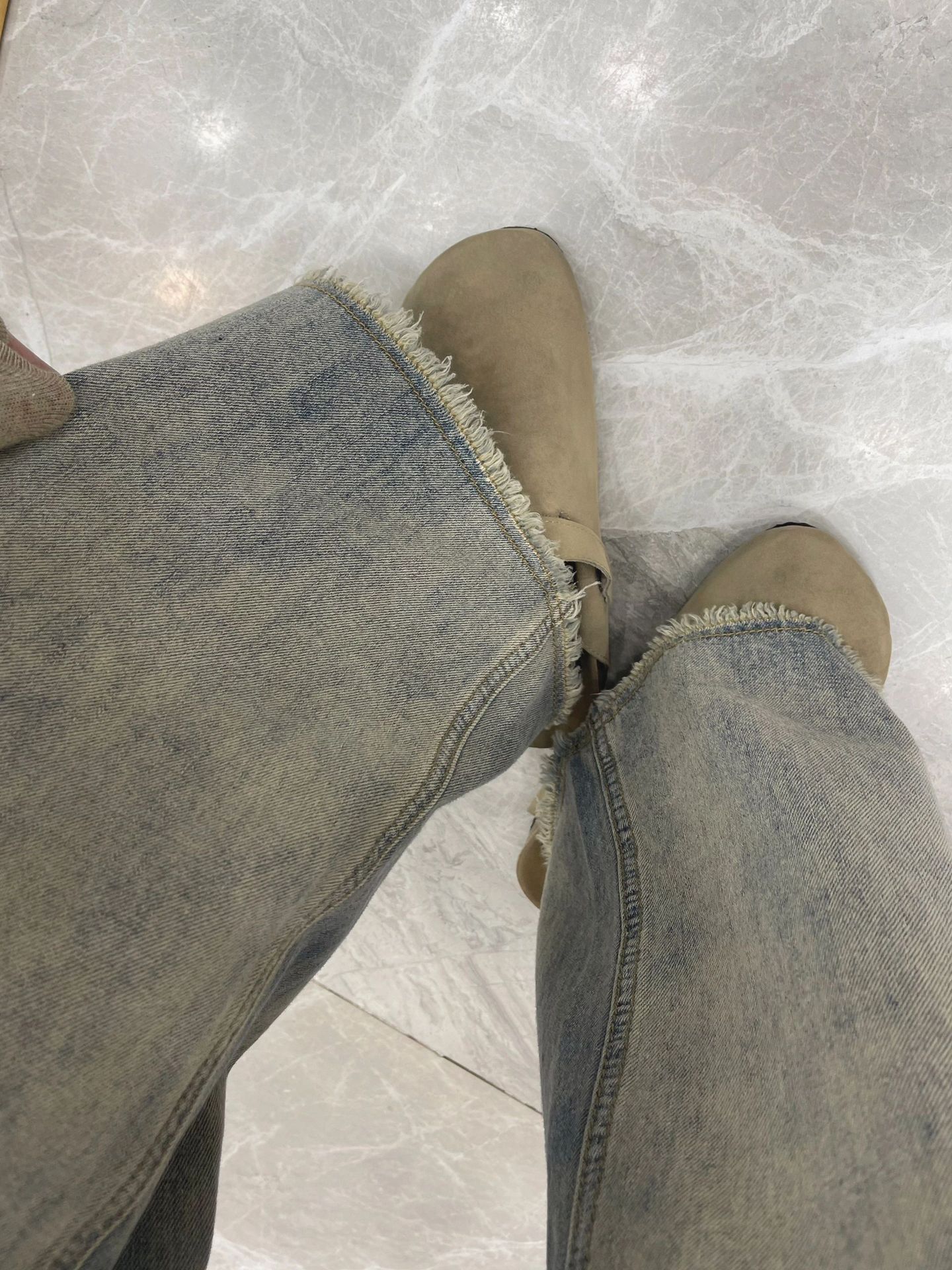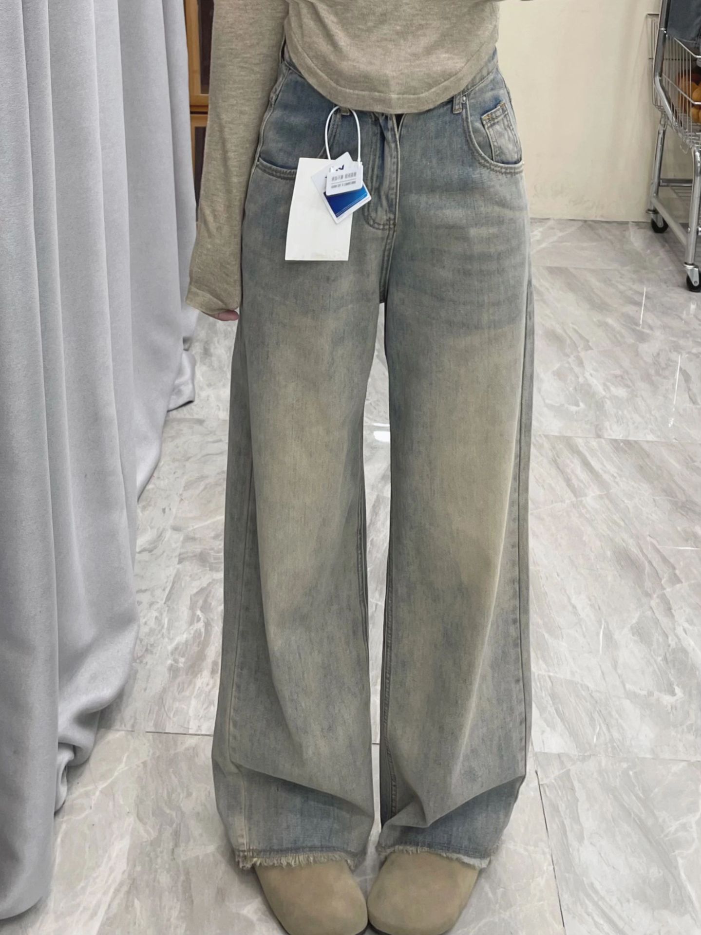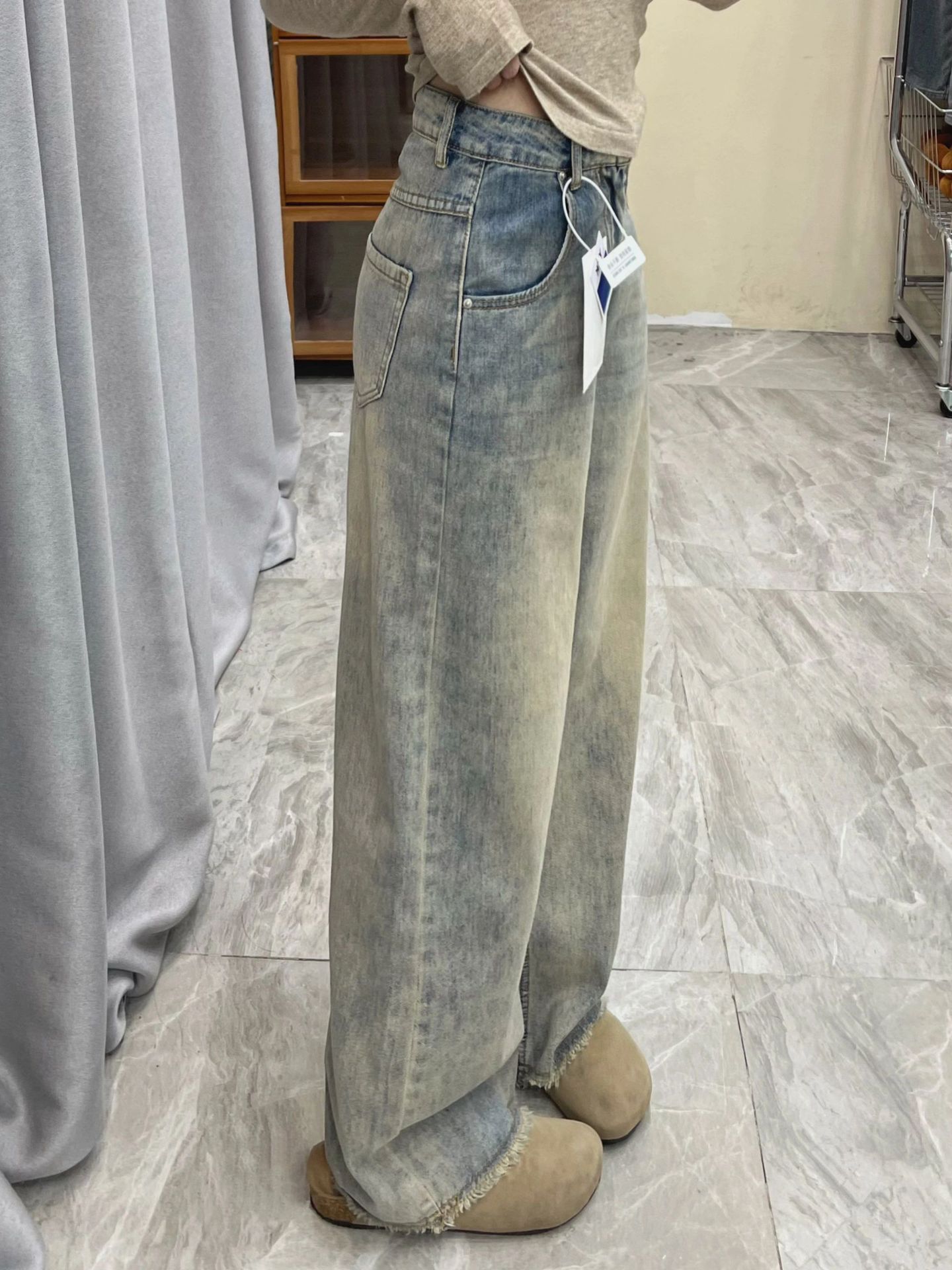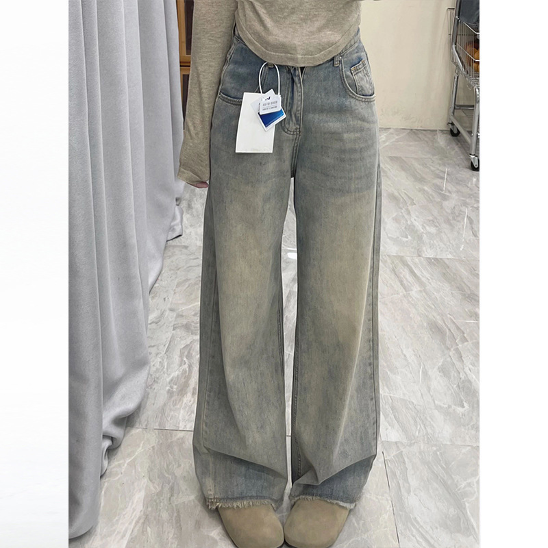 여성용 스트레이트 와이드 레그 청바지 봄 신상 하이웨이스트 루즈 드레이프 로우 엣지 틈새 디자인 스트레이트 레그 바닥 길이스토어 가기