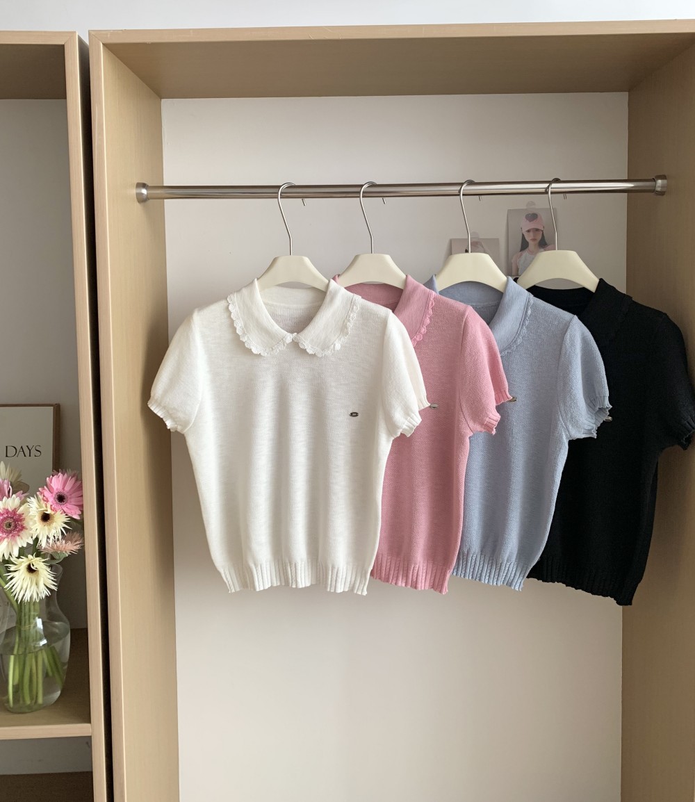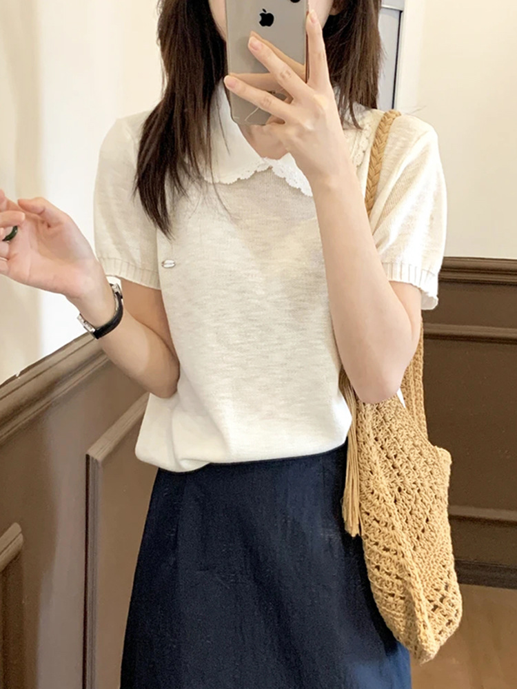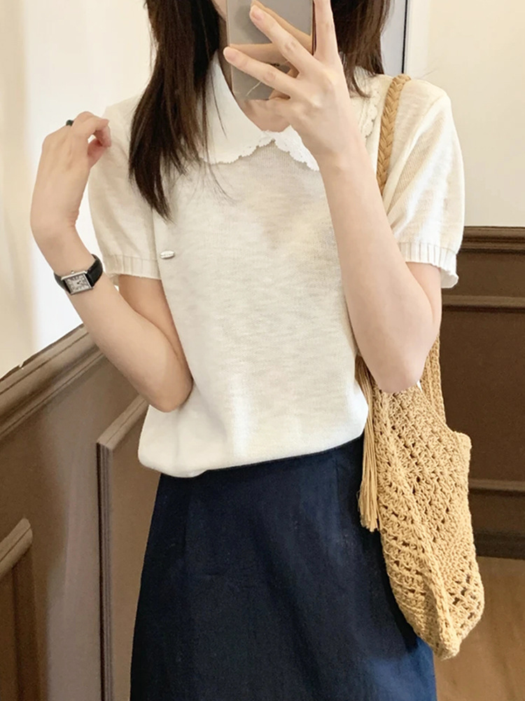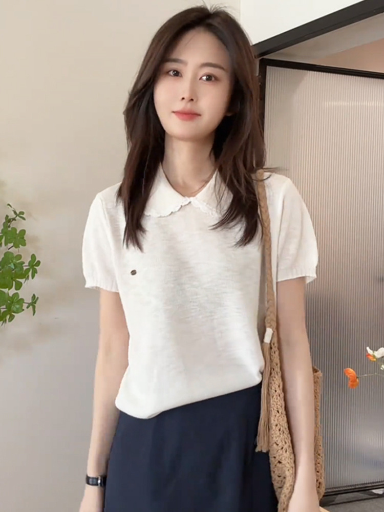여성을위한 작은 신선한 한국 인형 칼라 반팔 티셔츠 2025 여름 새로운 달콤한 연령 감소 기질 스웨터 탑스토어 가기