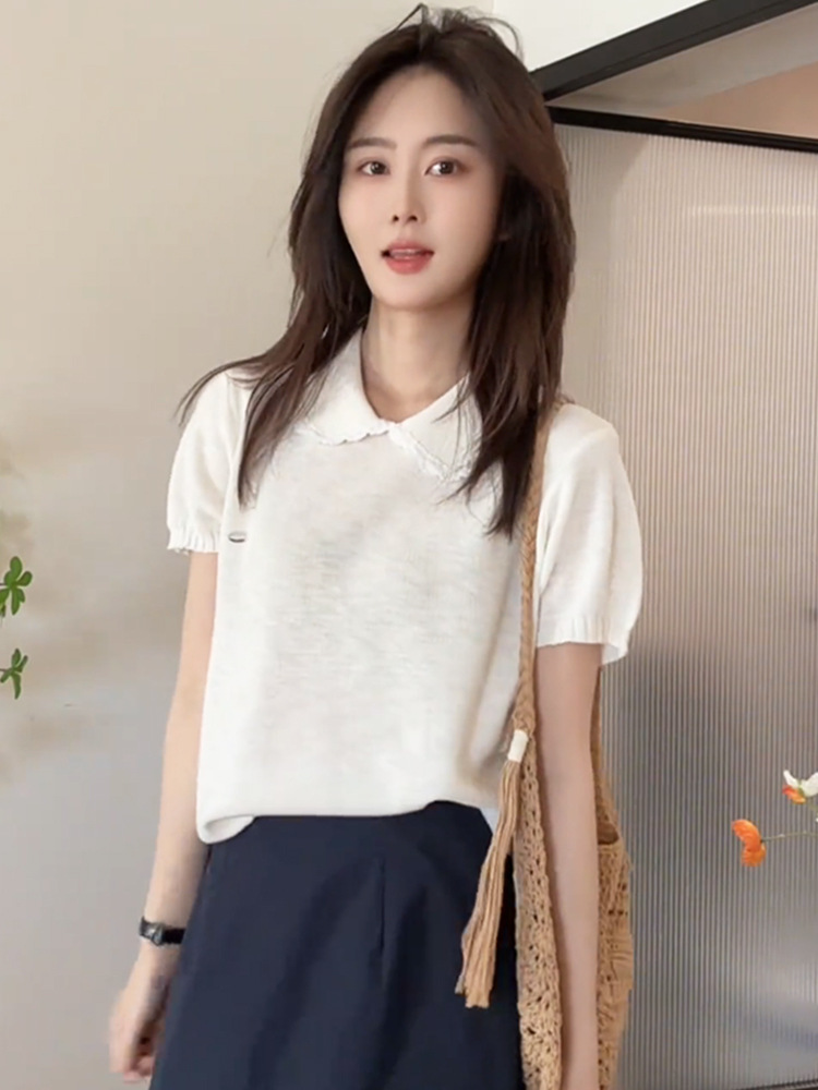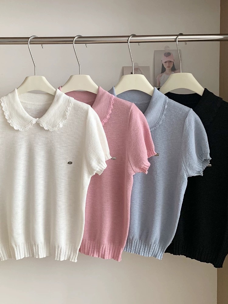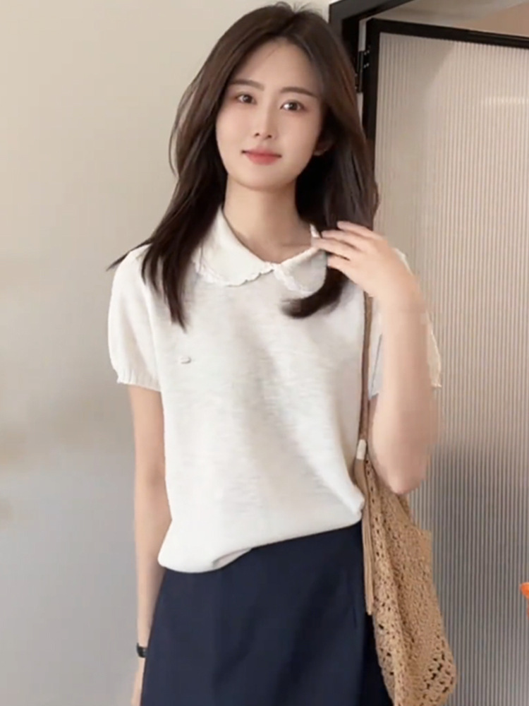여성을위한 작은 신선한 한국 인형 칼라 반팔 티셔츠 2025 여름 새로운 달콤한 연령 감소 기질 스웨터 탑