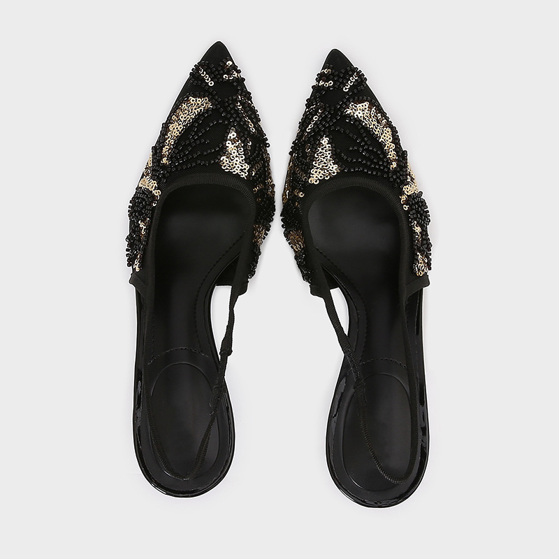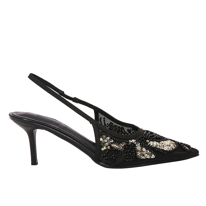 ZA2025 여름 새로운 여성 신발 검은 구슬 메쉬가 뾰족한 하이힐 뮬러 신발 얕은 입 패션 샌들