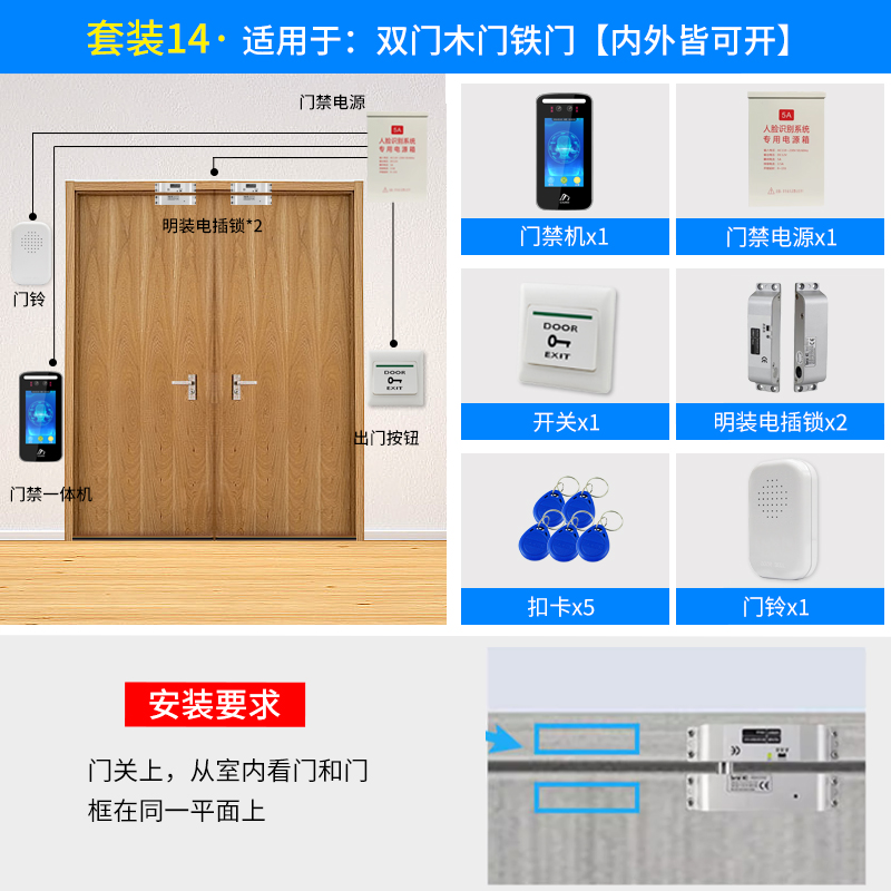 • HX-F7 페이스 액세스 제어 세트 No. 14-이중 나무 문/철 문 + 노출된 전기 볼트 잠금 장치