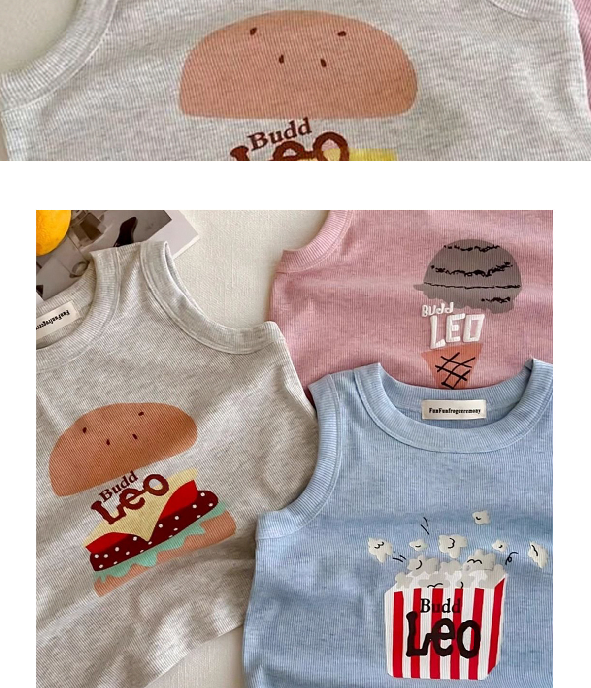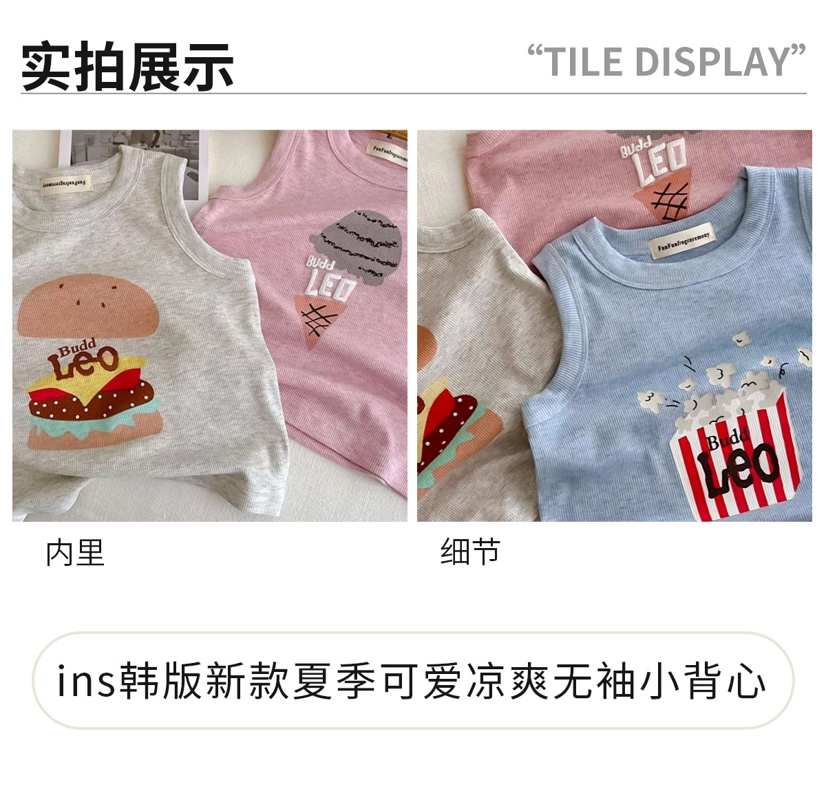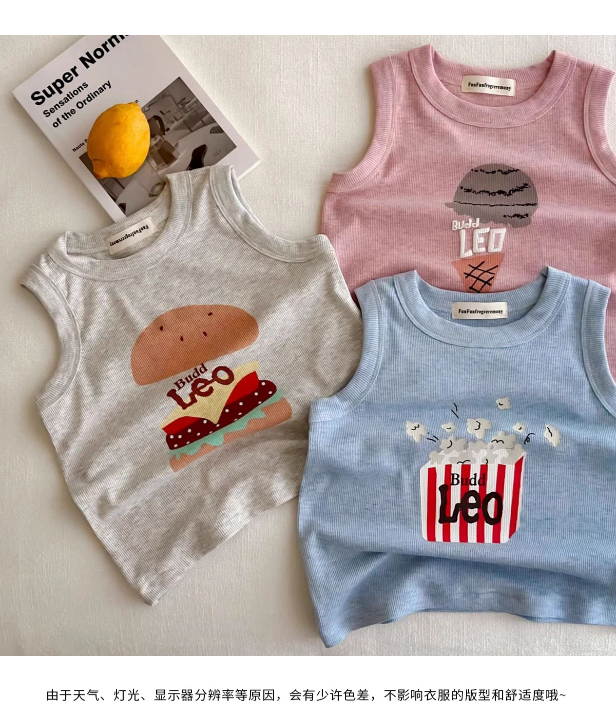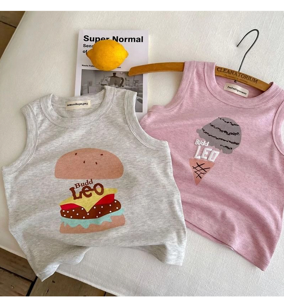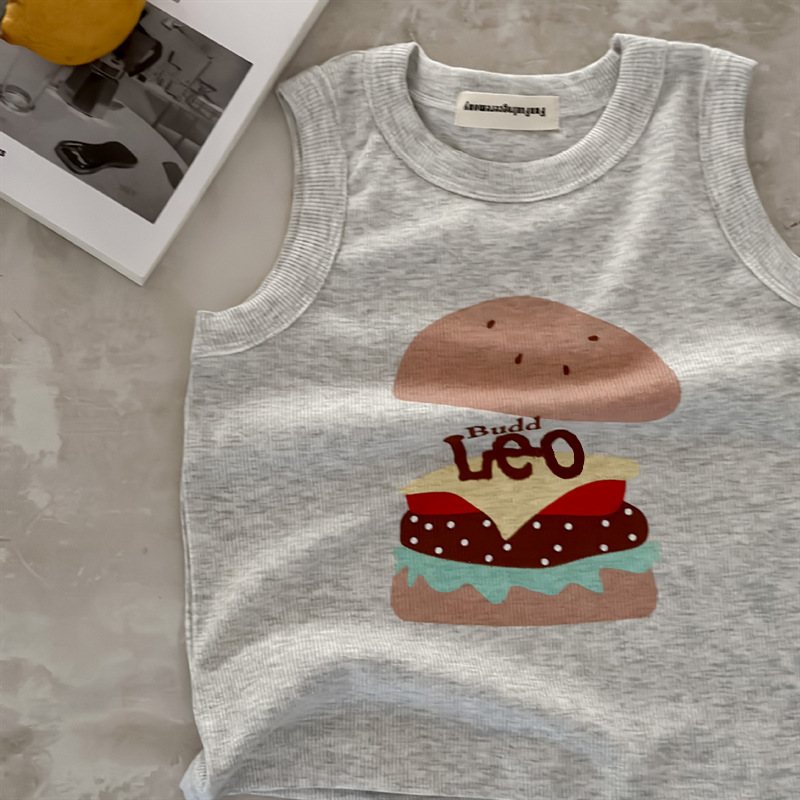 2025 여름 반팔 아동복 일본 티셔츠 아기 민소매 조끼 만화 버거 프린트 귀여운 다용도 조끼스토어 가기
