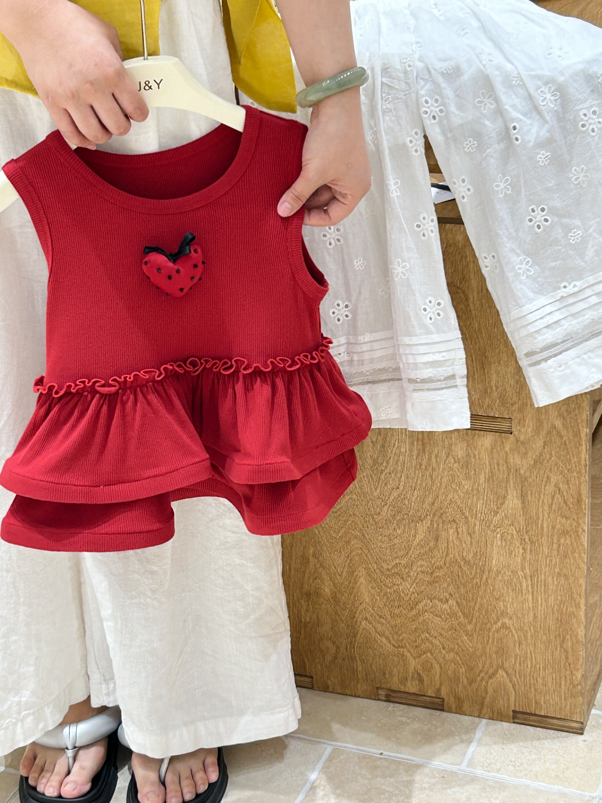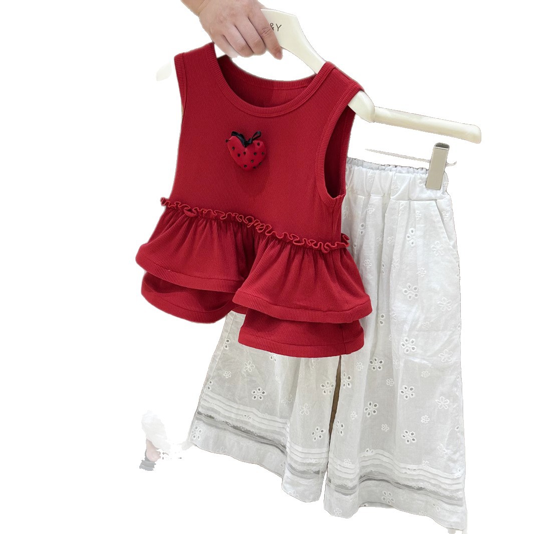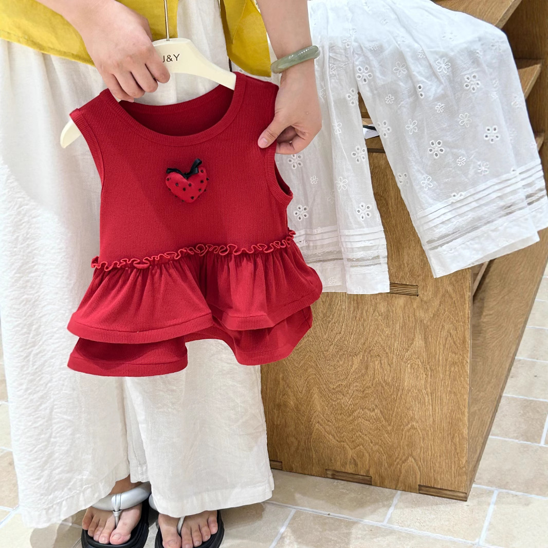소녀 달콤하고 사랑스러운 민소매 조끼 여름 새로운 도착 2025 소녀 유행 웨스턴 스타일 귀 테두리 티셔츠 탑