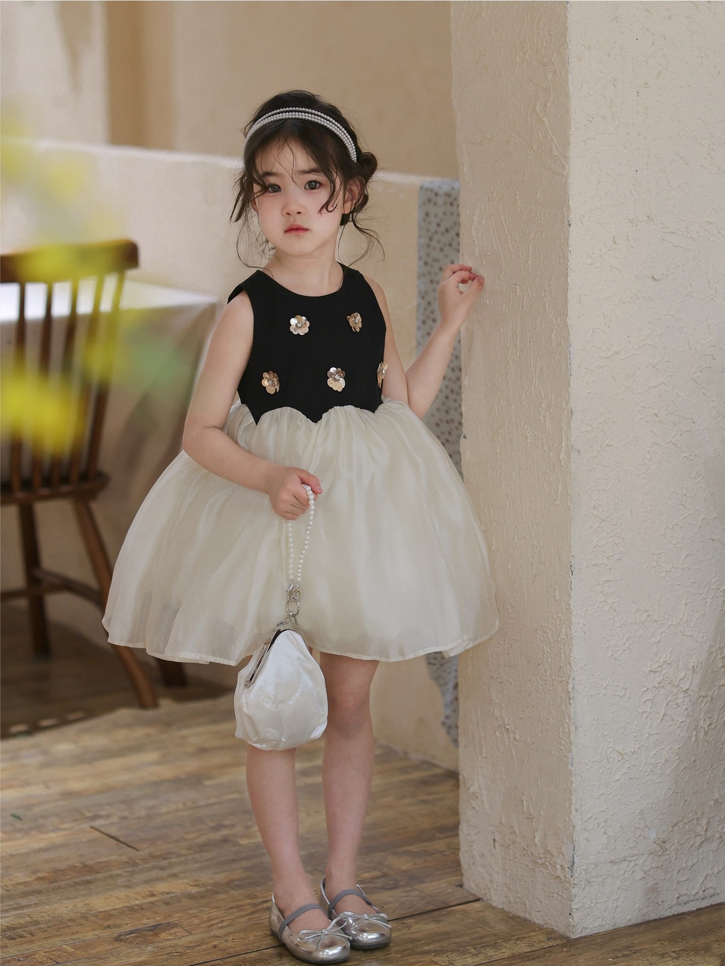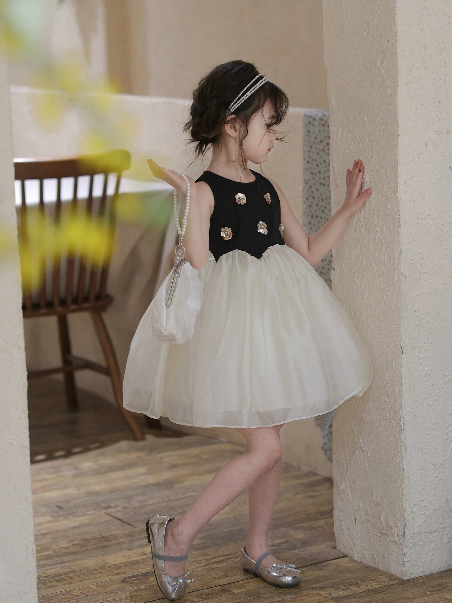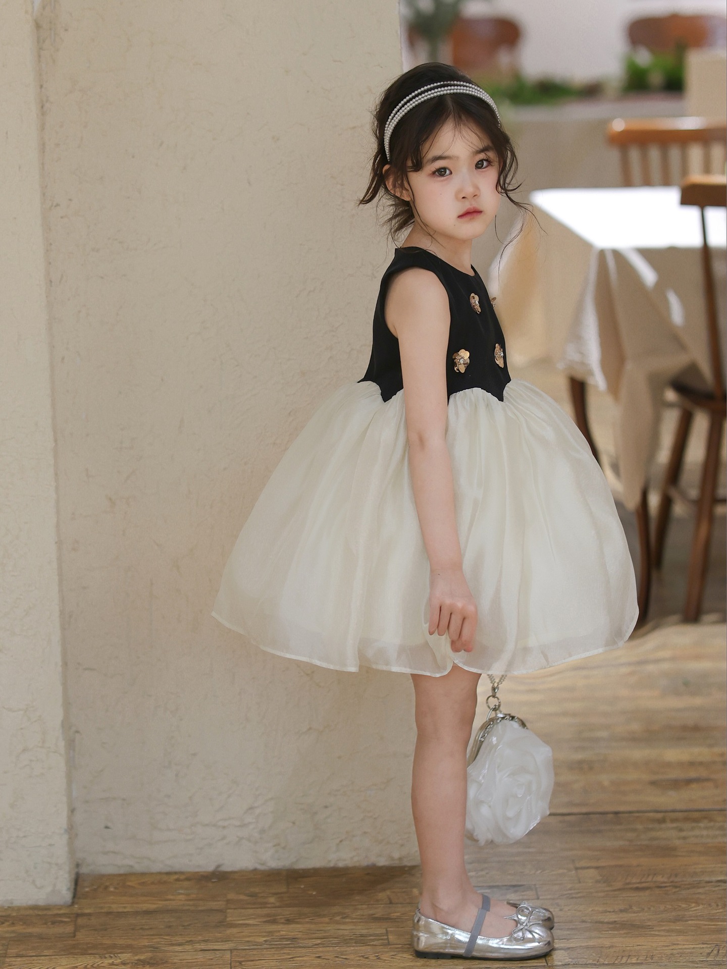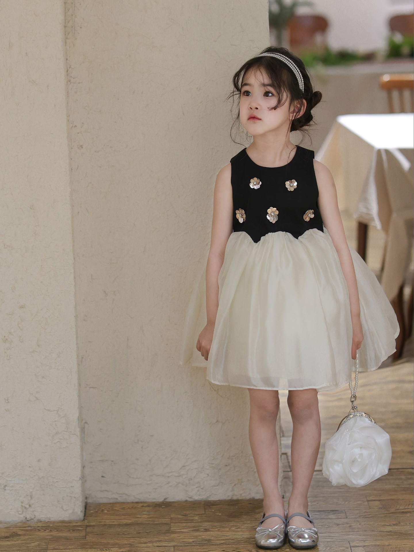 여자 드레스 여름 2025 새로운 유행 꽃 민소매 검은 조끼 드레스 공주 어린이 스커트