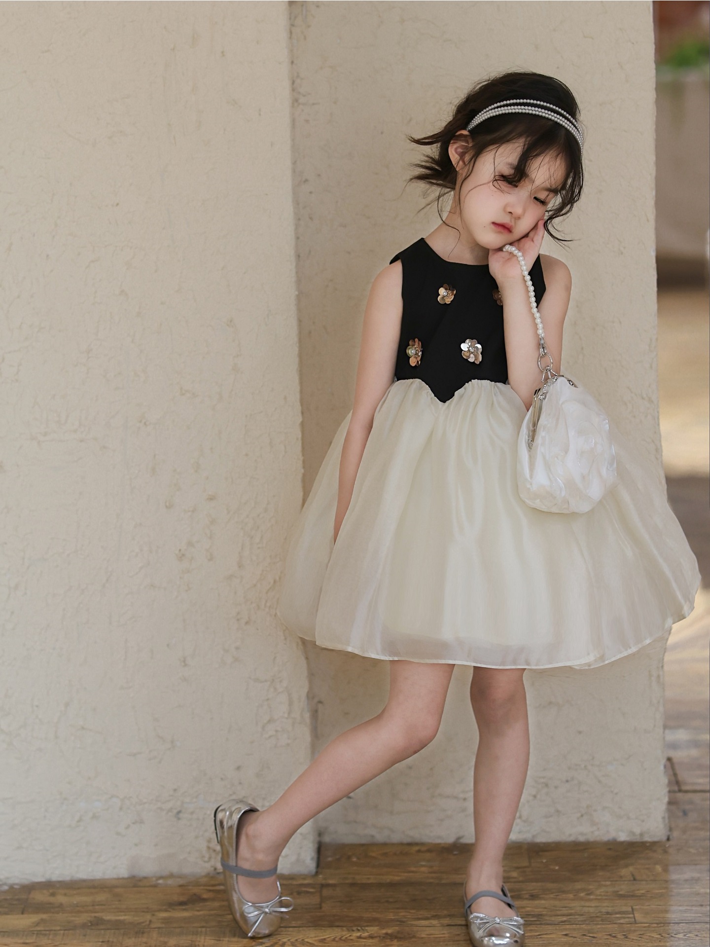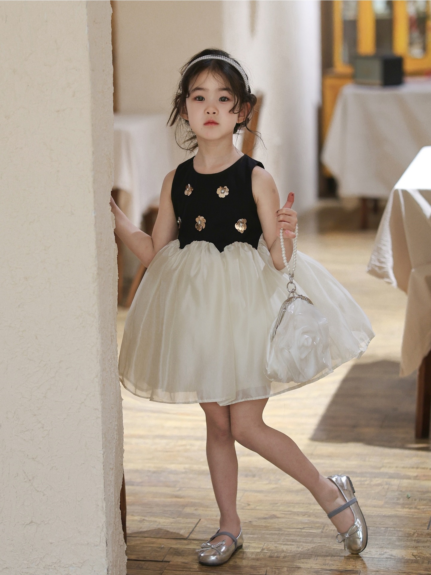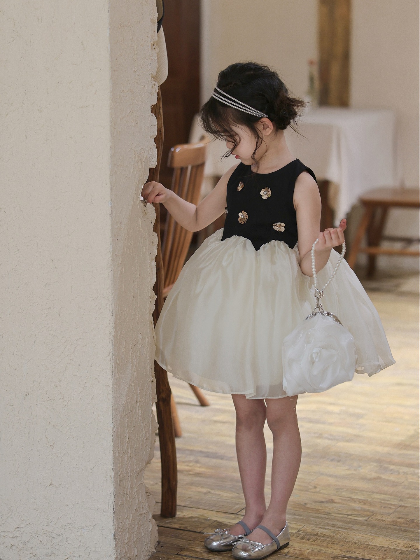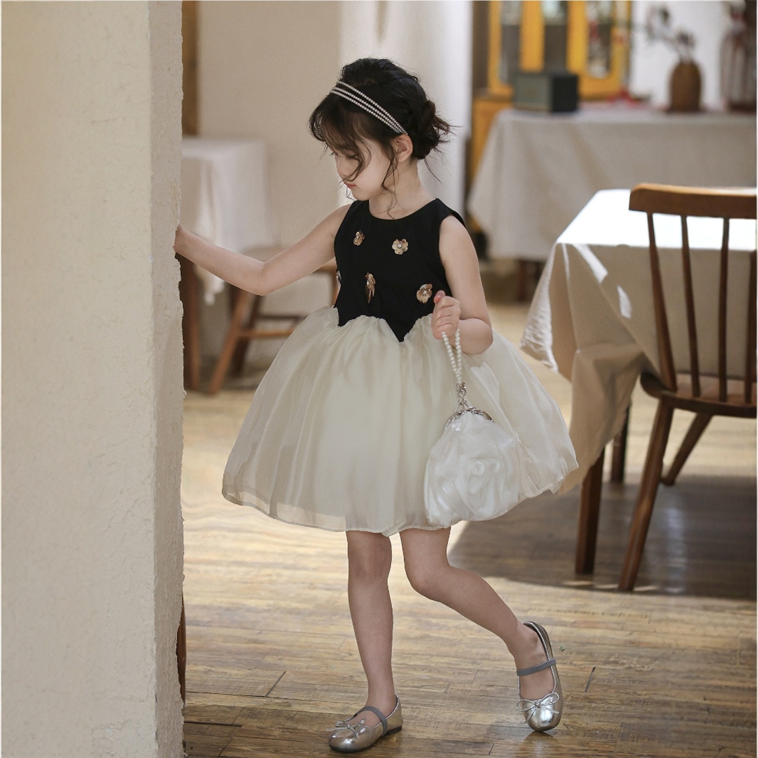 여자 드레스 여름 2025 새로운 유행 꽃 민소매 검은 조끼 드레스 공주 어린이 스커트