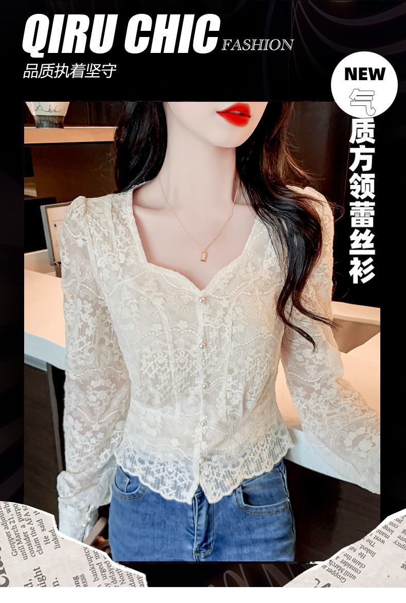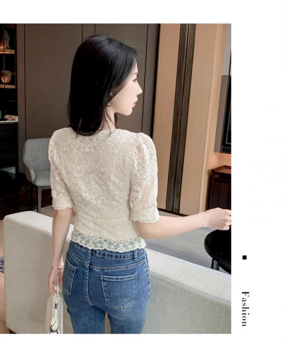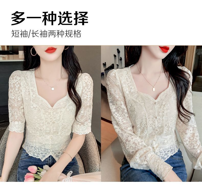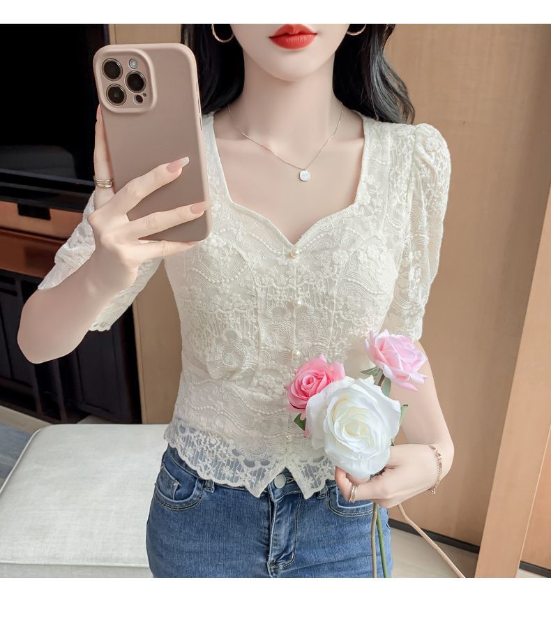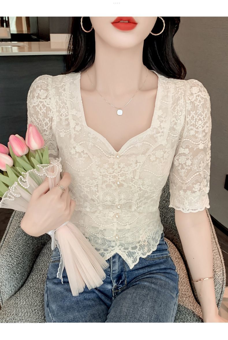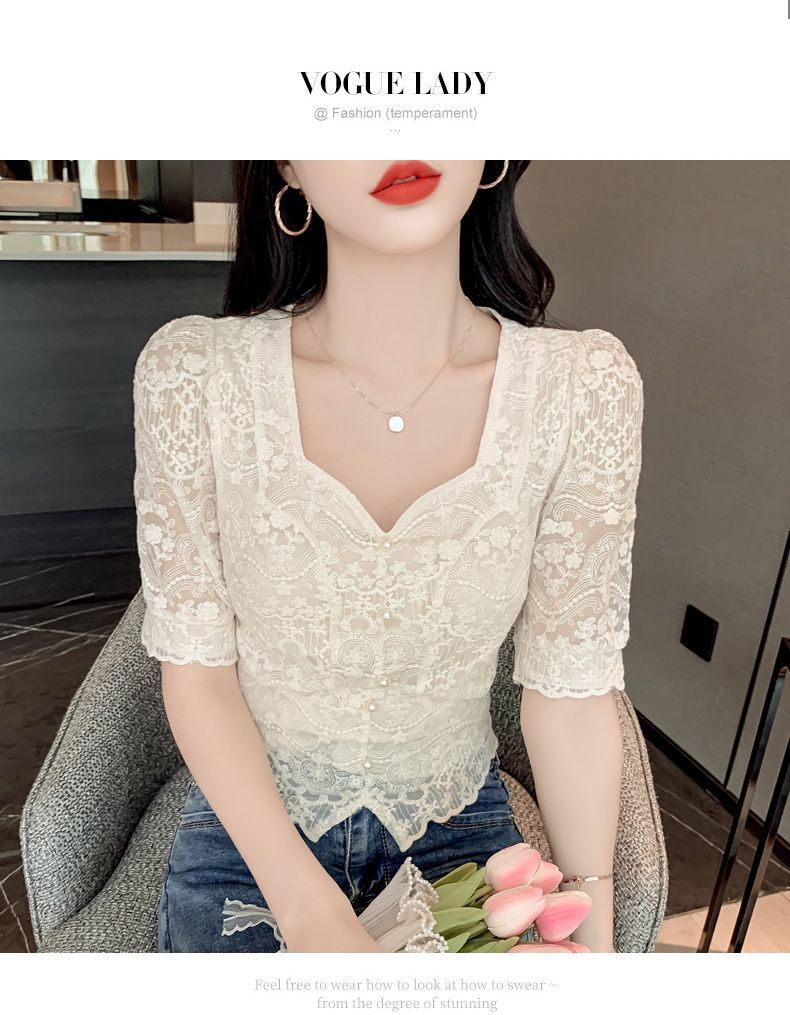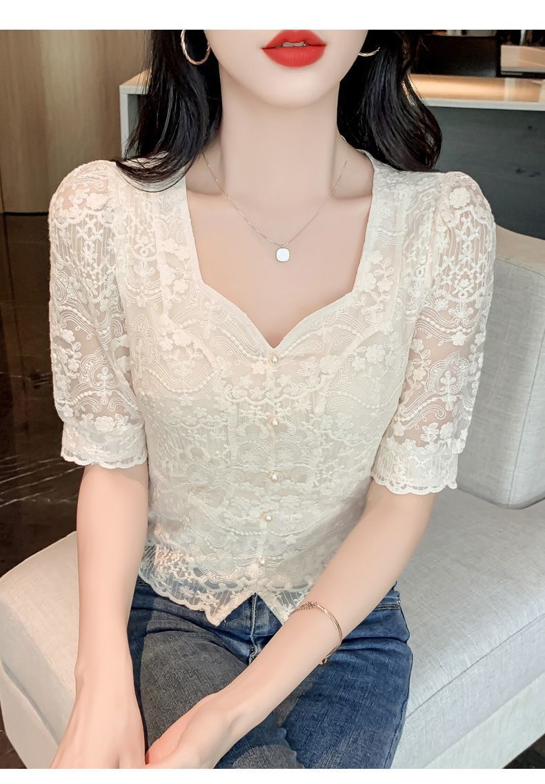 여성을위한 프렌치 스퀘어 넥 레이스 셔츠 여름 새로운 기질 반팔 셔츠 짧은 쉬폰 플러스 사이즈 여성상의스토어 가기